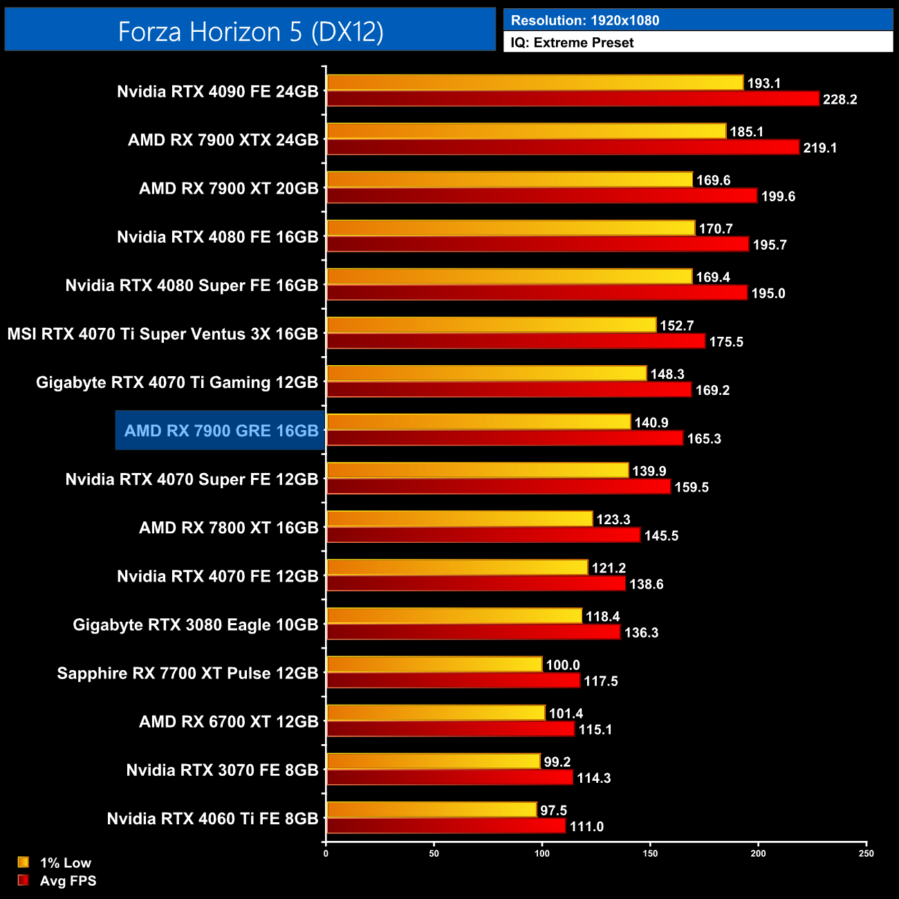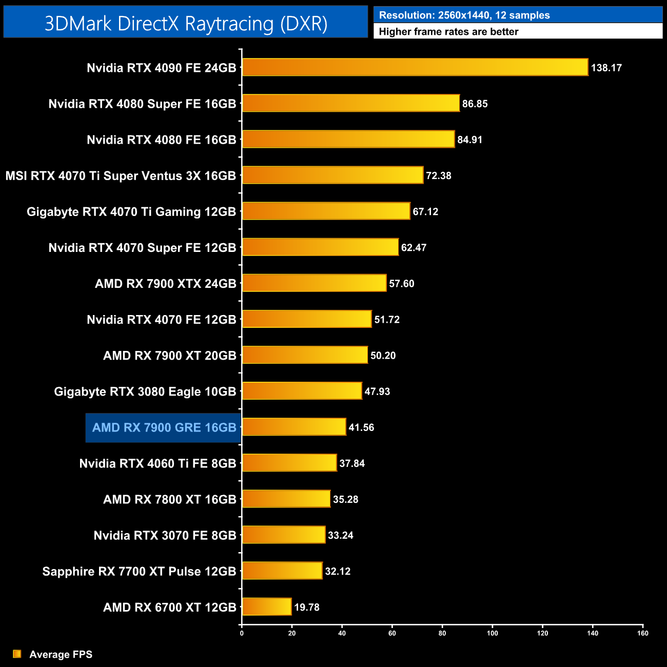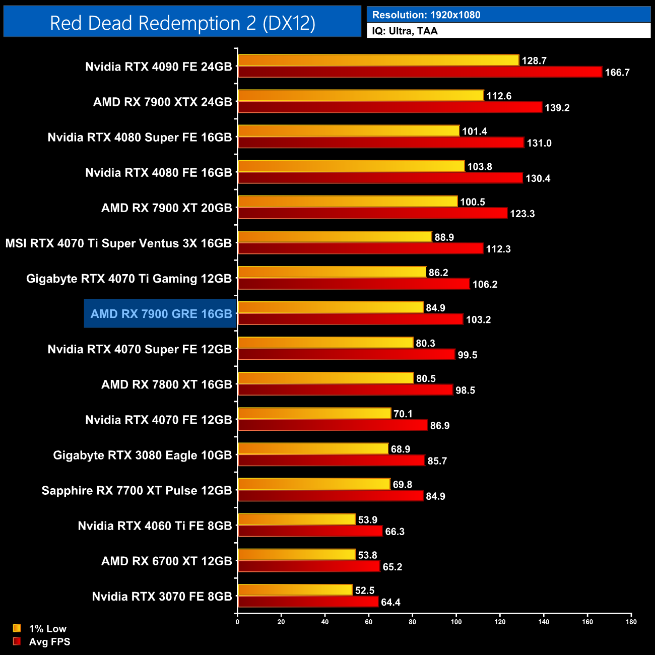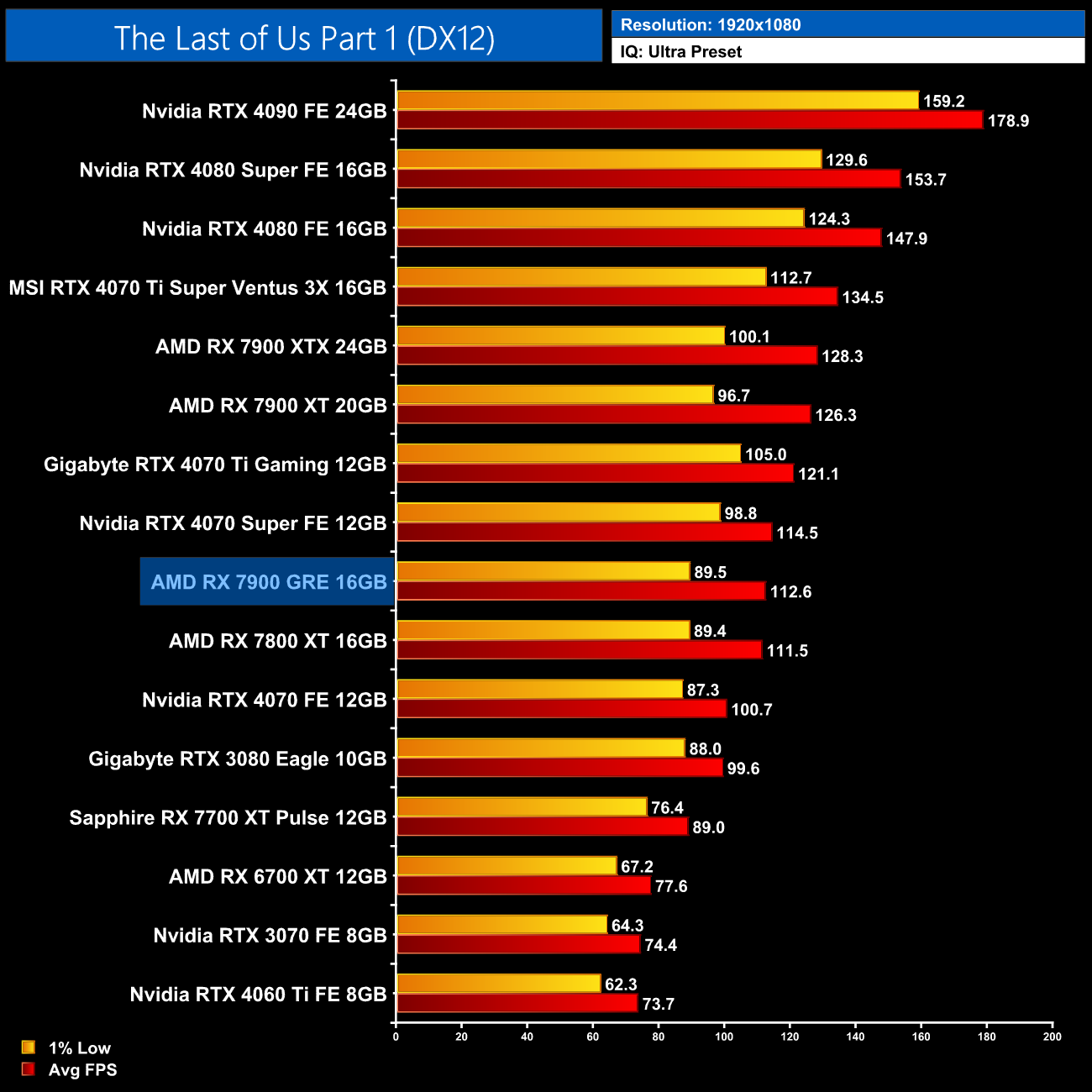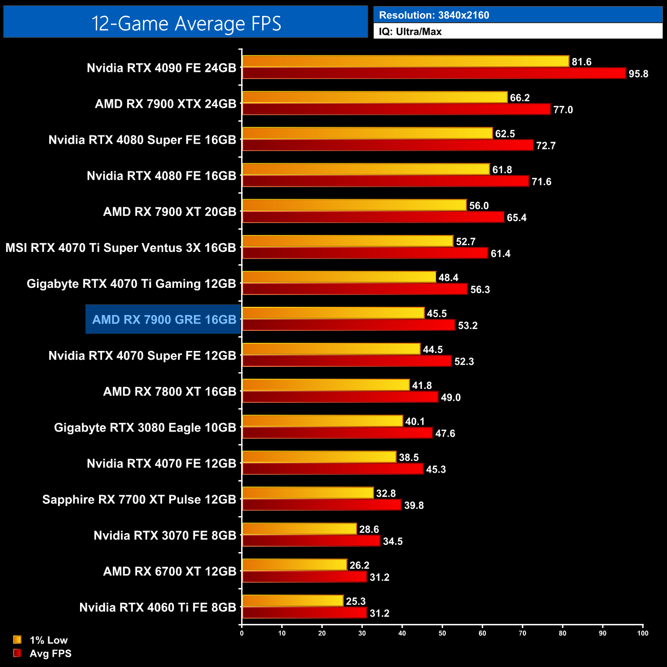 Overall, across the 12 games tested, the RX 7900 GRE averaged 92FPS at 1440p, putting it neck-and-neck with the RTX 4070 Super, as there's less than a 1% difference between the two. This means the GRE is 8% faster than the RX 7800 XT, which isn't a massive difference considering the fact it has a third more cores, while it is 18% slower than the RX 7900 XT.