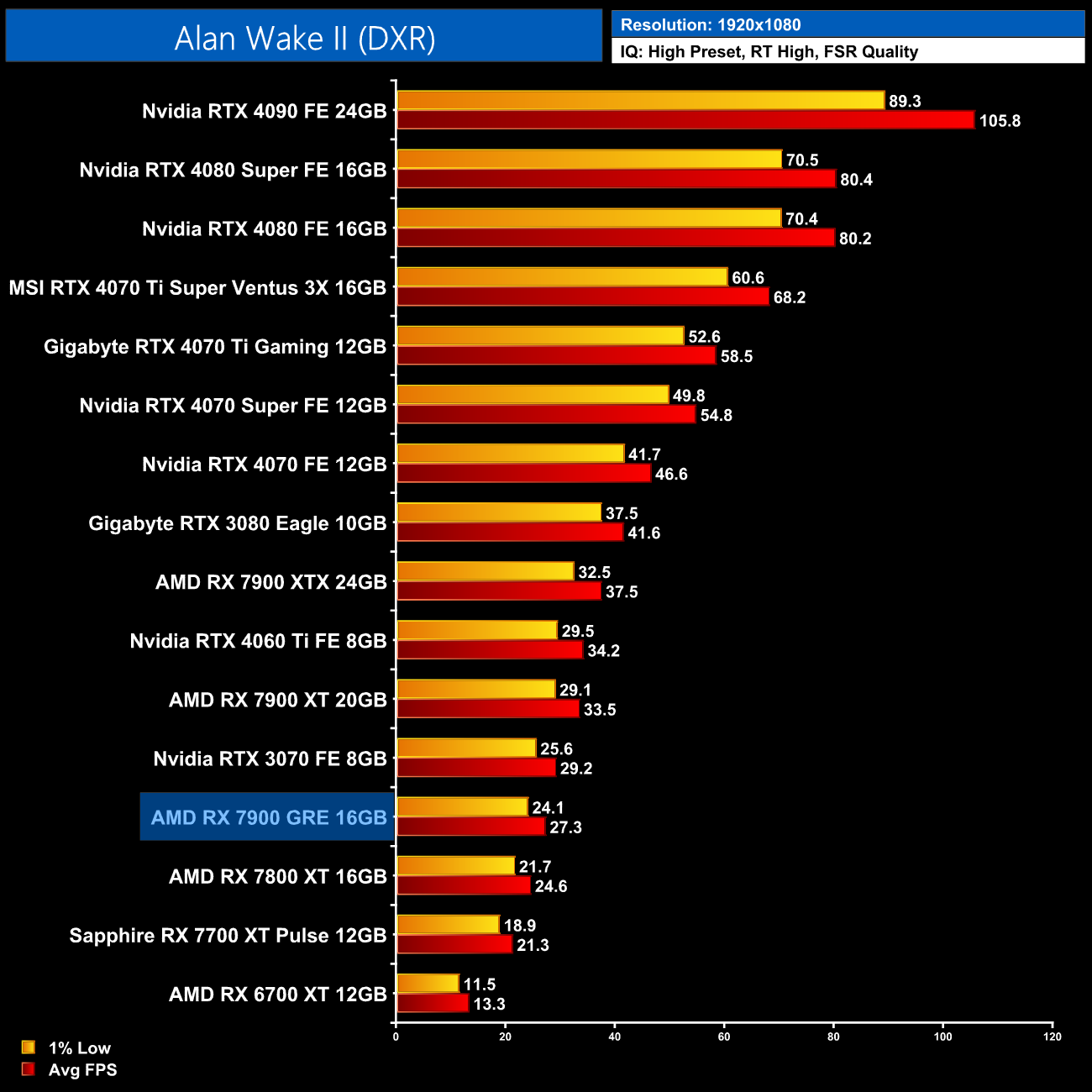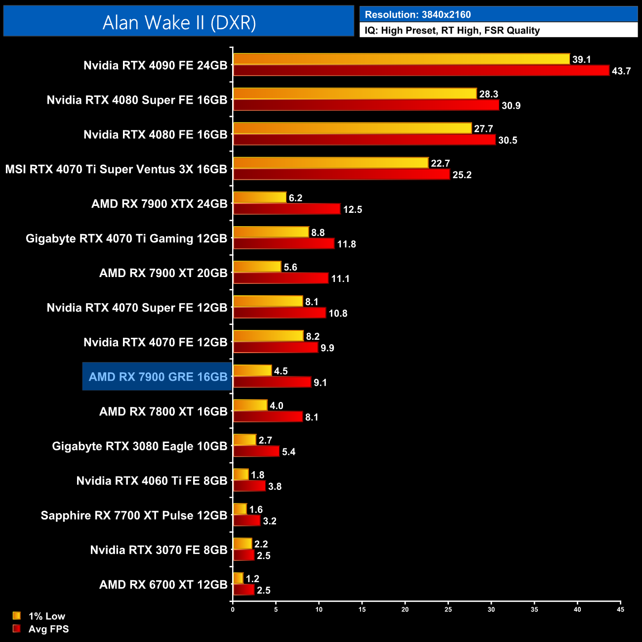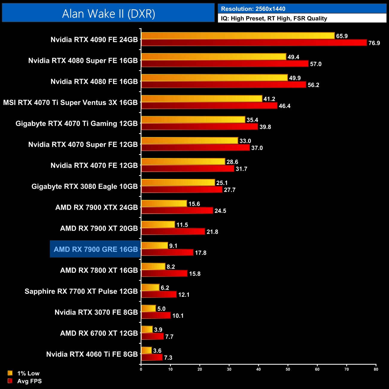 Starting our look at ray tracing performance with Alan Wake 2, AMD GPUs struggle with the path traced lighting in this title, reducing the RX 7900 GRE to a mere 18FPS at 1440p, and that's with FSR Quality upscaling. Clearly, an Nvidia GPU is almost a requirement to play with the RT High preset here.