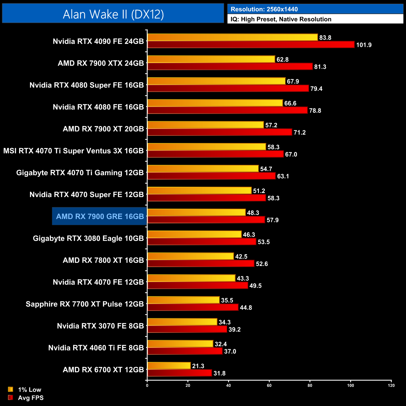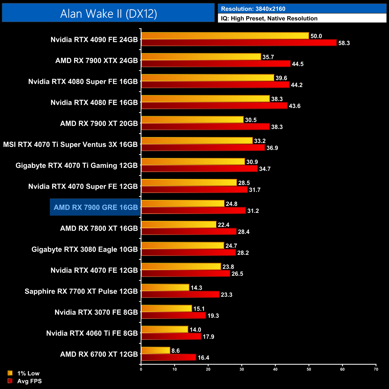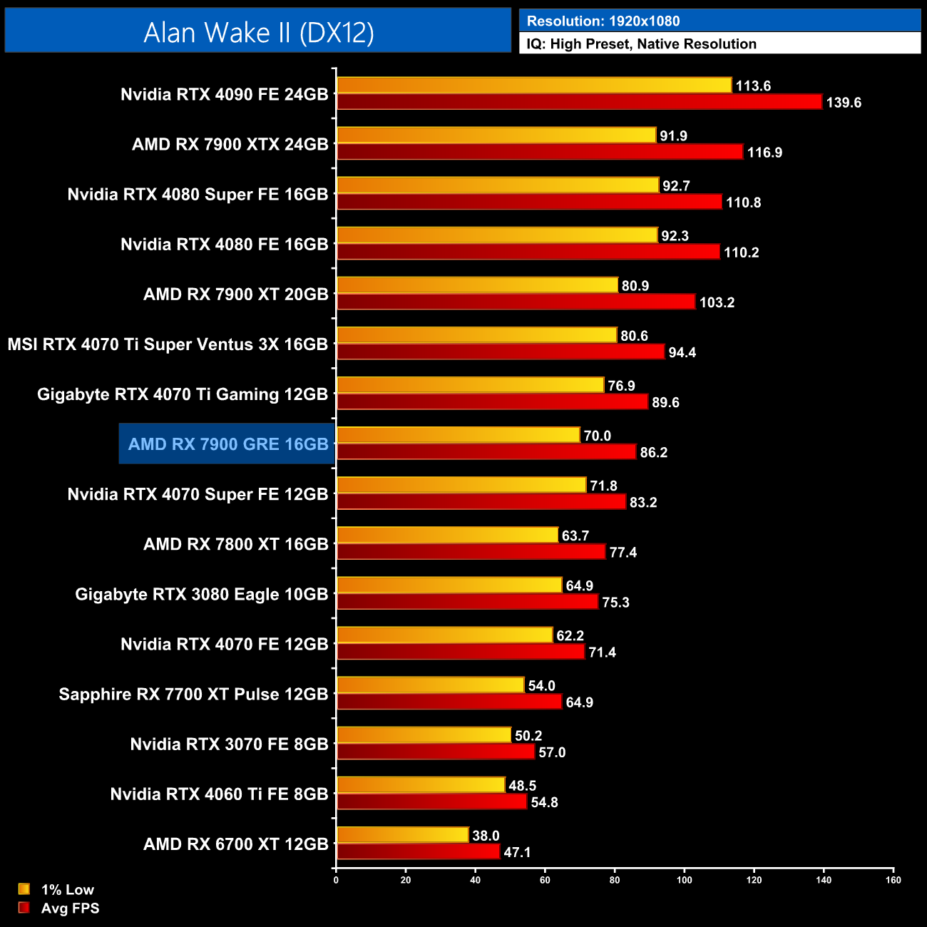 Starting our look at ray tracing performance with Alan Wake 2, AMD GPUs struggle with the path traced lighting in this title, reducing the RX 7900 GRE to a mere 18FPS at 1440p, and that's with FSR Quality upscaling. Clearly, an Nvidia GPU is almost a requirement to play with the RT High preset here.