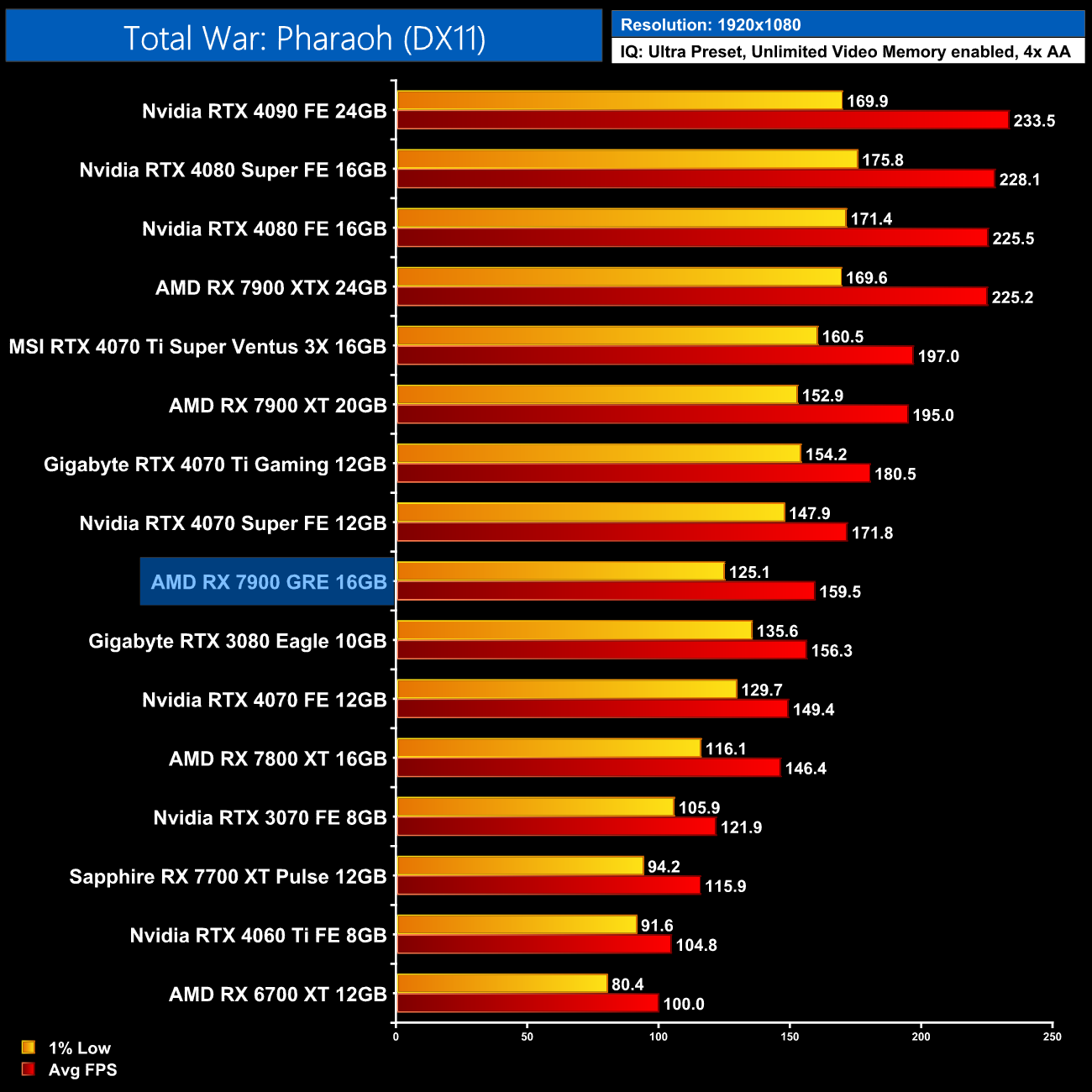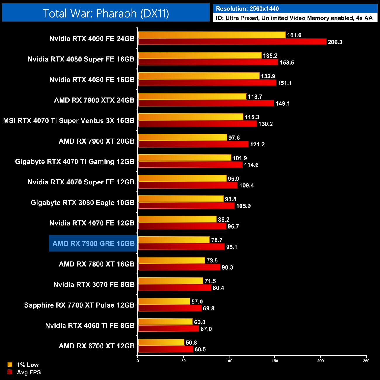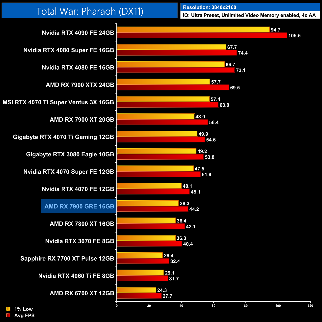 Finally we finish up with Total War: Pharaoh, a game with a preference for Nvidia GPUs, and at 1440p the 7900 GRE struggles. It's slower than the vanilla 4070 for instance, and 13% behind the 4070 Super, while we're only looking at a 5% boost over the 7800 XT.