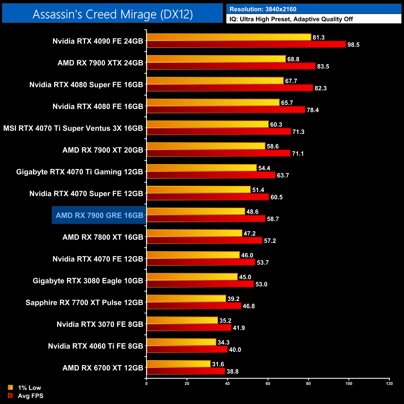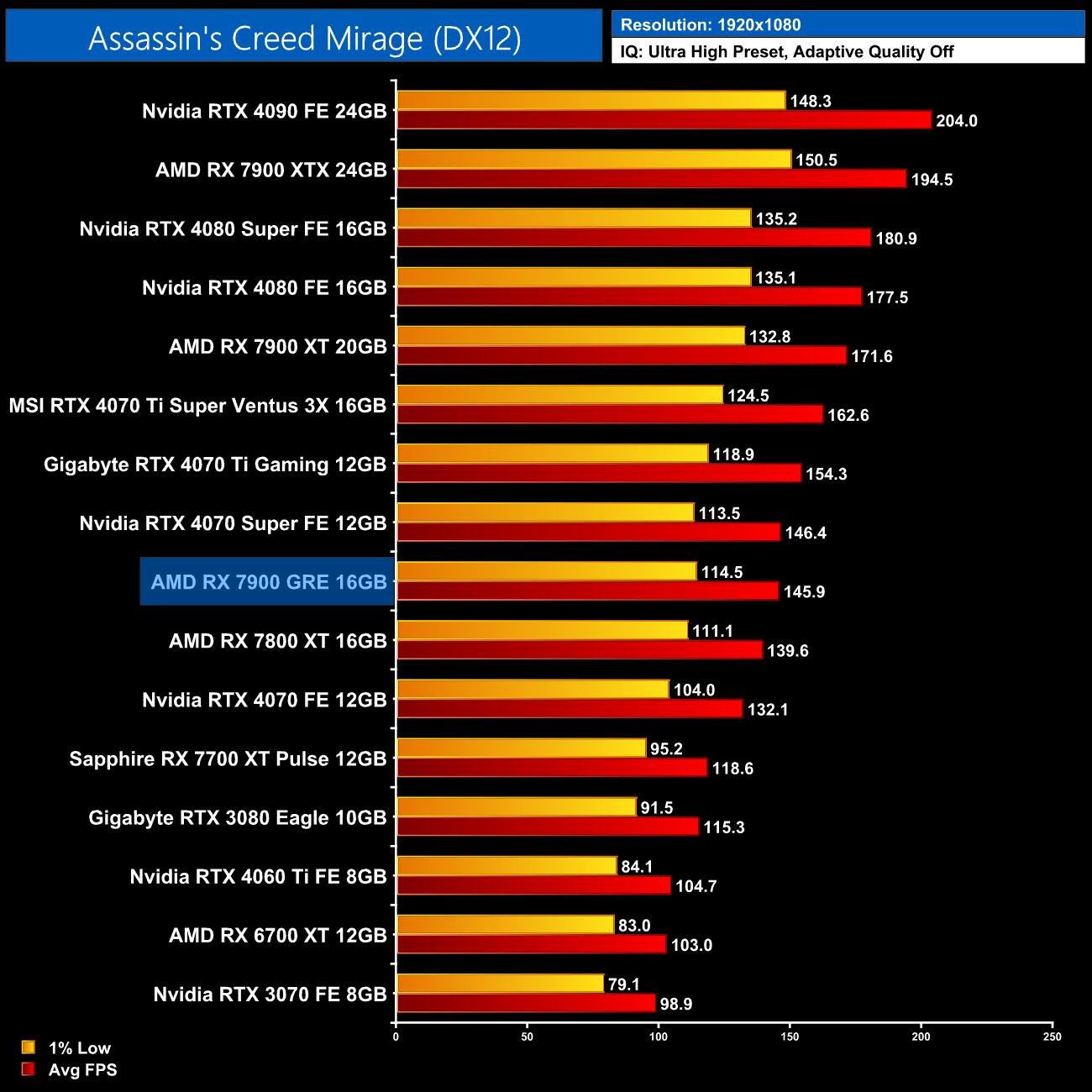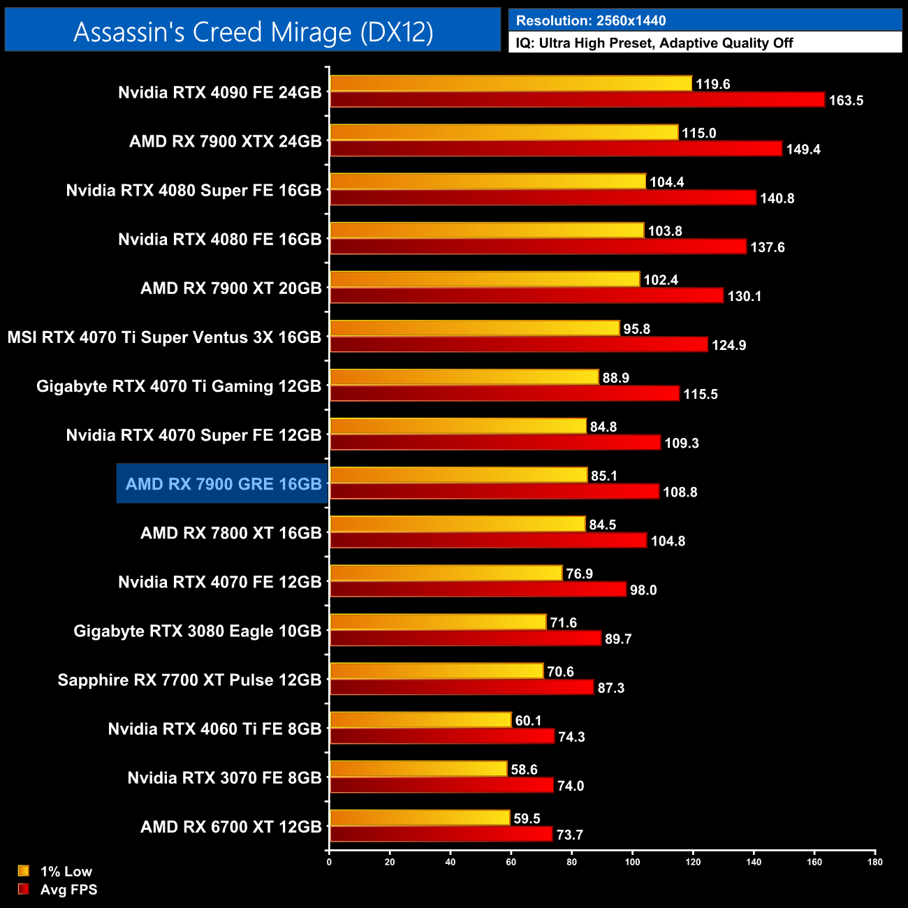 Finally we finish up with Total War: Pharaoh, a game with a preference for Nvidia GPUs, and at 1440p the 7900 GRE struggles. It's slower than the vanilla 4070 for instance, and 13% behind the 4070 Super, while we're only looking at a 5% boost over the 7800 XT.