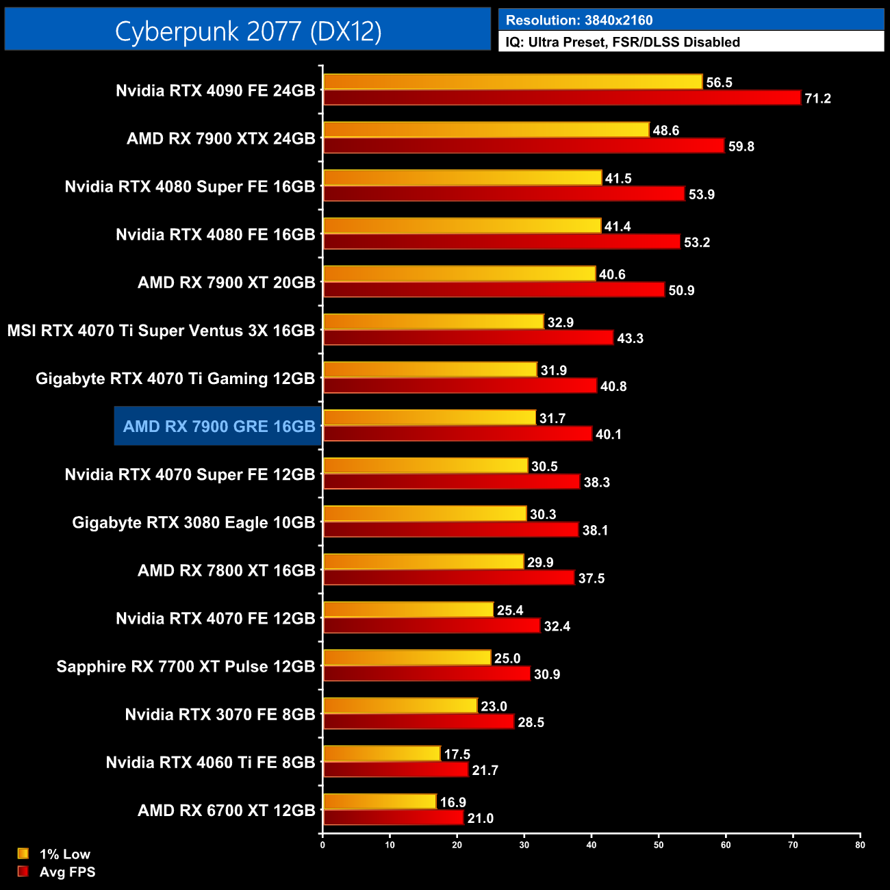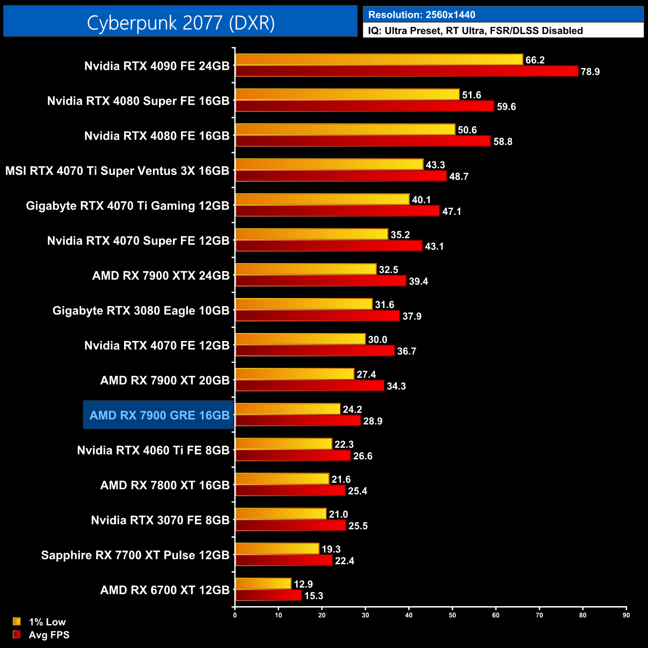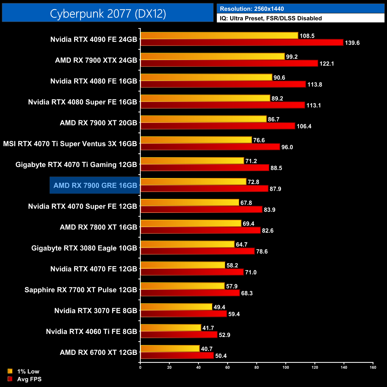 Cyberpunk 2077 is another tough ask for the 7900 GRE, and this isn't even with RT Overdrive enabled! At 1440p it's significantly slower than the vanilla RTX 4070 and barely faster than the 4060 Ti 8GB.