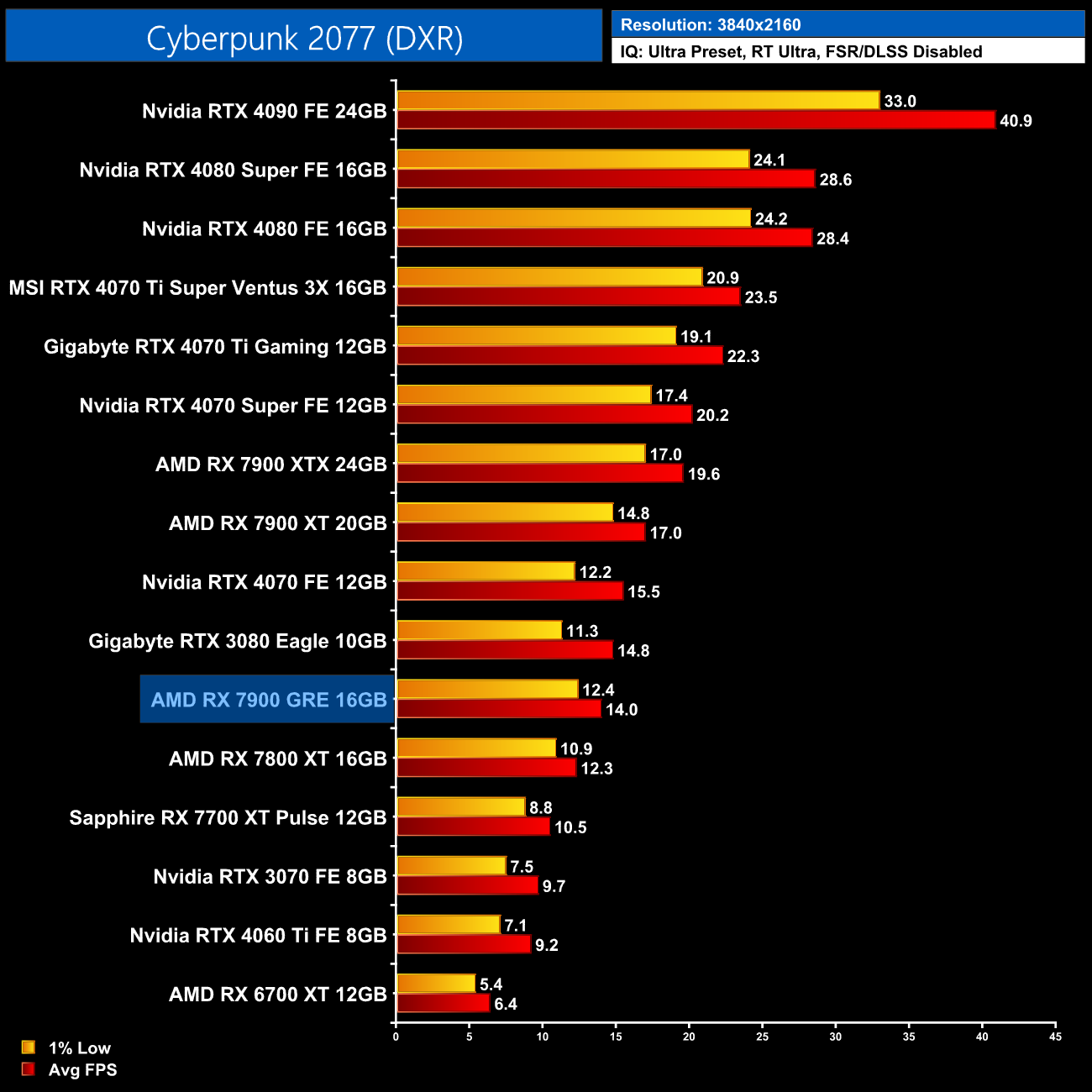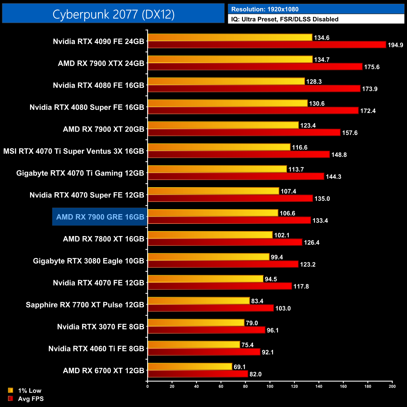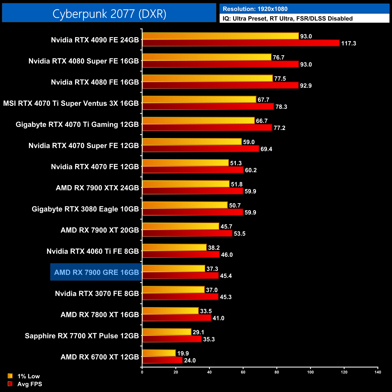 Cyberpunk 2077 is another tough ask for the 7900 GRE, and this isn't even with RT Overdrive enabled! At 1440p it's significantly slower than the vanilla RTX 4070 and barely faster than the 4060 Ti 8GB.