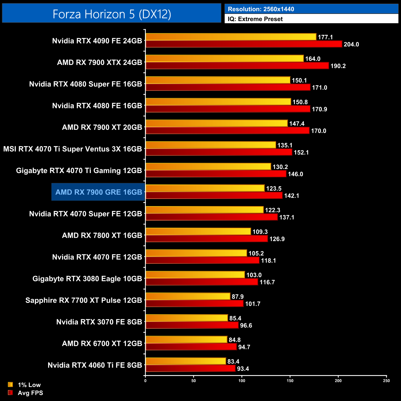 F1 23 is a lot more competitive, with the 7900 GRE edging ahead of the RTX 4070 at 1440p and also delivering 13% more performance than the 7800 XT, though it's still 10% behind the 4070 Super.