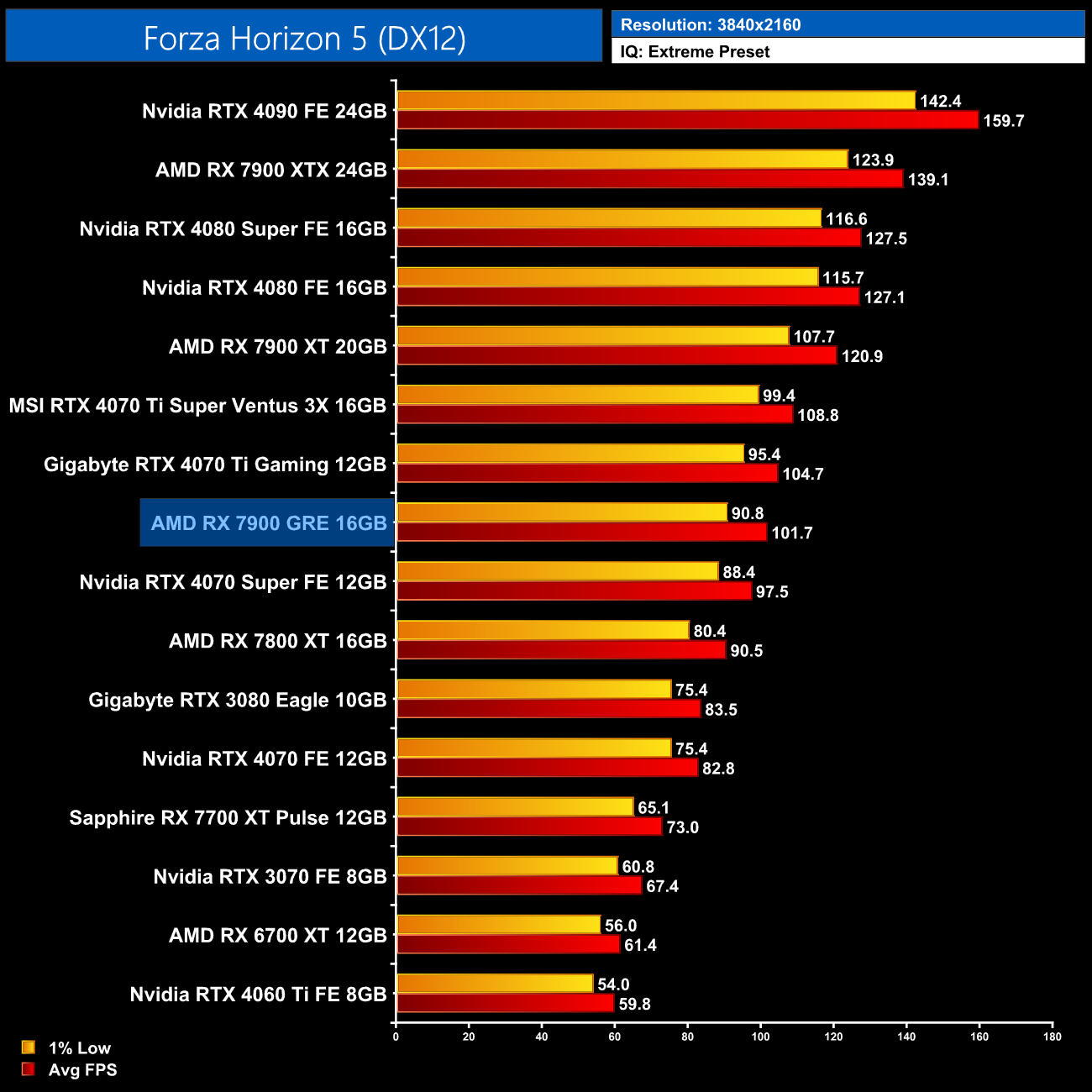 4K is a tough ask in Starfield though without using FSR, but we still see a healthy 9% lead for the GRE over the 4070 Super, and it's 11% faster than the 7800 XT here.