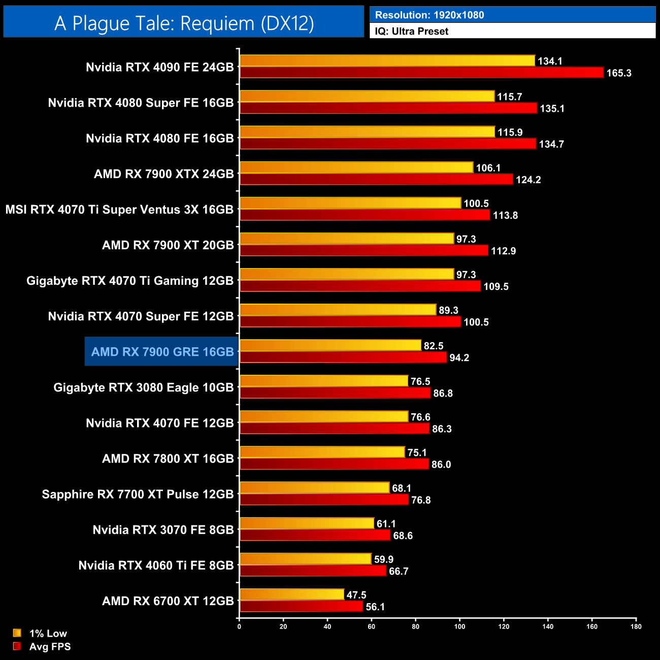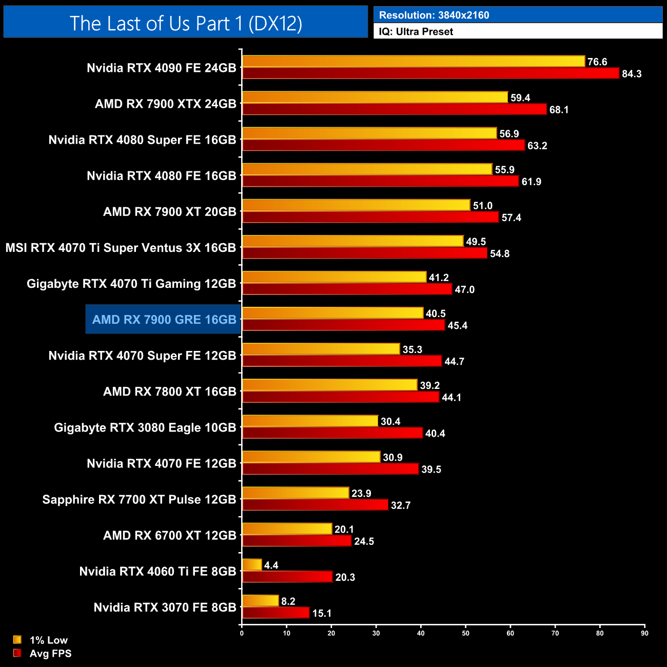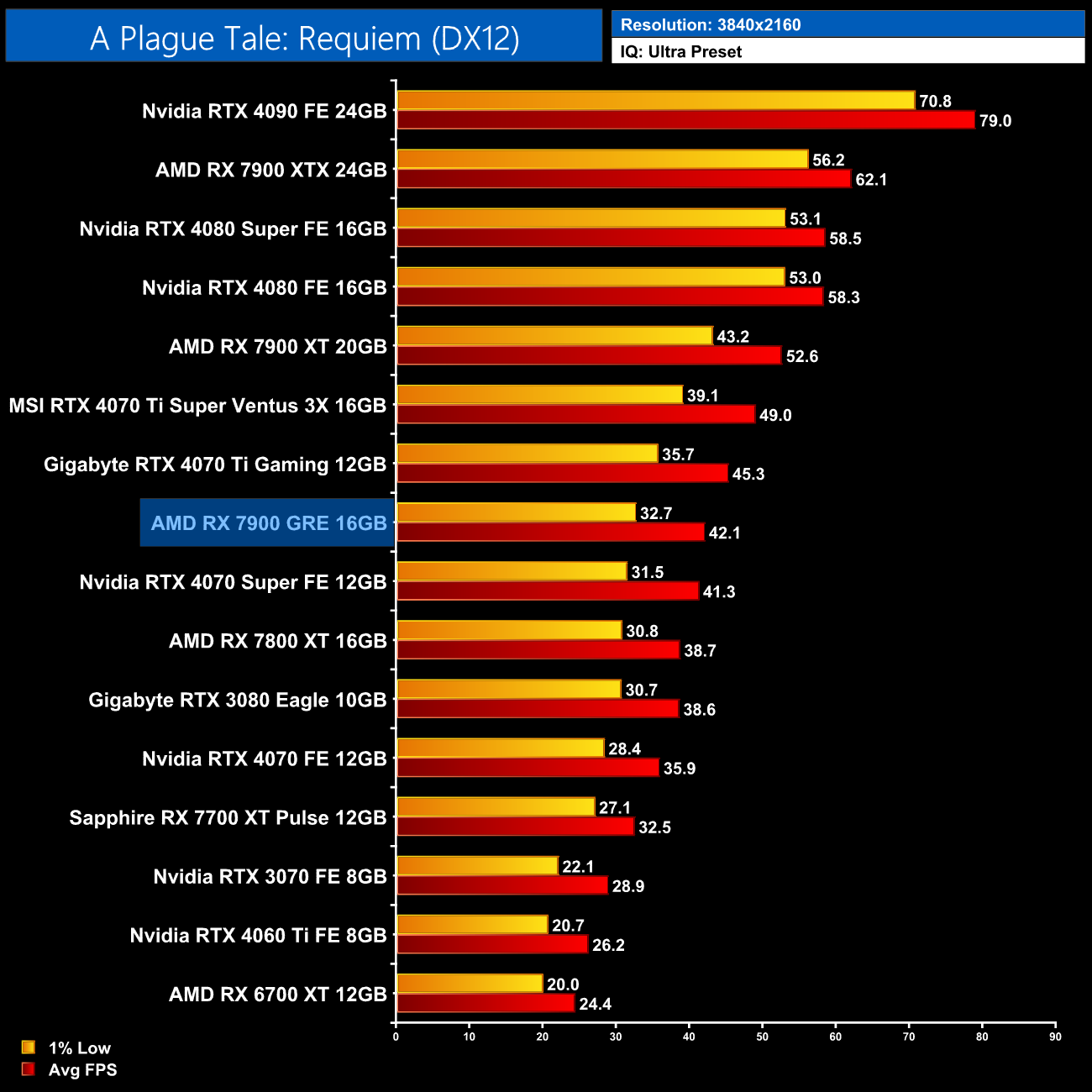 Avatar: Frontiers of Pandora is a lot more performant with the 7900 GRE, hitting 48FPS without any form of upscaling. That puts it level with the likes of the RTX 3080 10GB and RTX 4070, while it's 15% faster than the 7800 XT here.