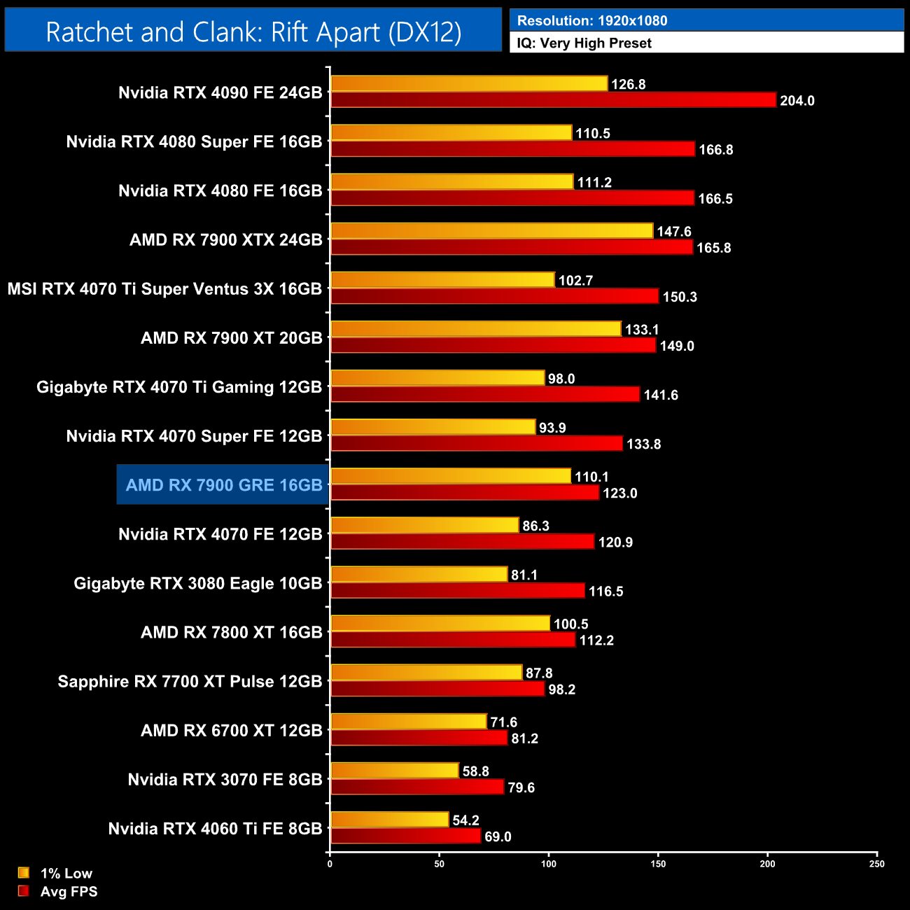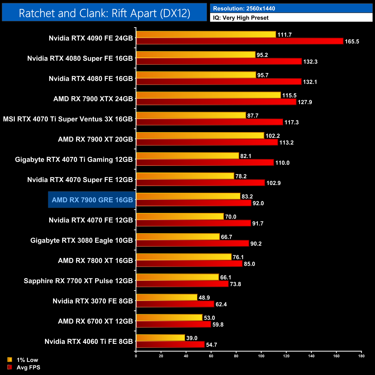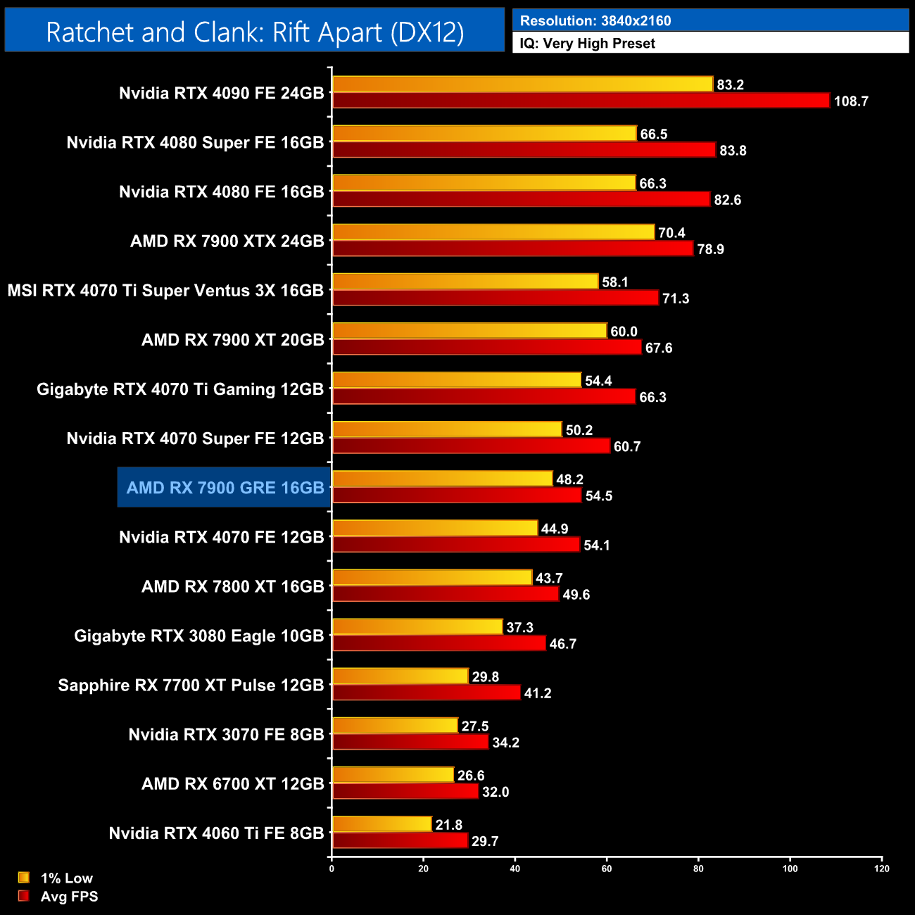 The 7900 GRE gets pummelled in Ratchet and Clank, too, averaging 32FPS at native 1440p, making it a whopping 46% slower than the 4070 Super – even the RTX 3070 is faster here.