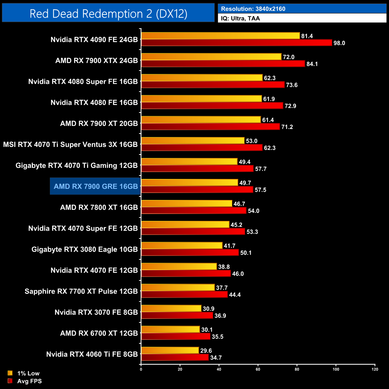 The same also goes at 4K, with very similar performance scaling, so it's not one of the 7900 GRE's better games we have tested.