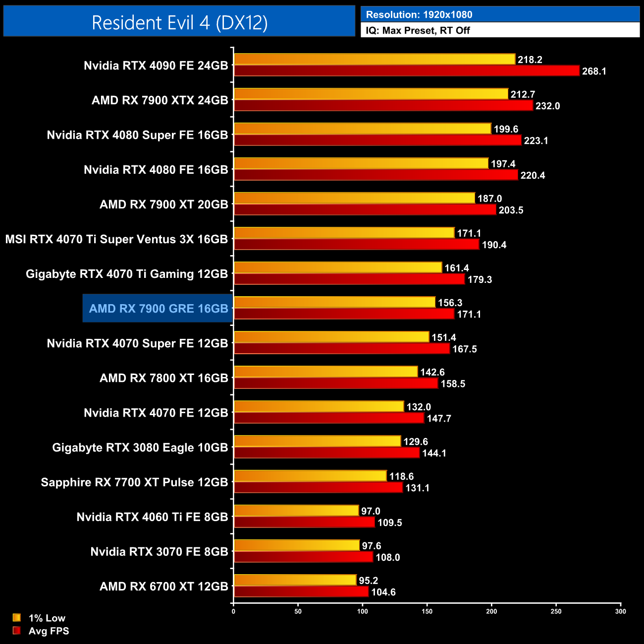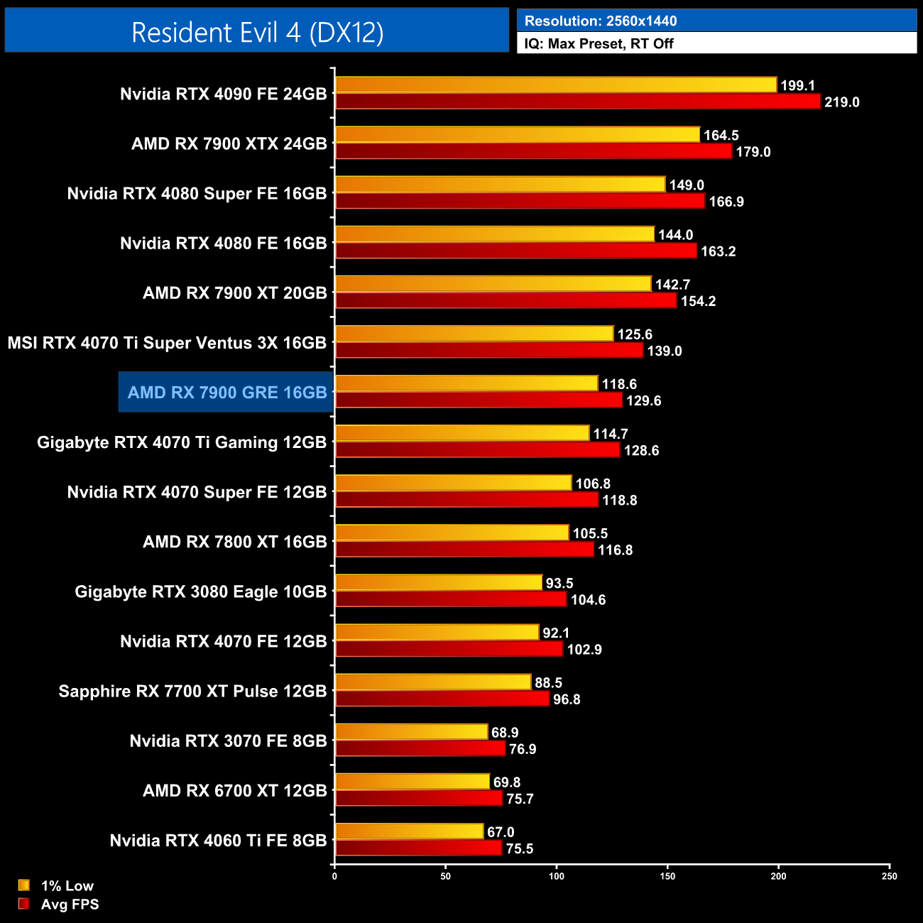 Resident Evil 4 is another game that favours AMD hardware, with the 7900 GRE on par with the 4070 Ti at 1440p, while we're again looking at an 11% uplift over the 7800 XT.