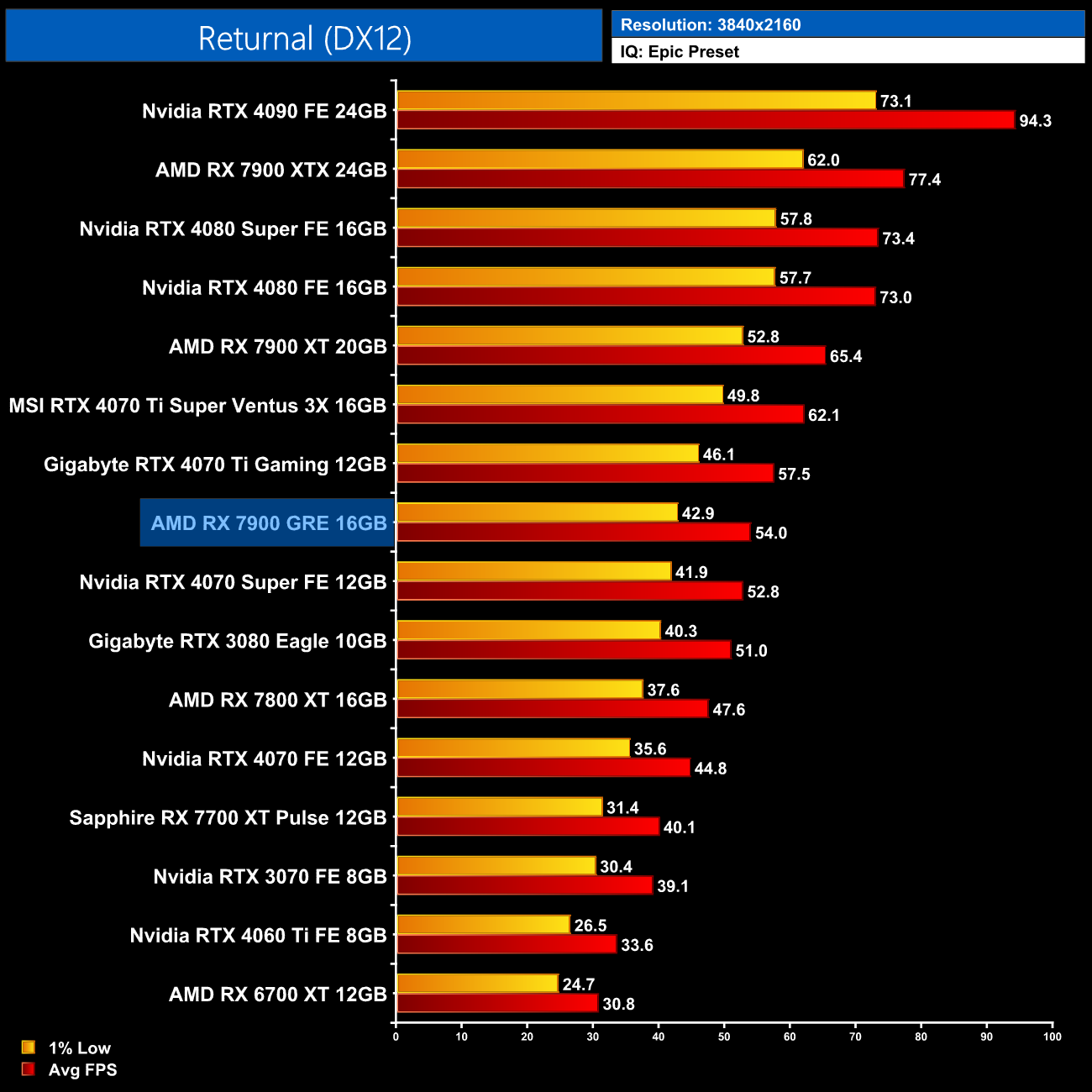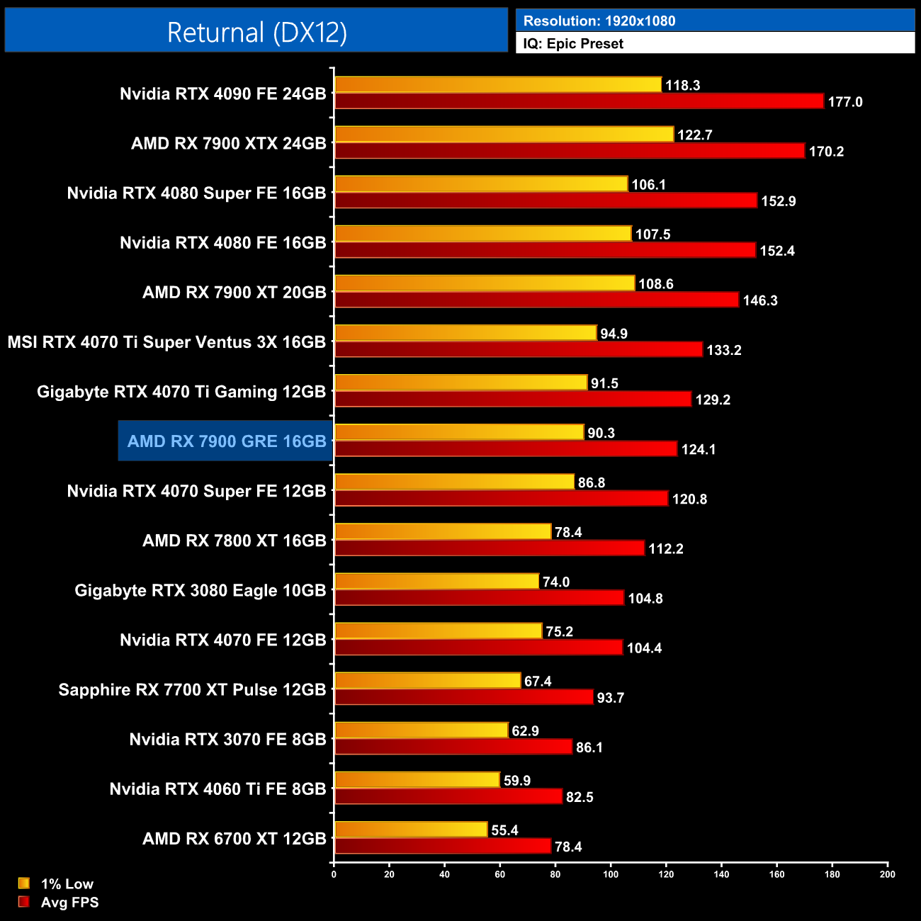 The Unreal Engine 4-based Returnal sees a much more competitive fight – the 7900 GRE still can't match the 4070 Super, but it is on par with the 4070, and about 11% faster than the 7800 XT here.
