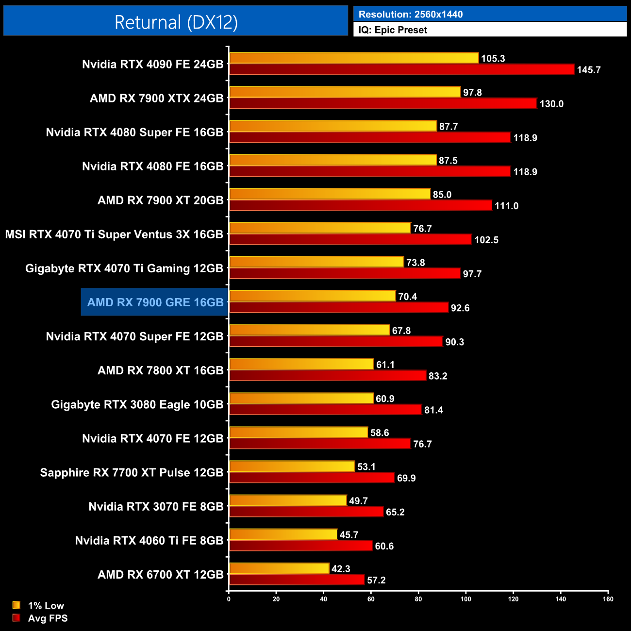 Returnal shows more competitive performance from the 7900 GRE, as at 1440p it is a hair faster than the RTX 4070 Super and not too far behind the 4070 Ti.