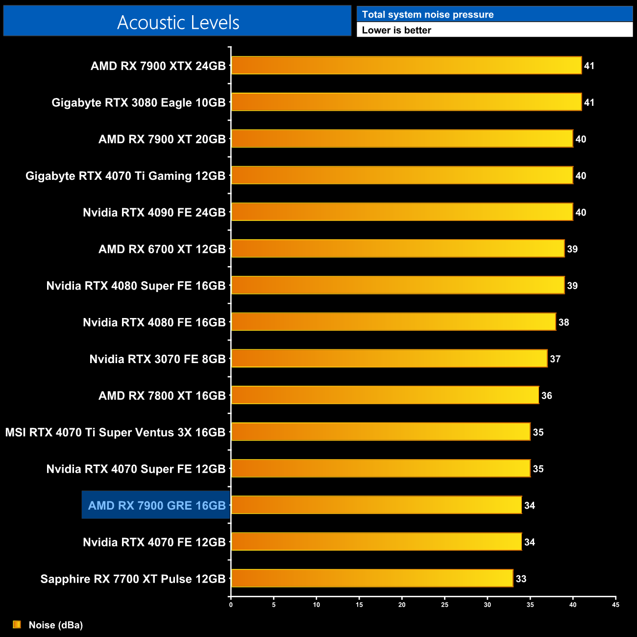 The reference 7900 GRE is very quiet, too, with its three fans spinning at just 42%/1125rpm in my testing, resulting in a noise reading of just 34dBa.