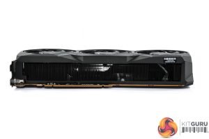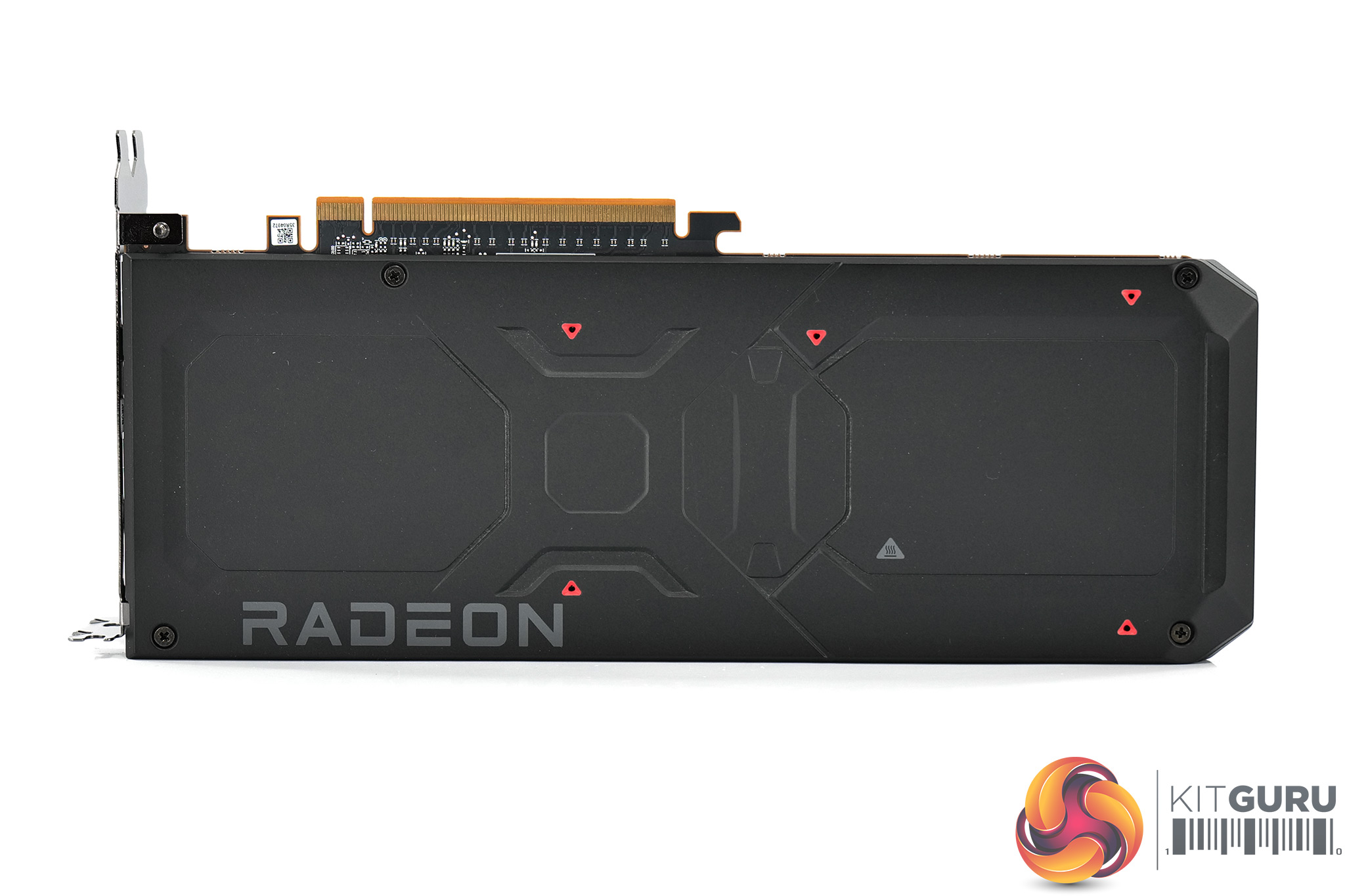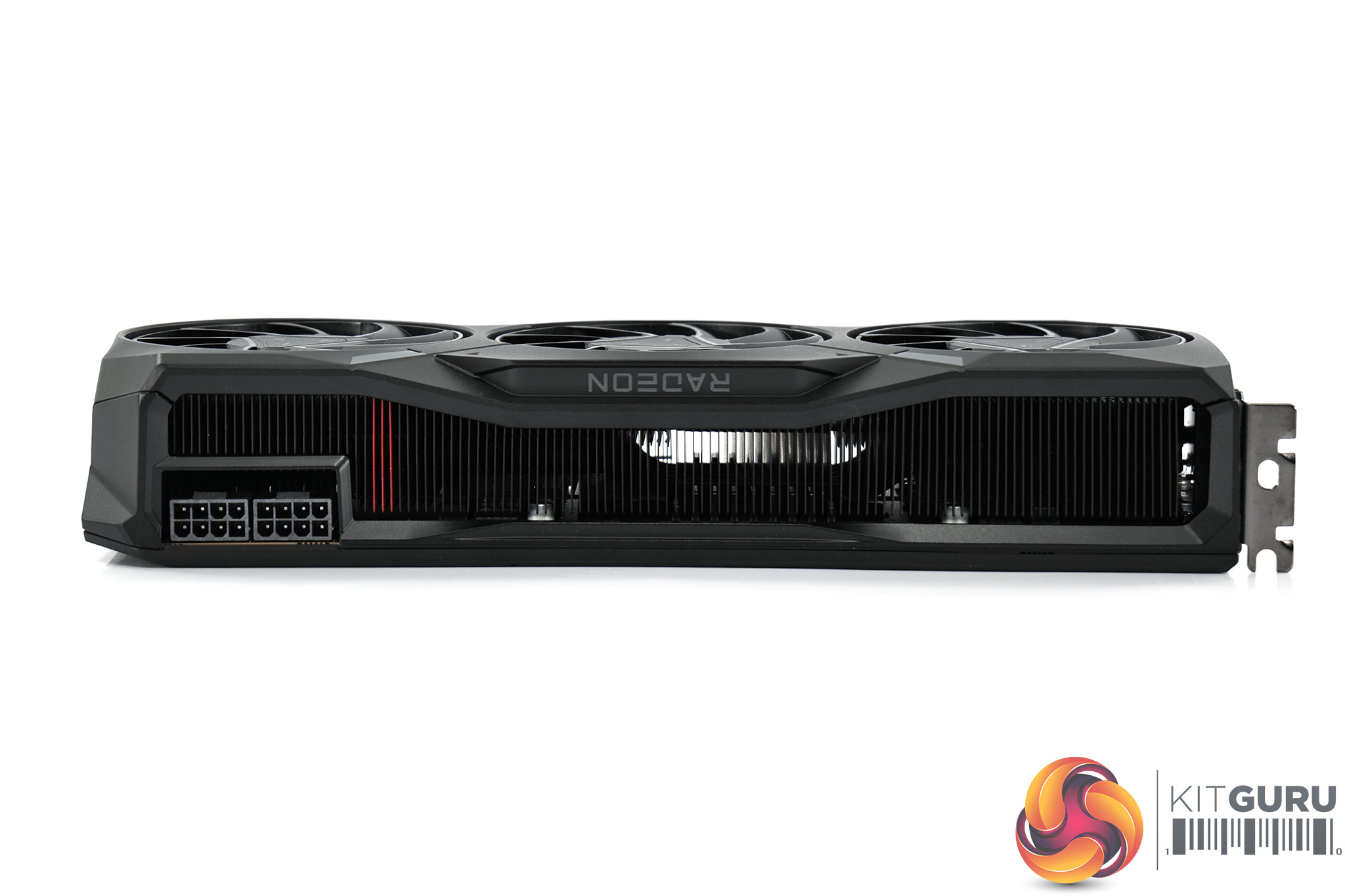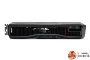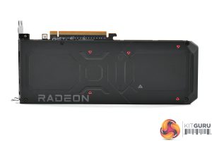 The front side of the card is left fairly bare, with the aluminium finstack occupying most of the space. We also find a full-length metal backplate, with the Radeon branding printed in grey text towards the I/O bracket.