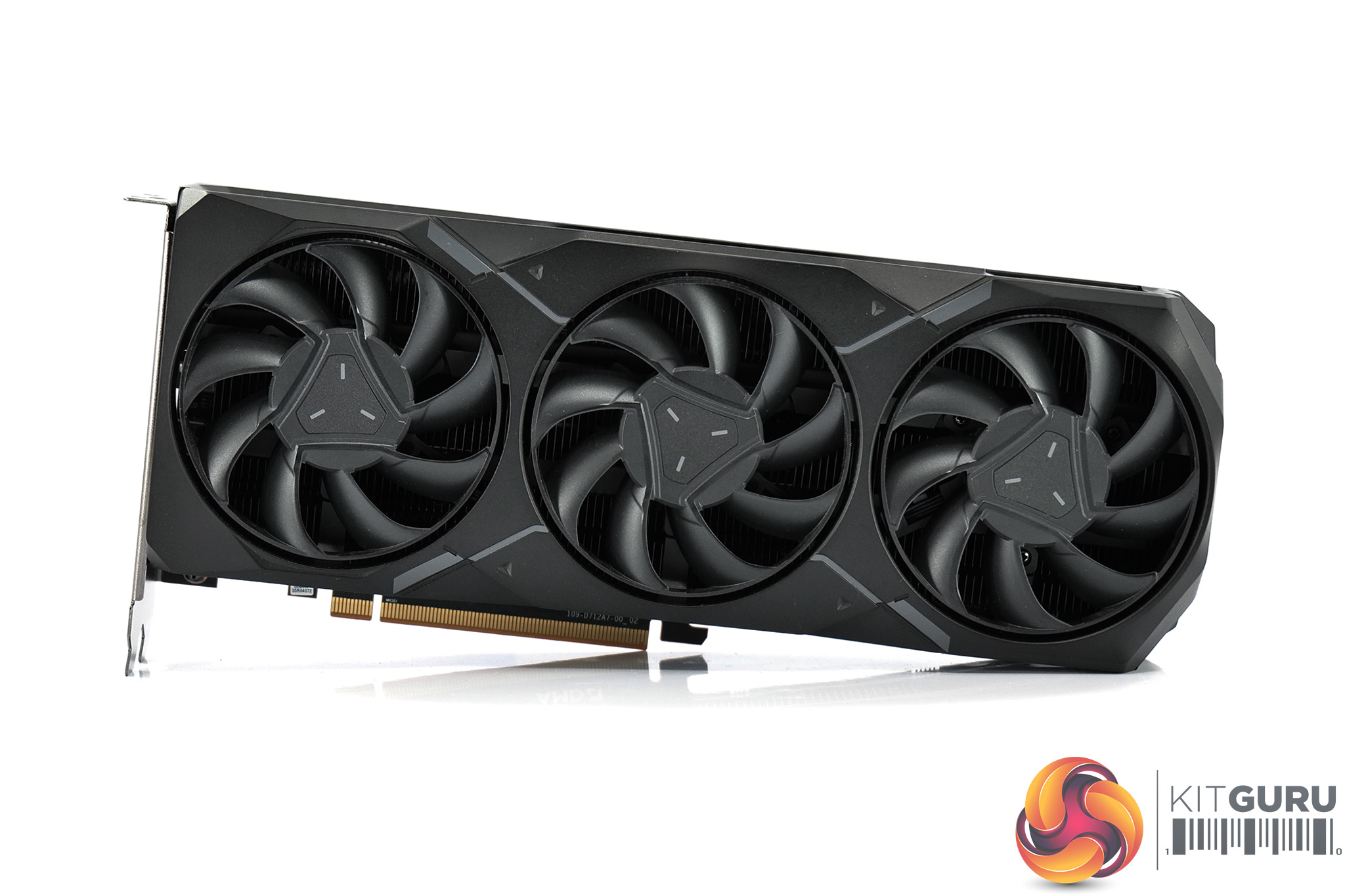 The design of this model is very similar to the RX 7900 XT, with its matte black metal shroud and triple-fan layout. It's not the same exact card, with the GRE being a bit smaller, but it's very much part of the family. We also get a triple-fan cooler, where each fan measures 80mm in diameter.