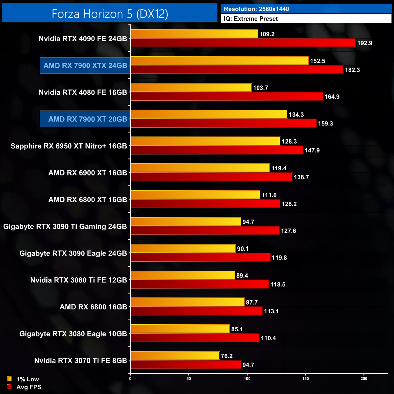 Nvidia GPUs currently have an issue with the 1% lows in Forza Horizon 5 – something we are told they are actively investigating so we'd hope for a fix soon. Right now though, AMD GPUs offer a much smoother experience, at any resolution, with the 7900 XTX delivering average performance that's only just shy of the RTX 4090 at 1440p, while it's 12% ahead of the RTX 4080 at 4K.