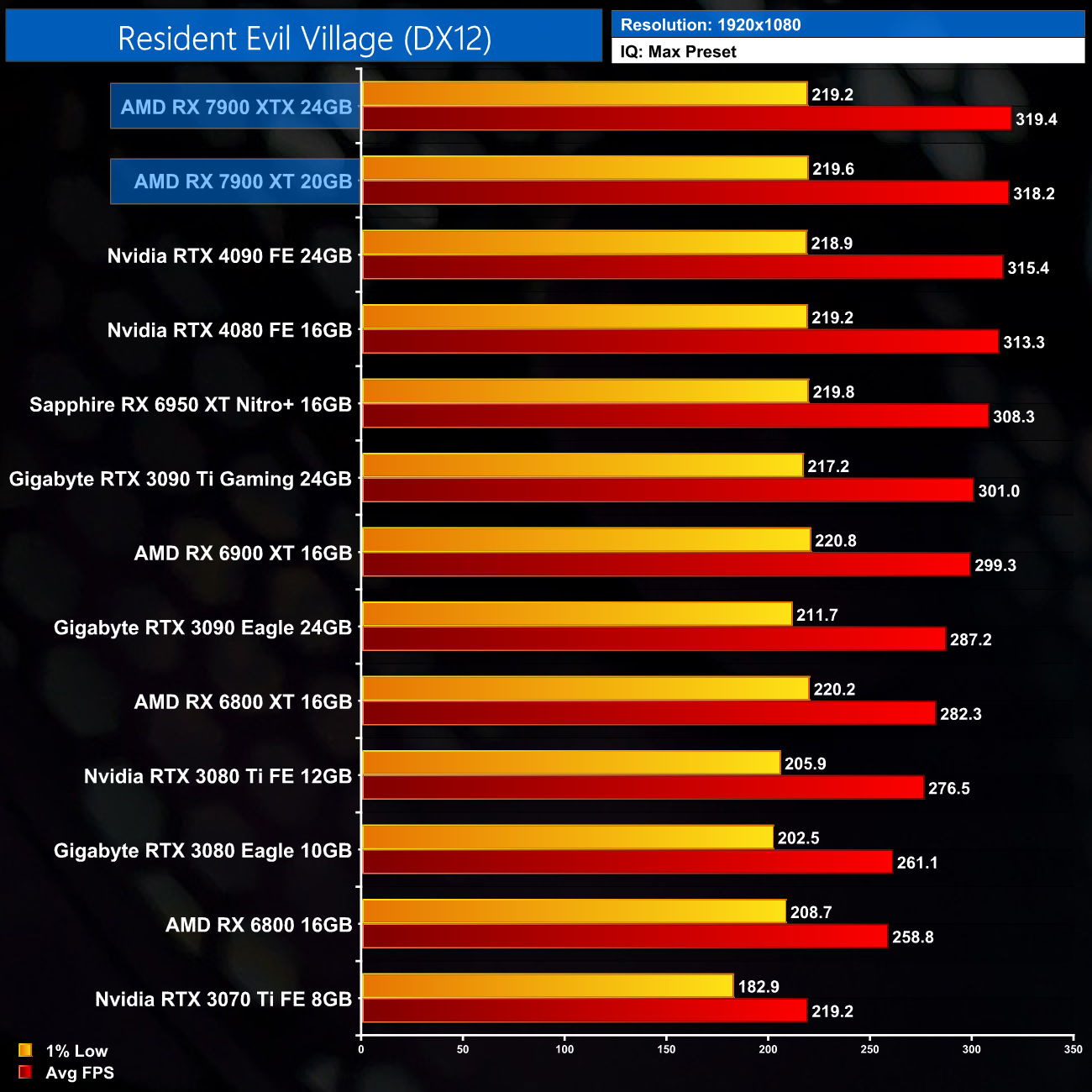 As for Resident Evil Village, the 7900 XTX delivers over 300FPS at max settings at 1440p, and is only just shy of the RTX 4090, though that GPU is definitely being bottlenecked by the CPU.