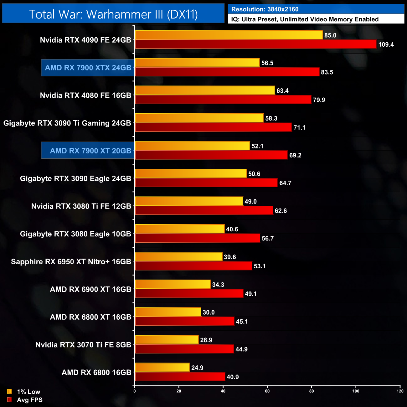 Last of all we come to Total War: Warhammer III. The 7900 XTX is slightly faster than the RTX 4080 on average at 1440p, though its 1% lows aren't quite as smooth.