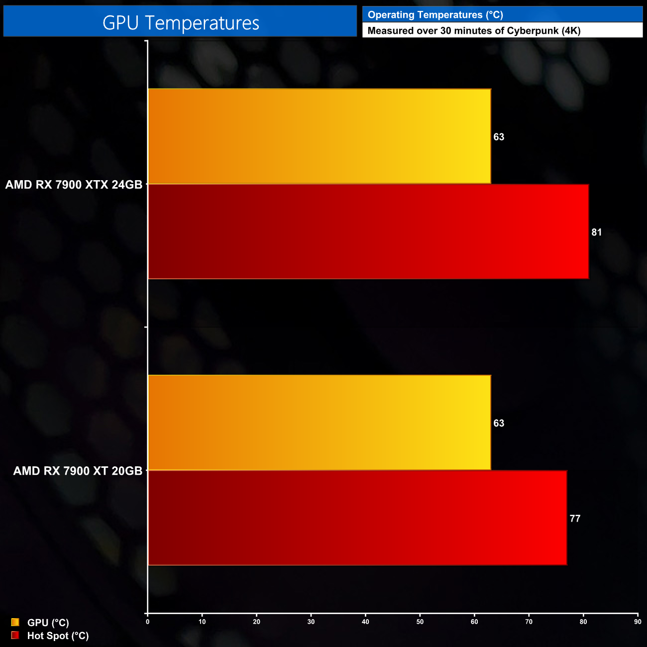 Thermal performance is no problem for the reference XTX card either. The GPU peaked at 63C, with the hot spot at 81C, with performance overall very similar to the 7900 XT.