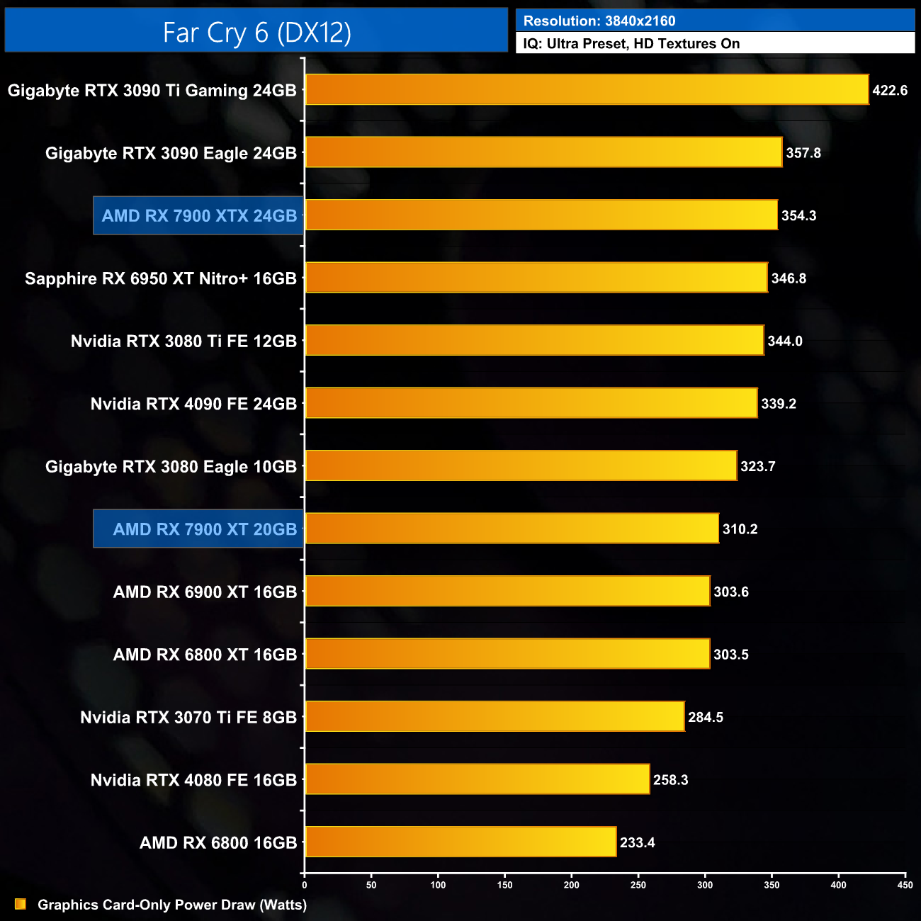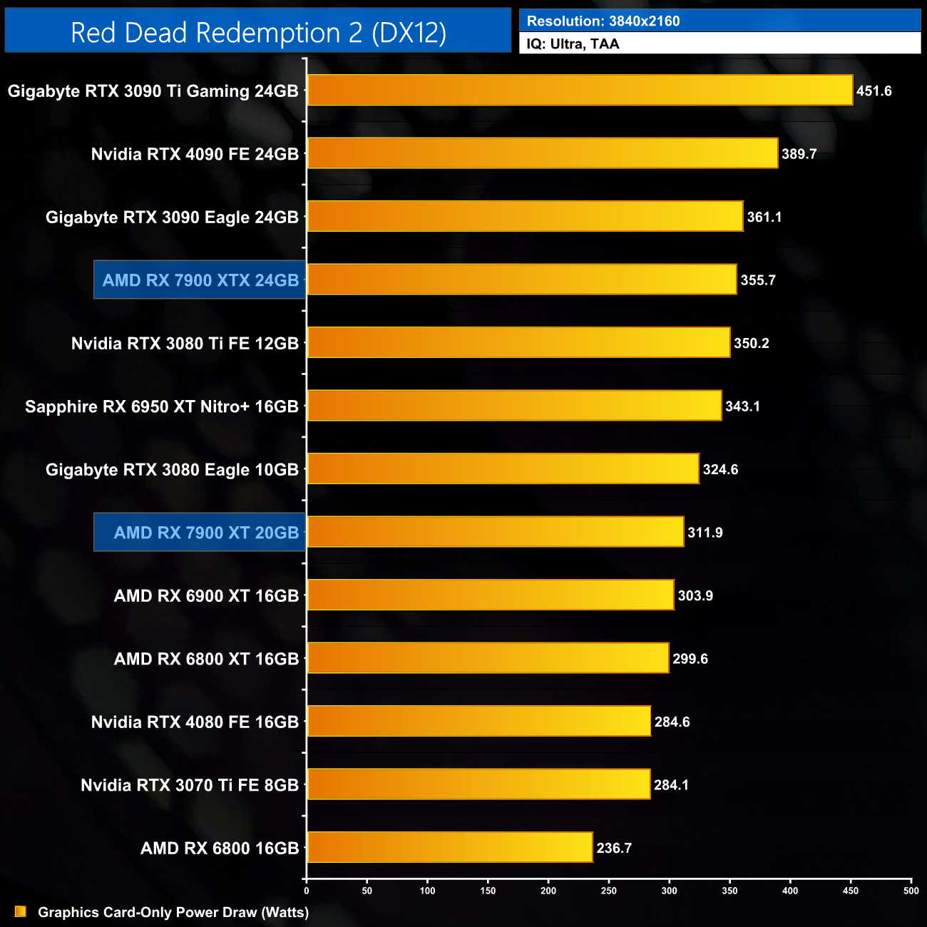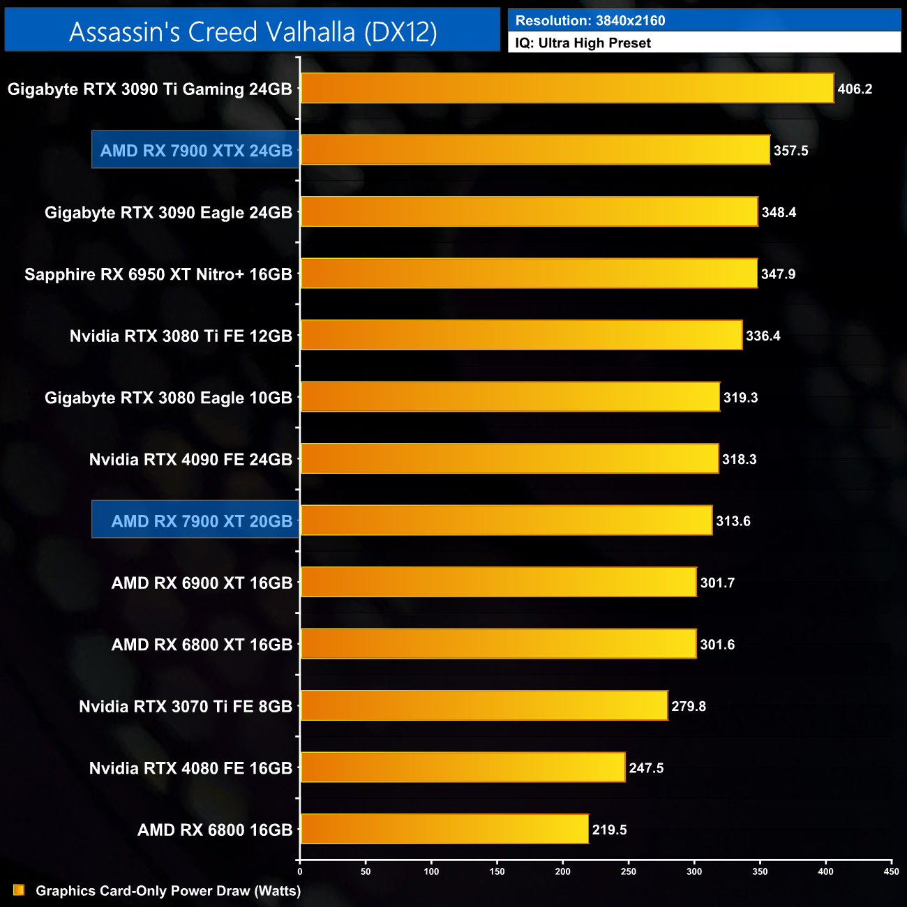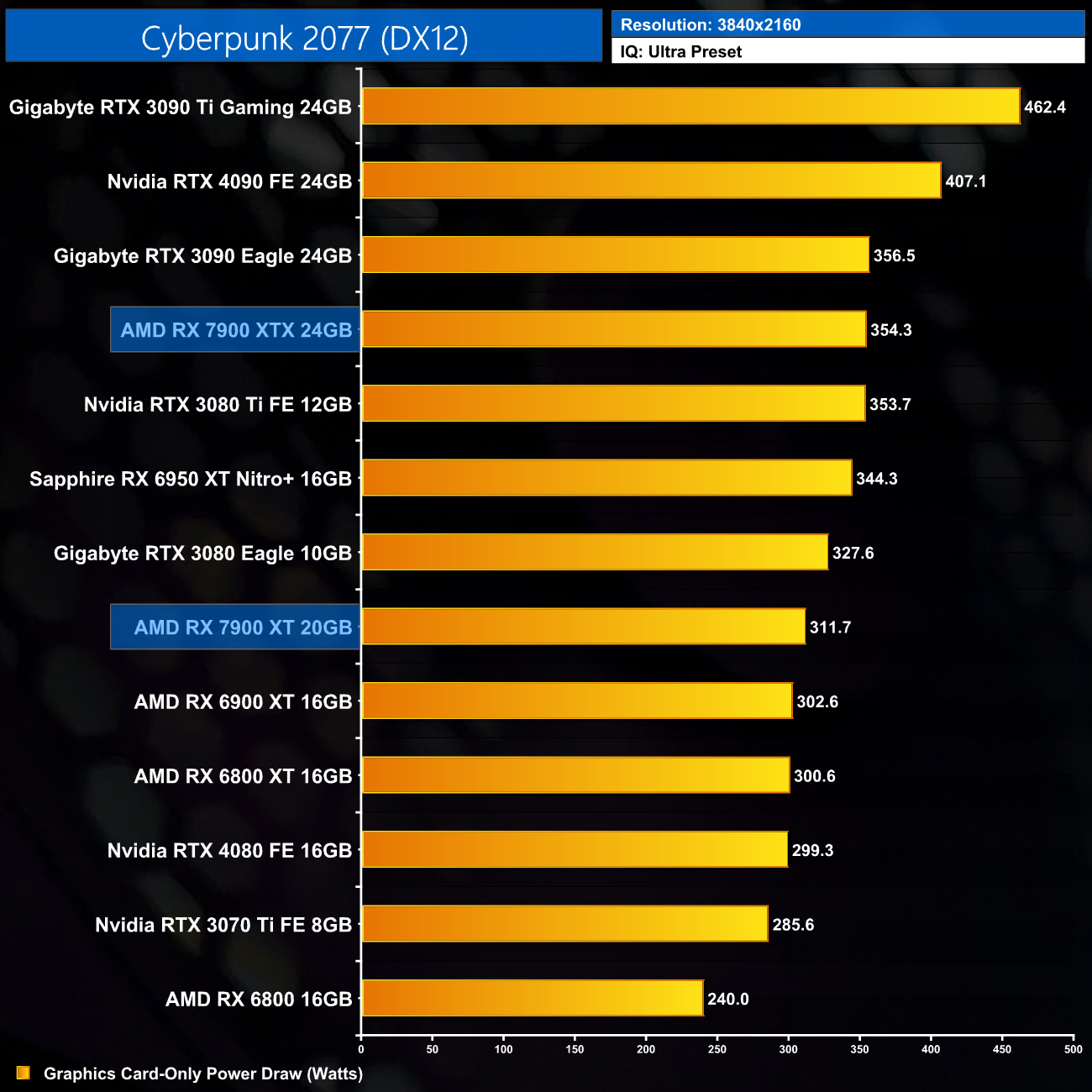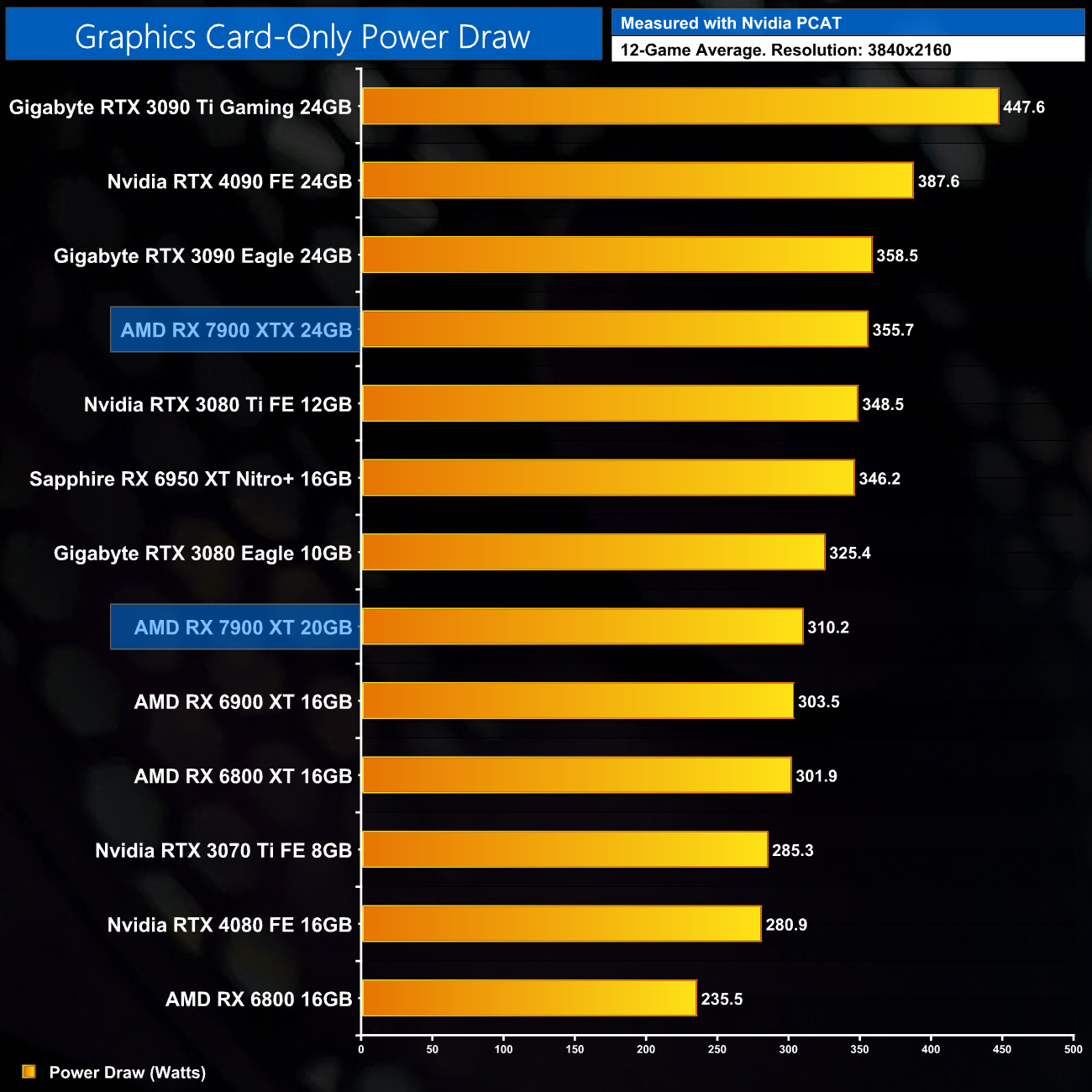 Up at 4K, power draw is again in-line with the rated 355W TBP, averaging 355.7W across the 12 games we tested. This is about 75W more than the RTX 4080 (a 26% difference), despite a 7% delta in gaming performance, something which has clear implications for efficiency, as we are about to see.