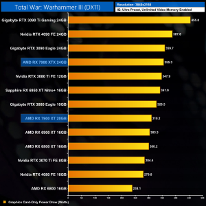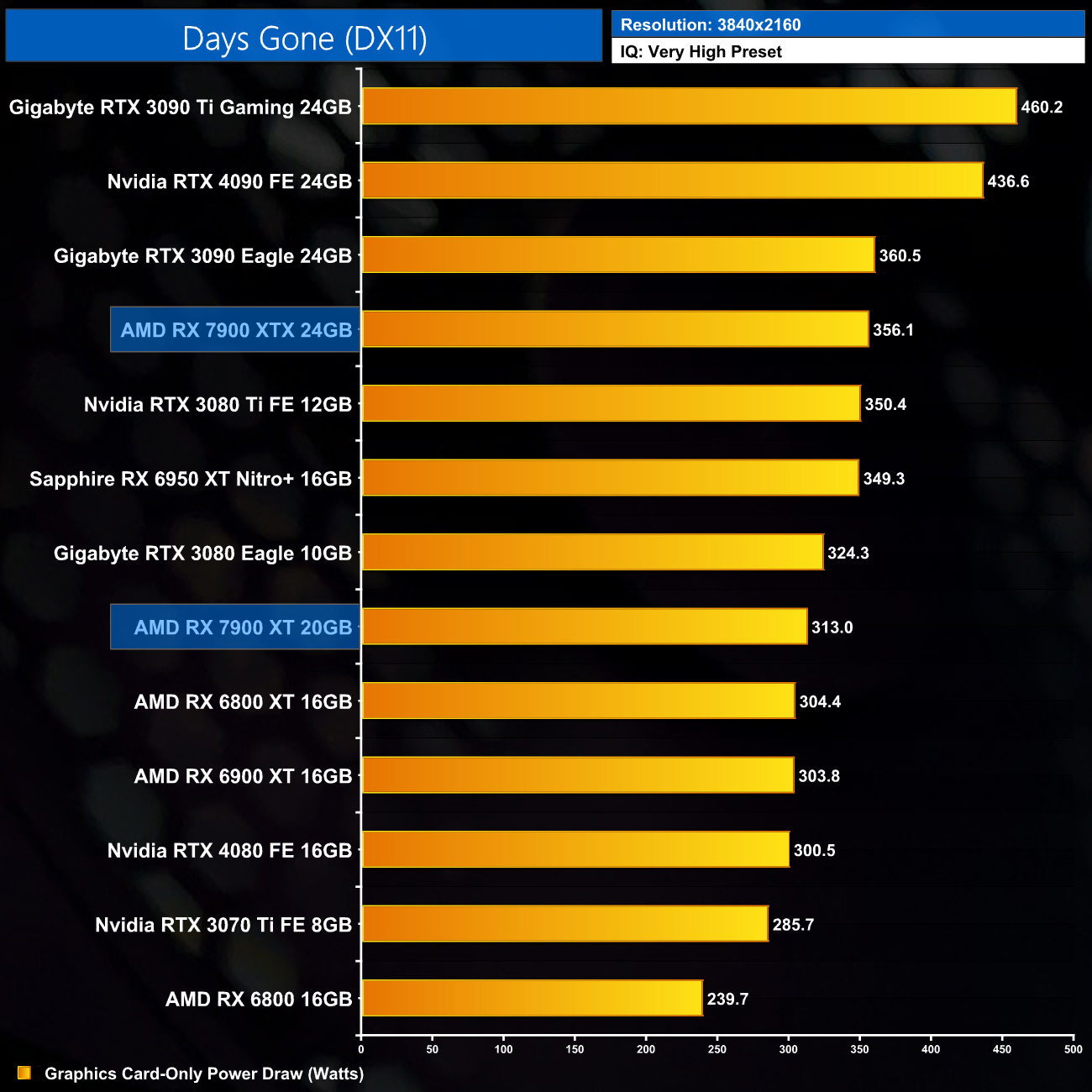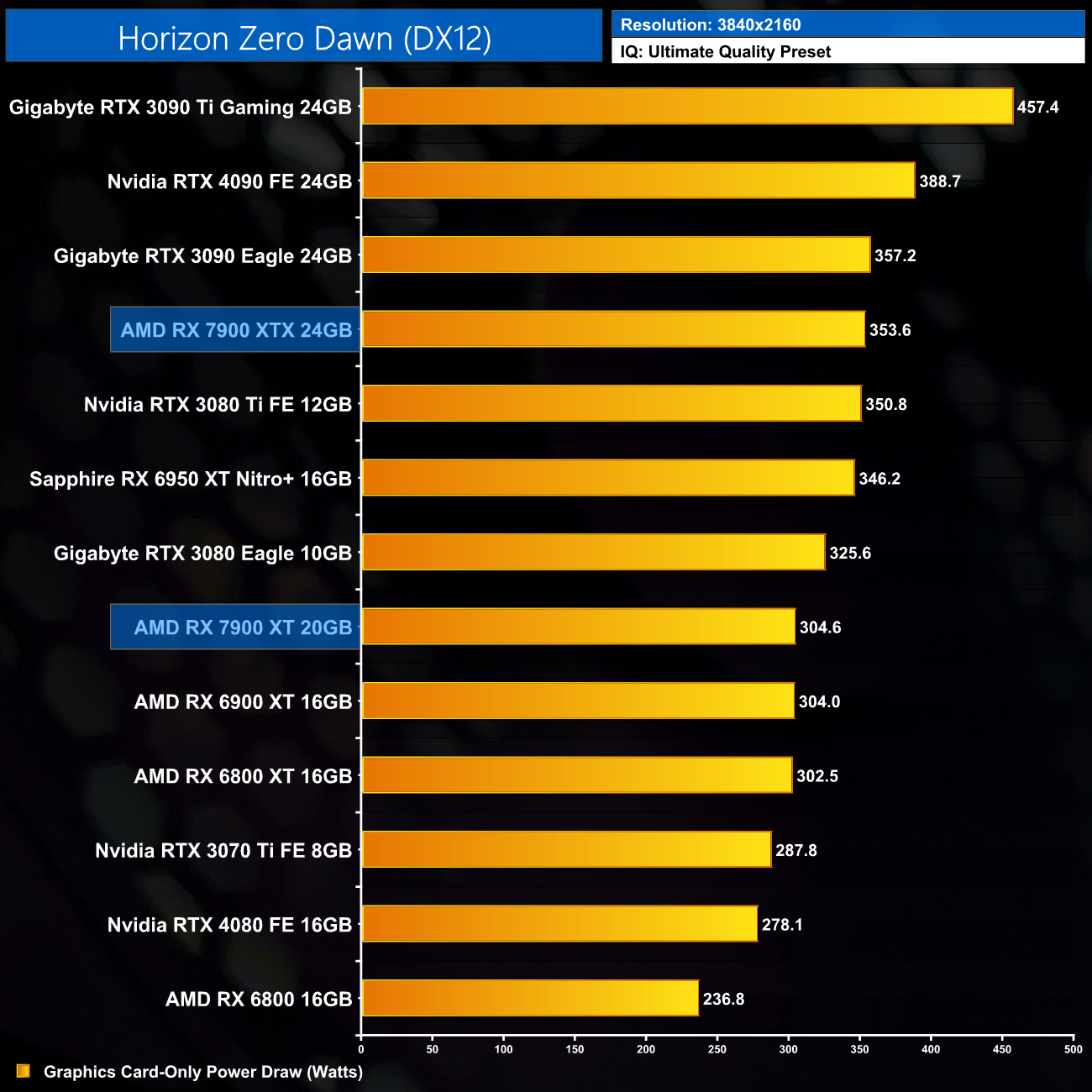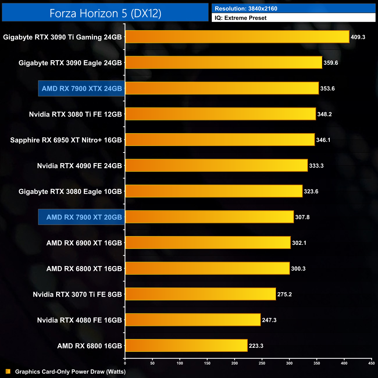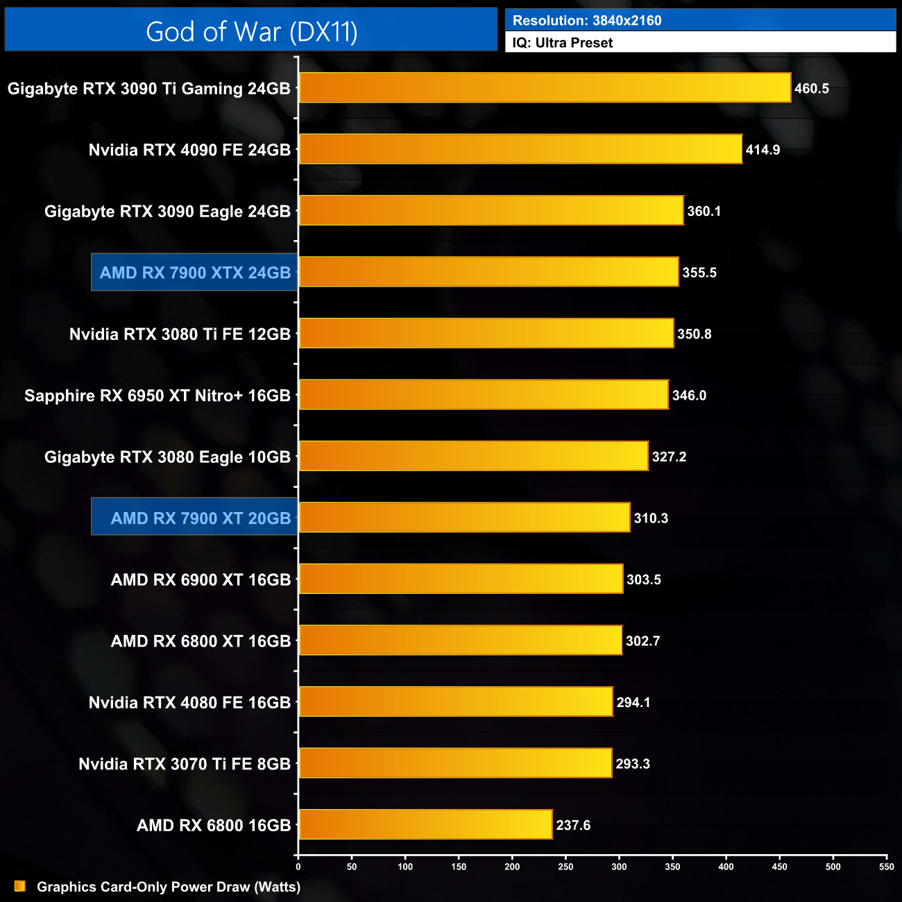 Up at 4K, power draw is again in-line with the rated 355W TBP, averaging 355.7W across the 12 games we tested. This is about 75W more than the RTX 4080 (a 26% difference), despite a 7% delta in gaming performance, something which has clear implications for efficiency, as we are about to see.