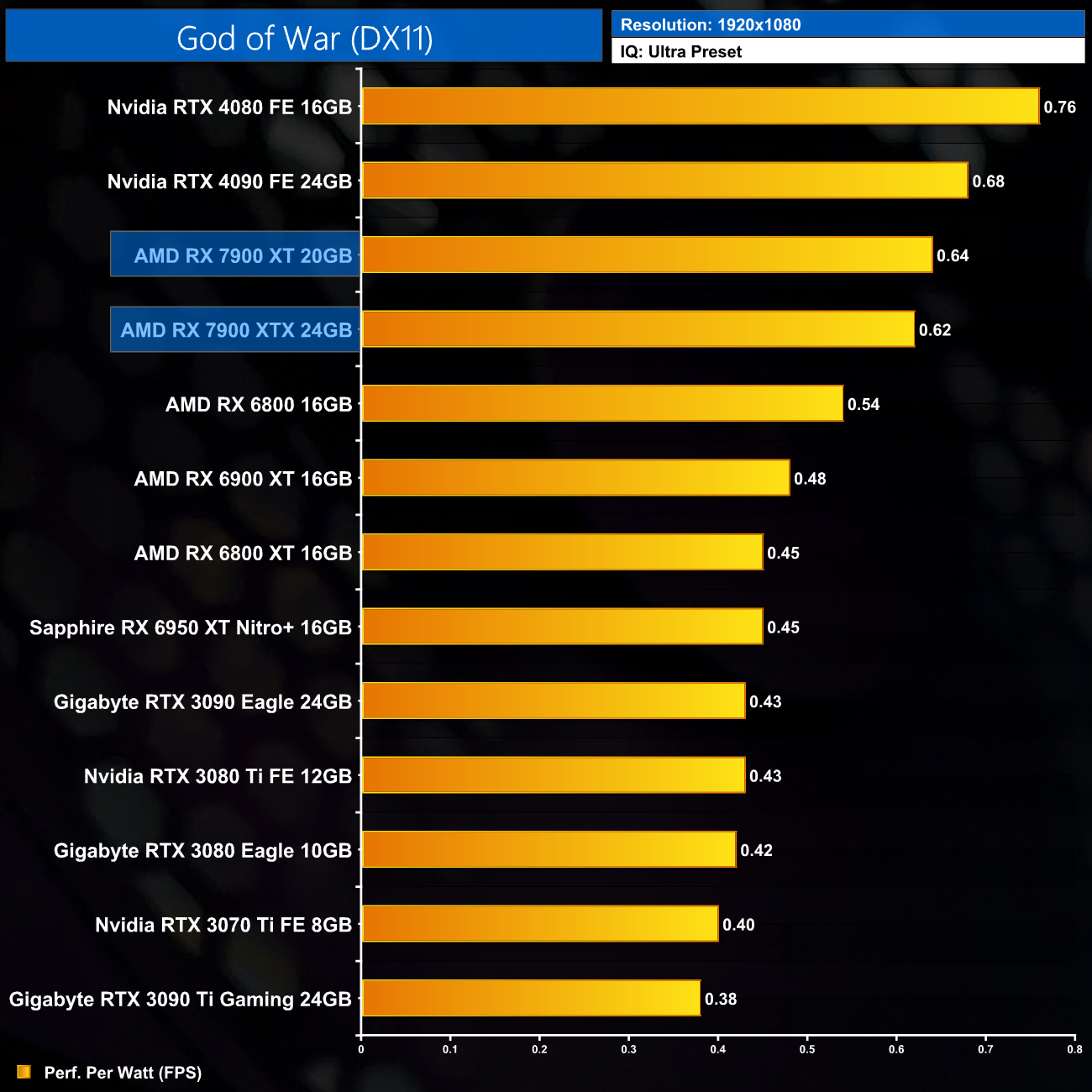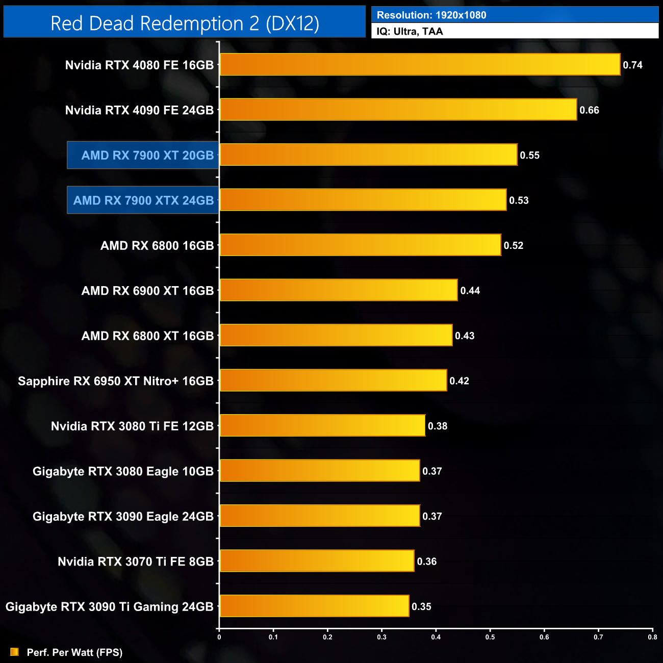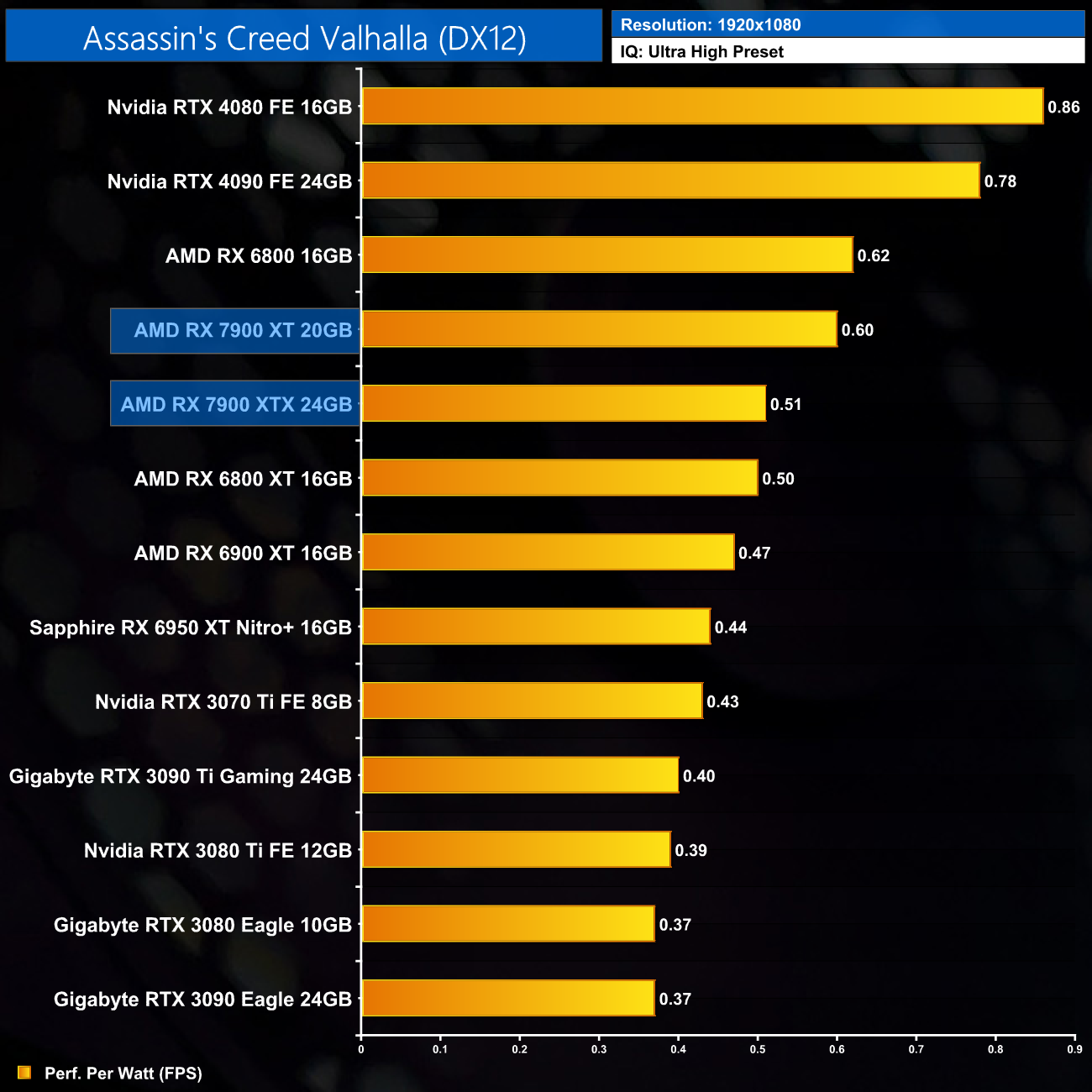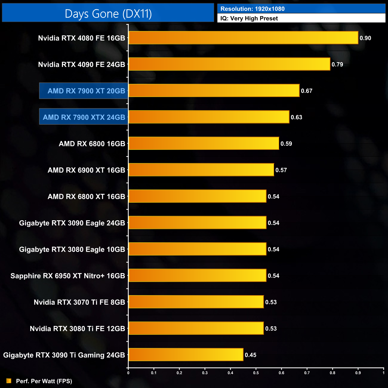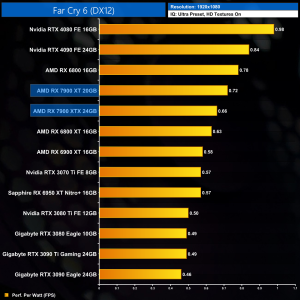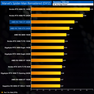 Using the graphics card-only power draw figures presented earlier in the review, here we present performance per Watt on a per-game basis for all twelve games we tested at 1080p.