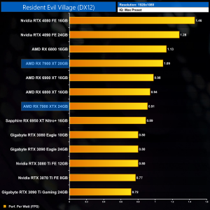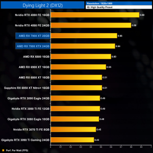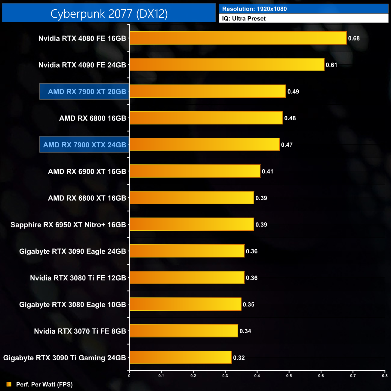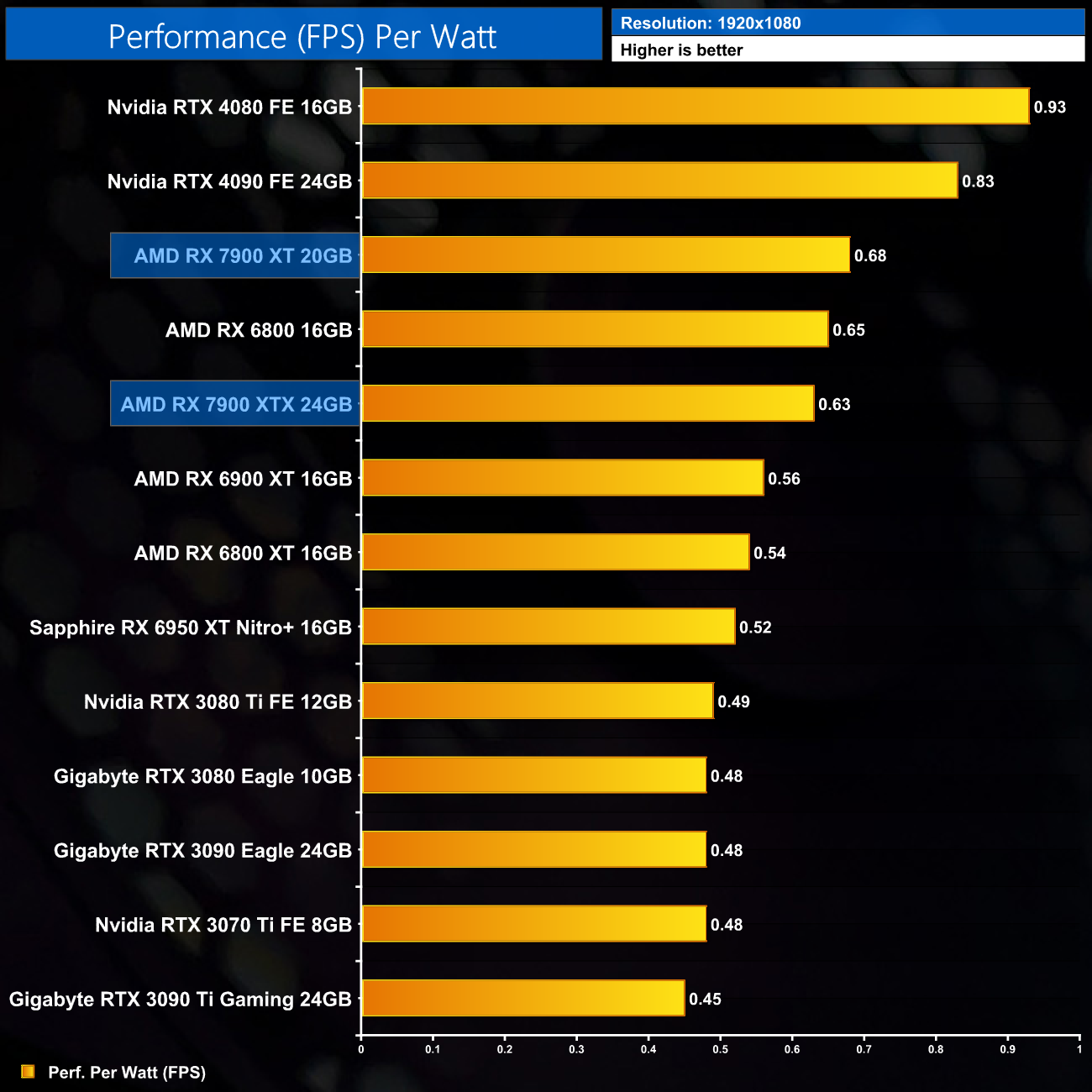 Looking now at performance per Watt, 1080p isn't a particularly realistic scenario for these GPUs, but it's interesting nonetheless – the RX 7900 XTX is actually slightly less efficient than the RX 6800, and is quite a ways behind the RTX 40-series GPUs.