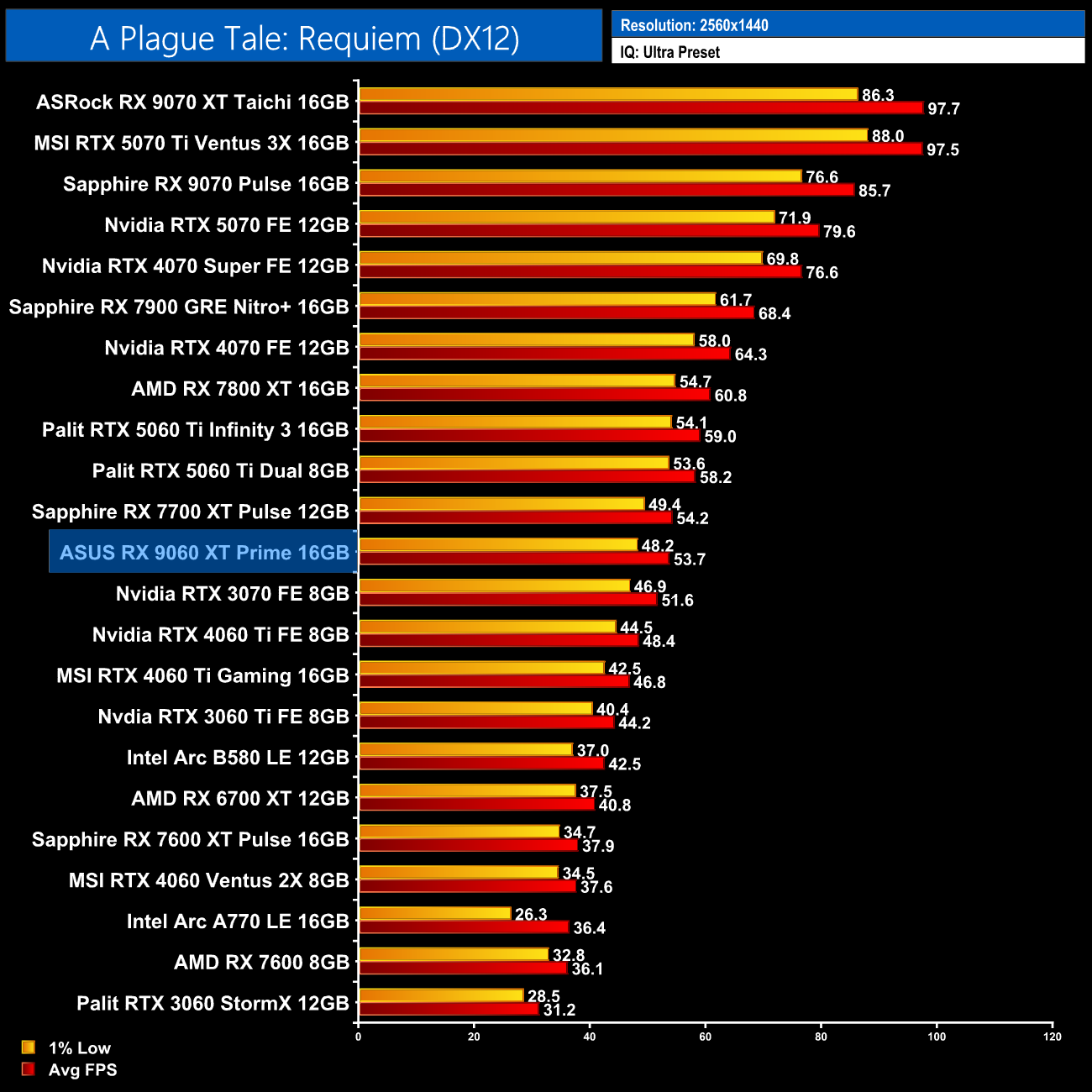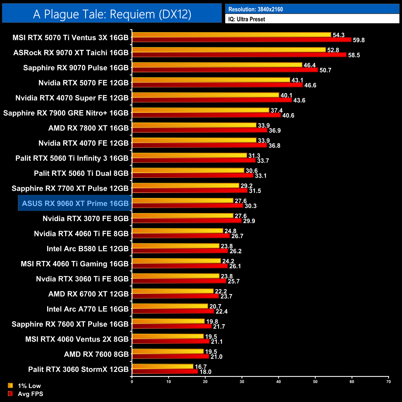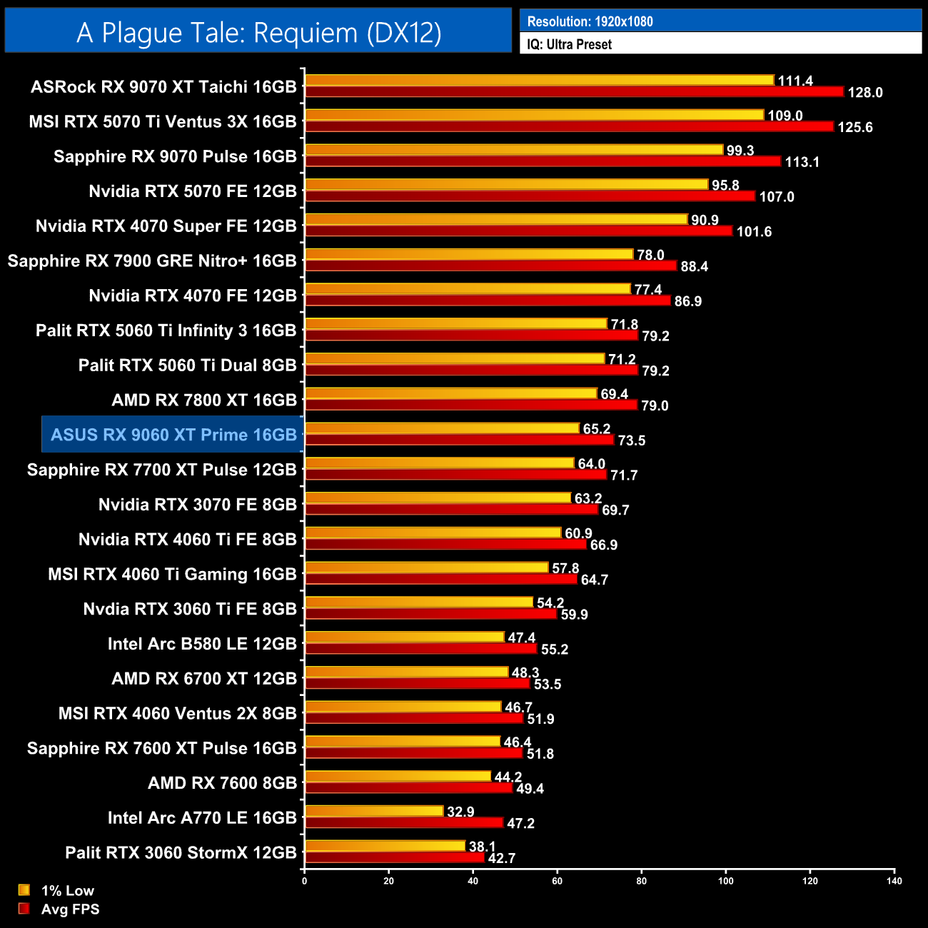 A Plague: Tale Requiem is next and we get more decent performance at 1080p from the 9060 XT 16GB, averaging 74fps and making it 7% slower than both 5060 Ti models.