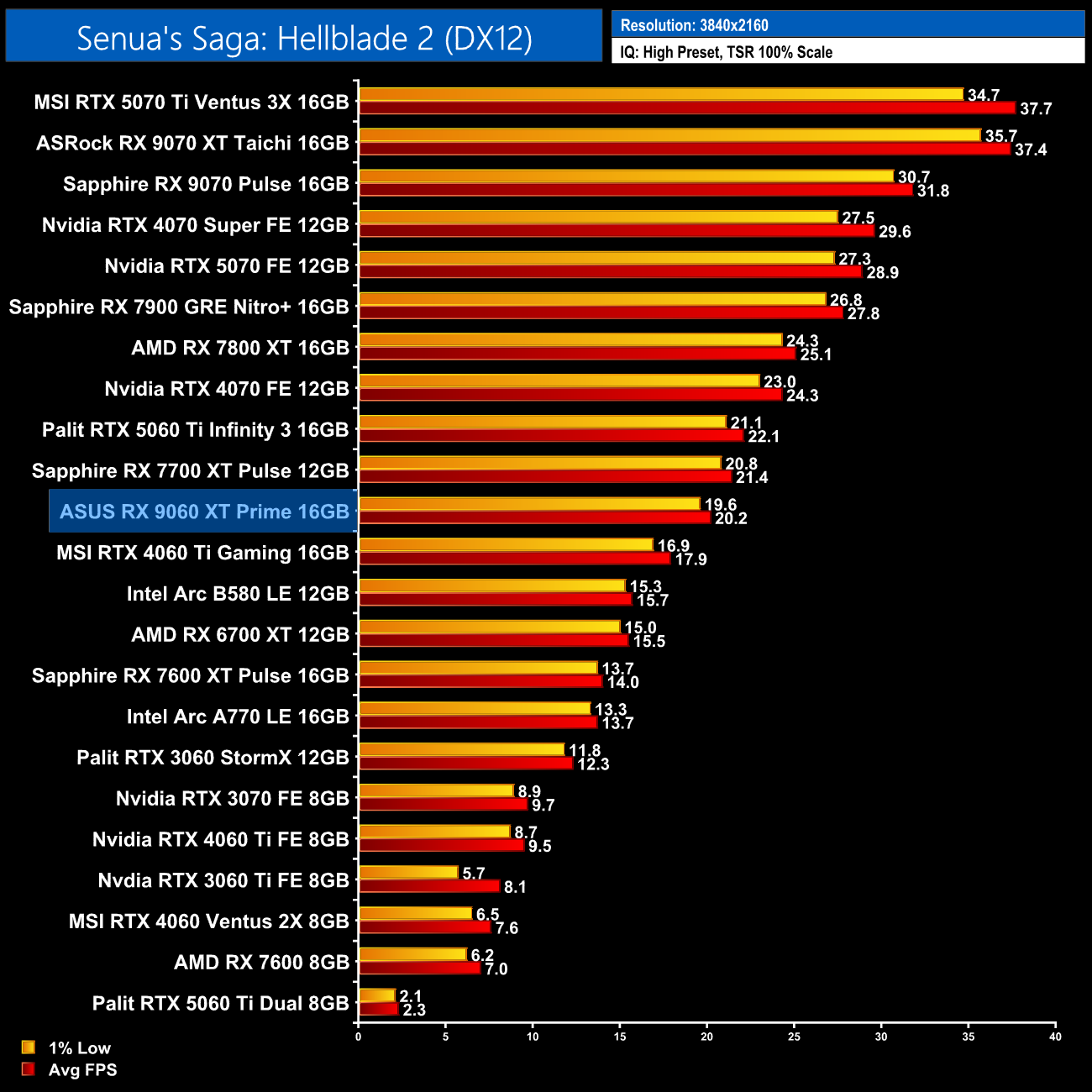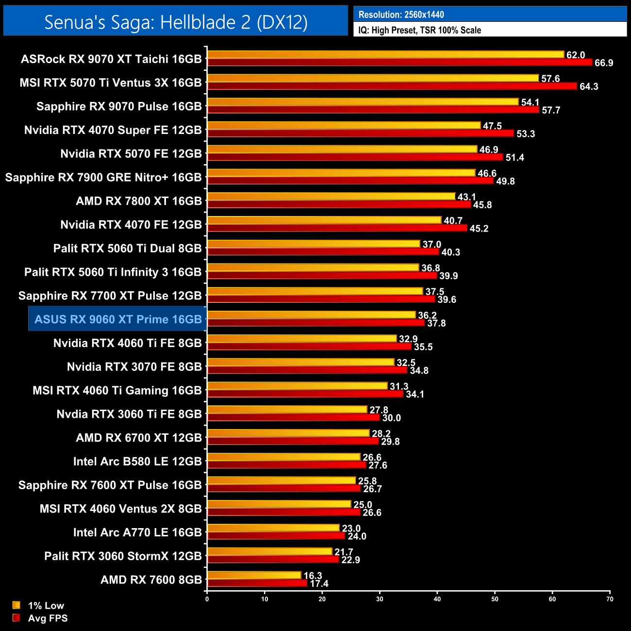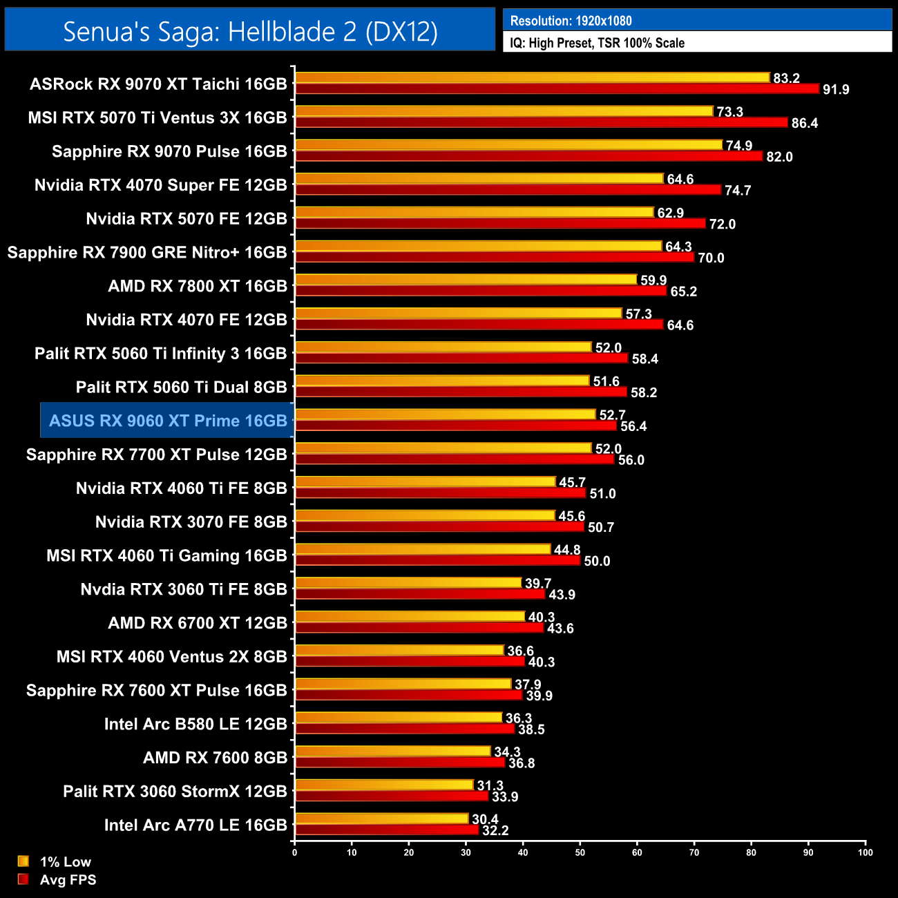 Senua's Saga: Hellblade 2 is another title where things are very even between the 9060 XT 16GB and the two 5060 Ti models – there's no benefit to more than 8GB VRAM here, and all three GPUs average just below 60fps at 1080p.