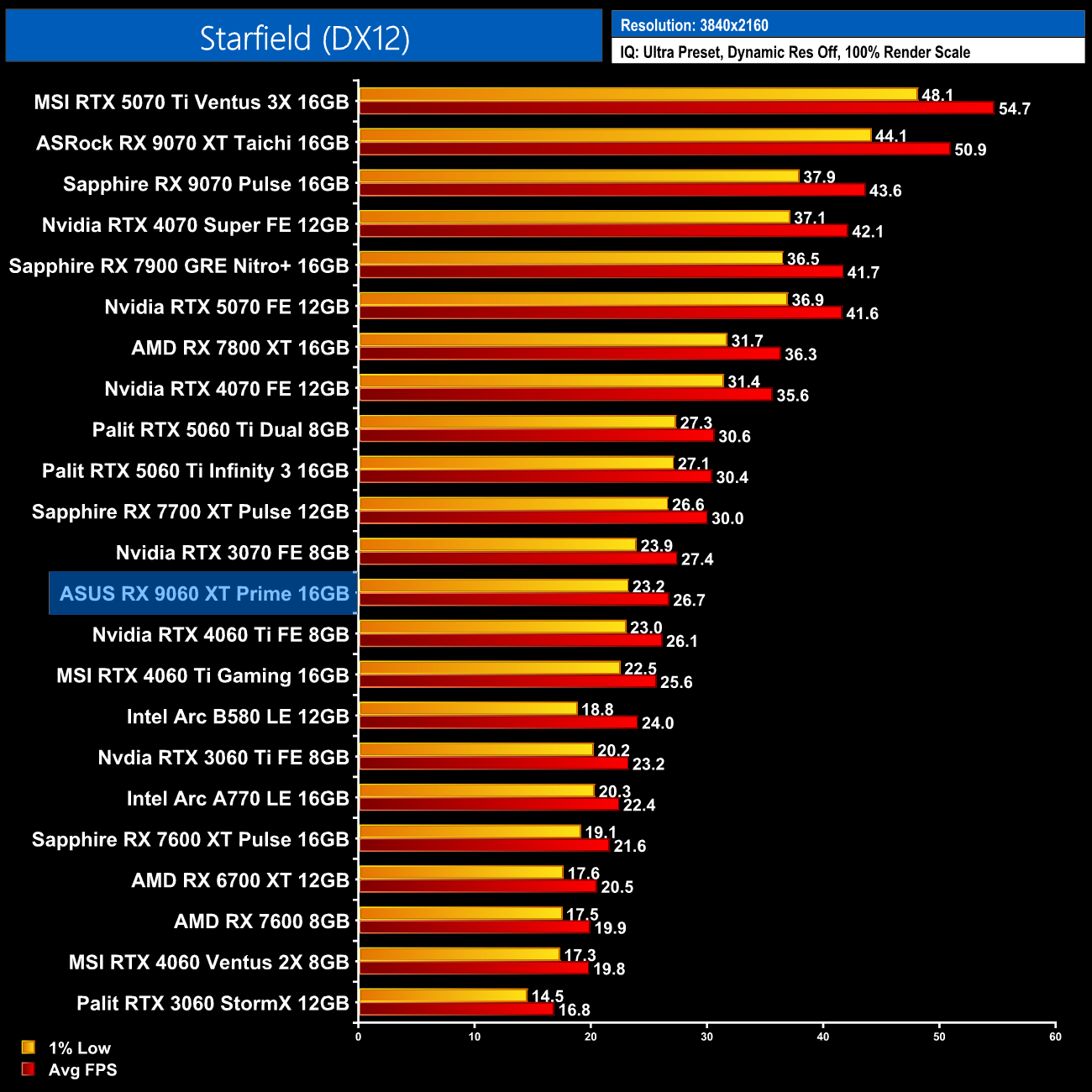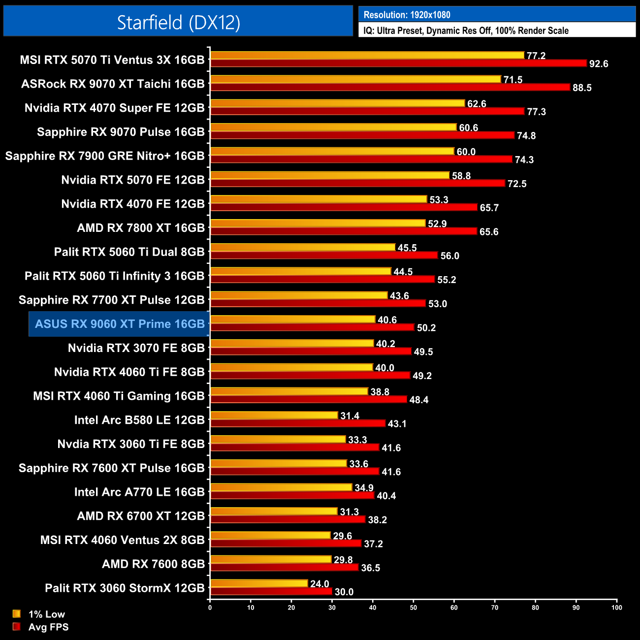 Lastly, we close up with Starfield, a game that used to favour AMD hardware but several updates and possibly driver tweaks have changed that behaviour. Still, 50fps at 1080p isn't bad, though it's a touch behind the 7700 XT and 9% slower than the 5060 Ti 16GB.