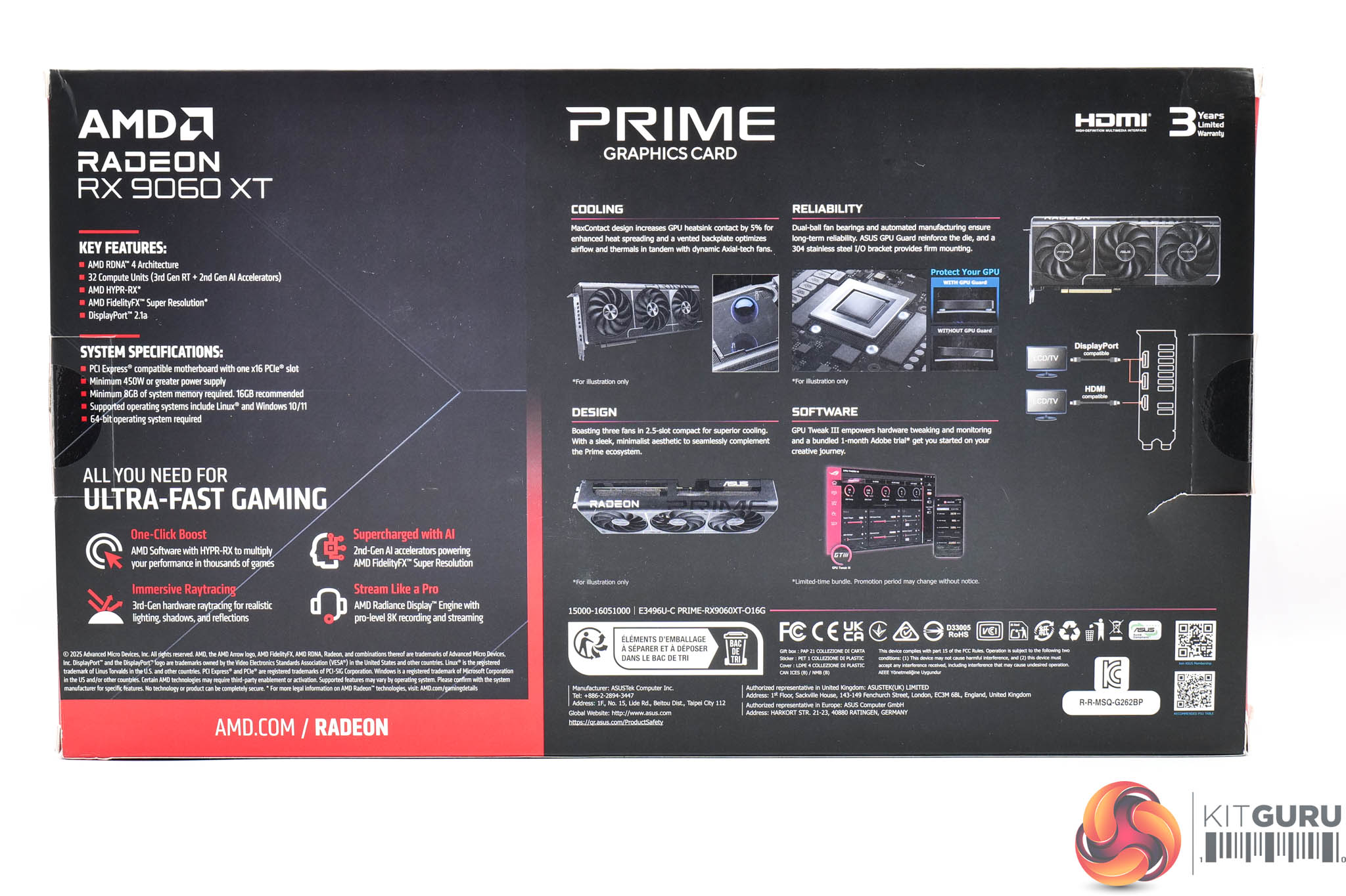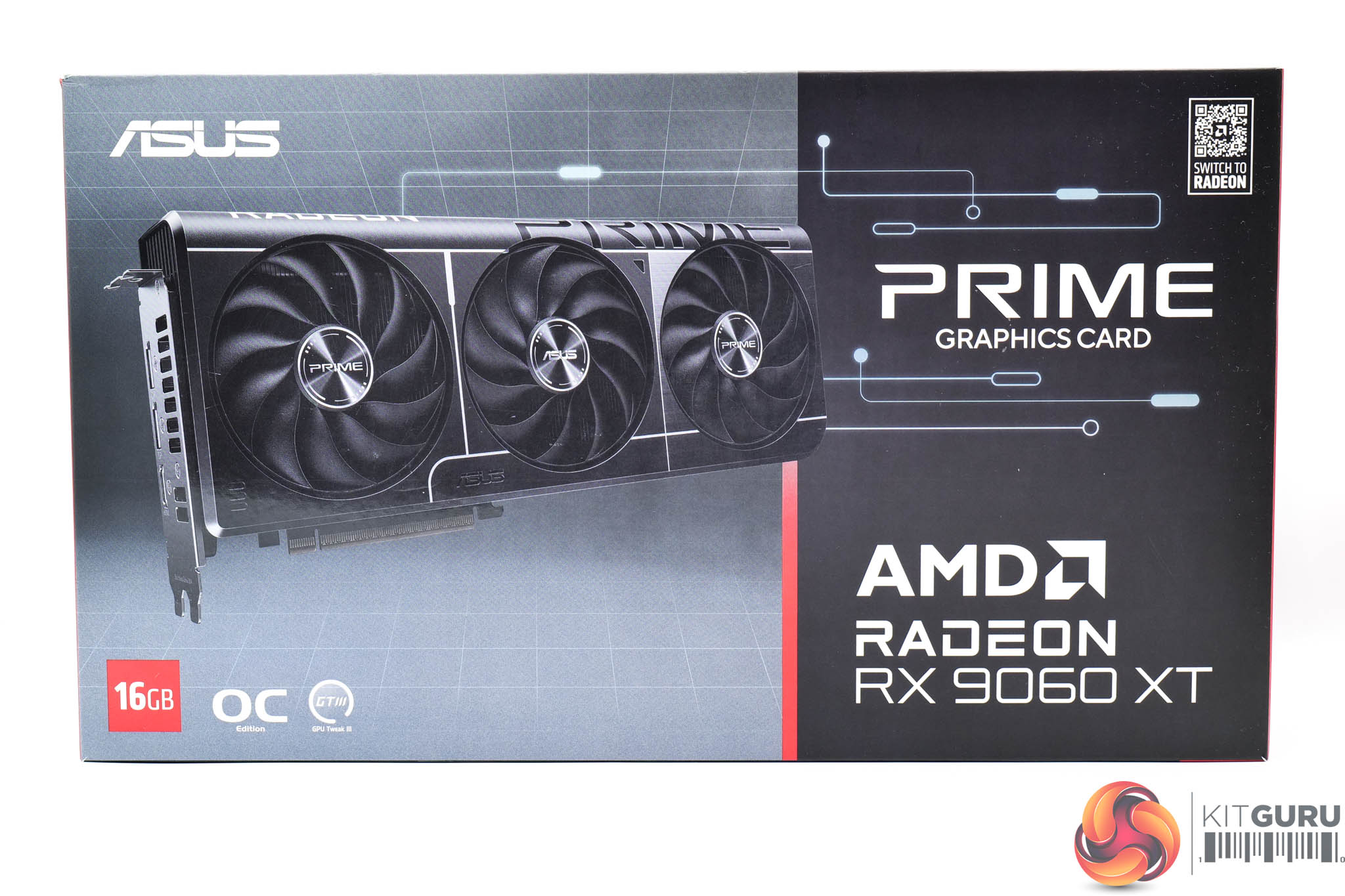 The ASUS RX 9060 XT Prime 16GB ships in a grey and black box, with an image of the card visible on the front, alongside ASUS and AMD branding.