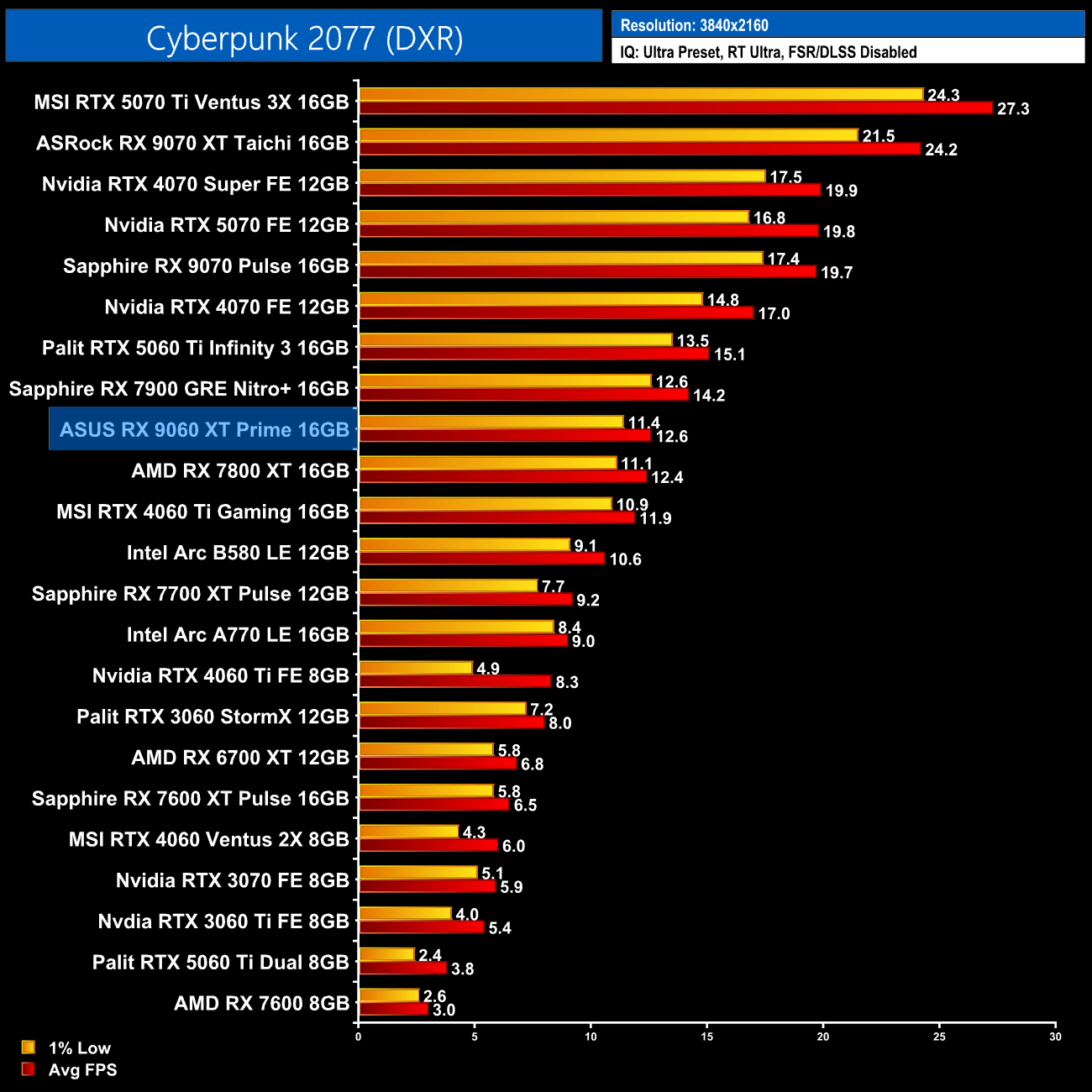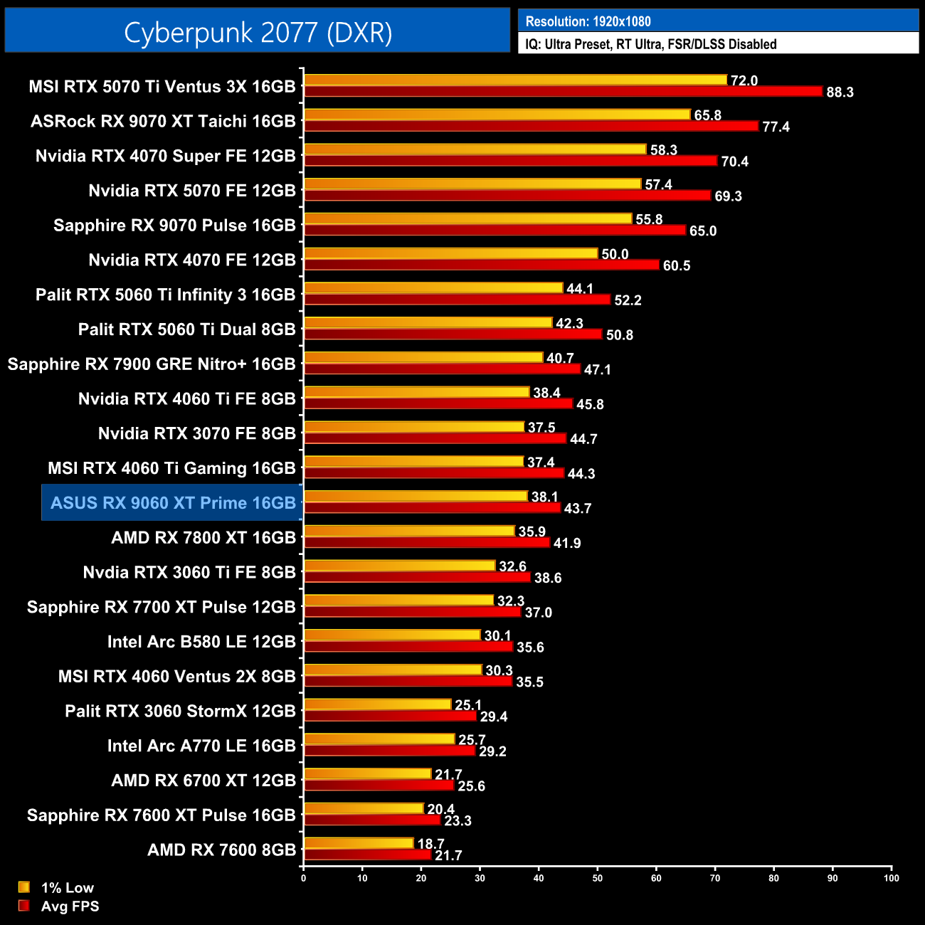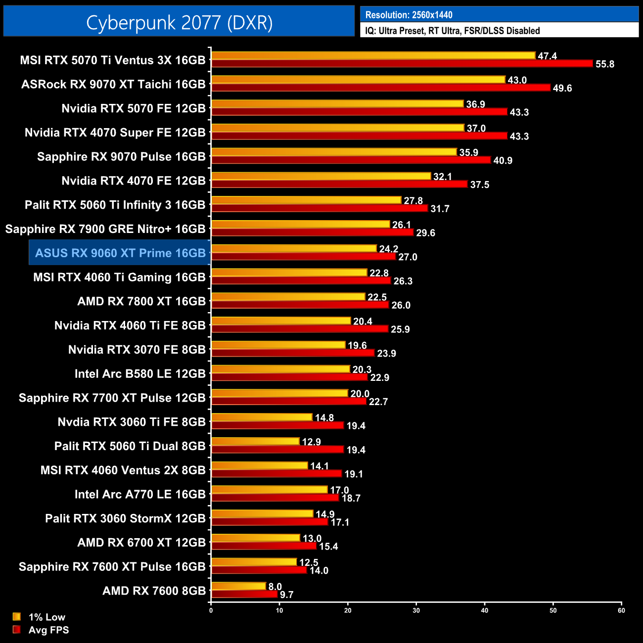 Cyberpunk 2077 isn't so bad though, using the Ultra preset but with no upscaling. Here the 9060 XT 16GB managed 47fps, making it a touch faster than the 7800 XT, but of course still well behind Nvidia as it's about 16% slower than the 5060 Ti 16GB.