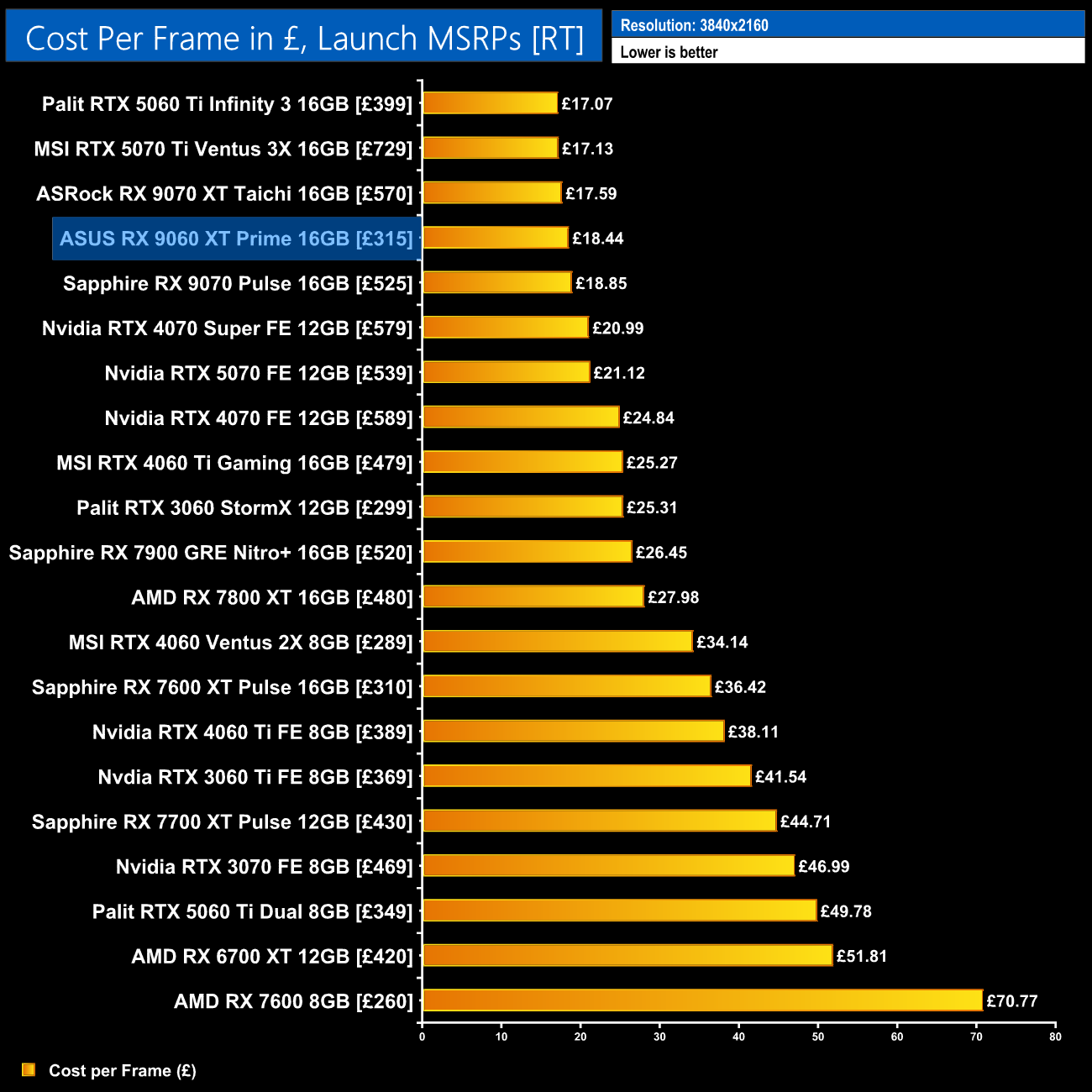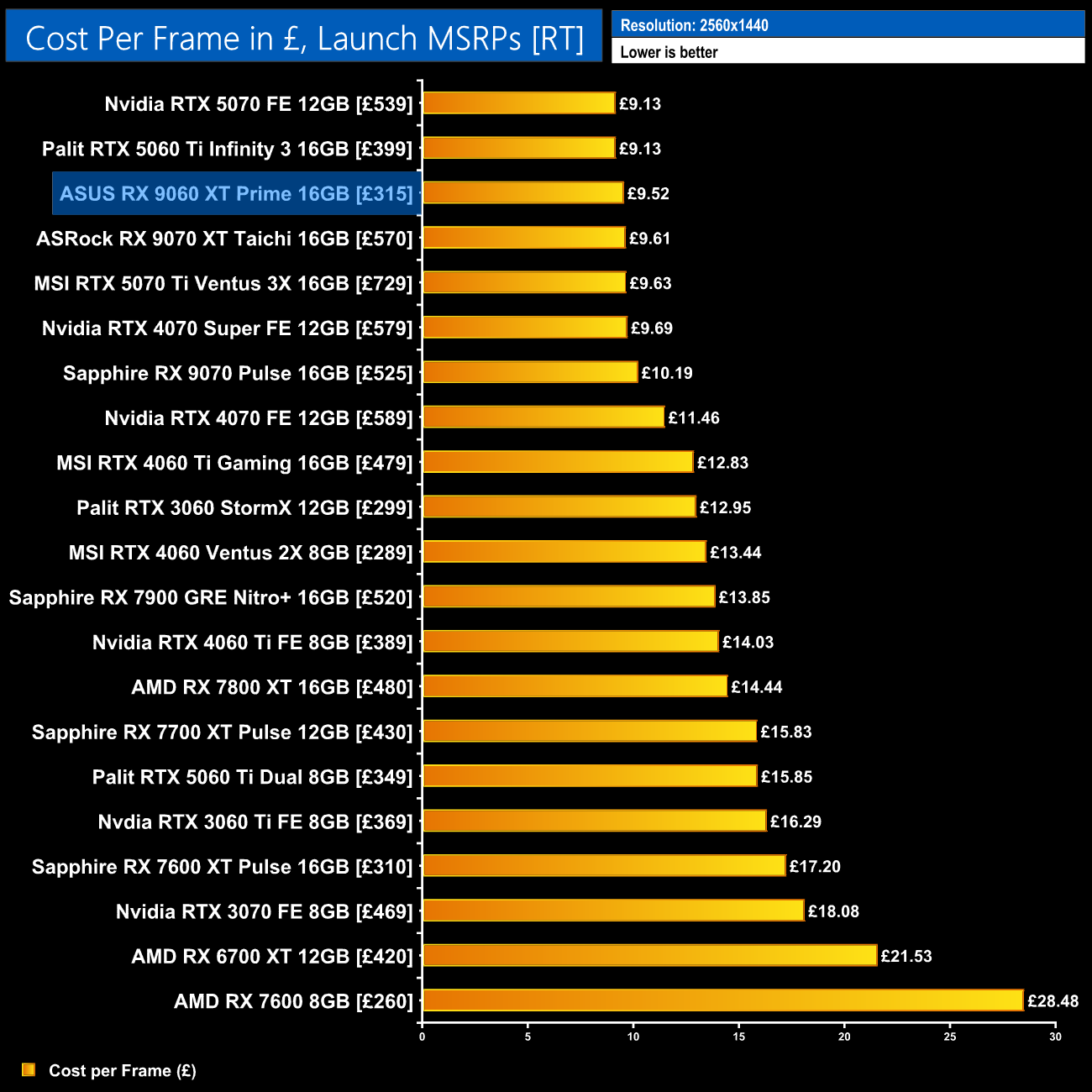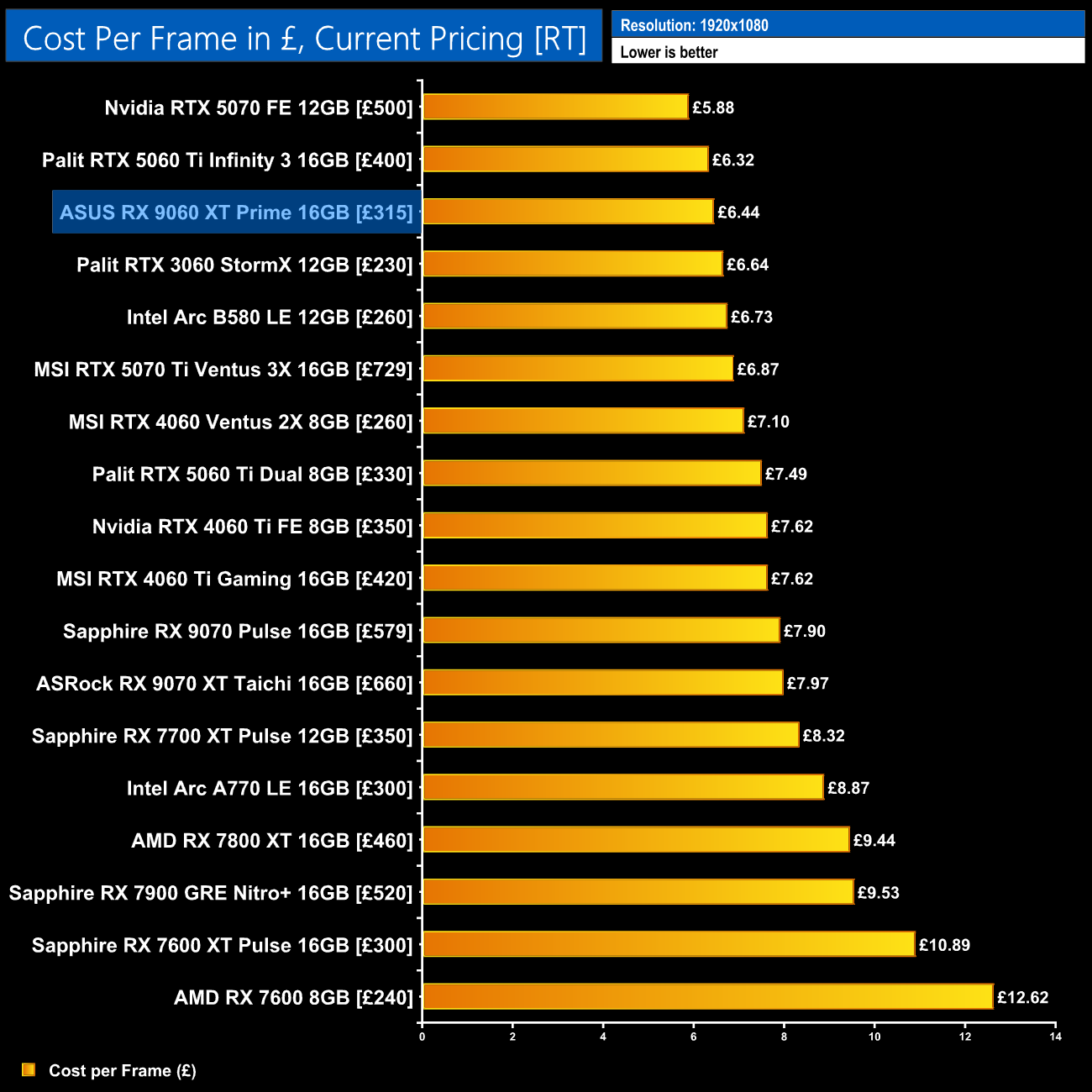 The same goes for the data based on current pricing – the RTX 5070 at £500 is the ray tracing value champ, but the 9060 XT 16GB is still very compelling at £315.
