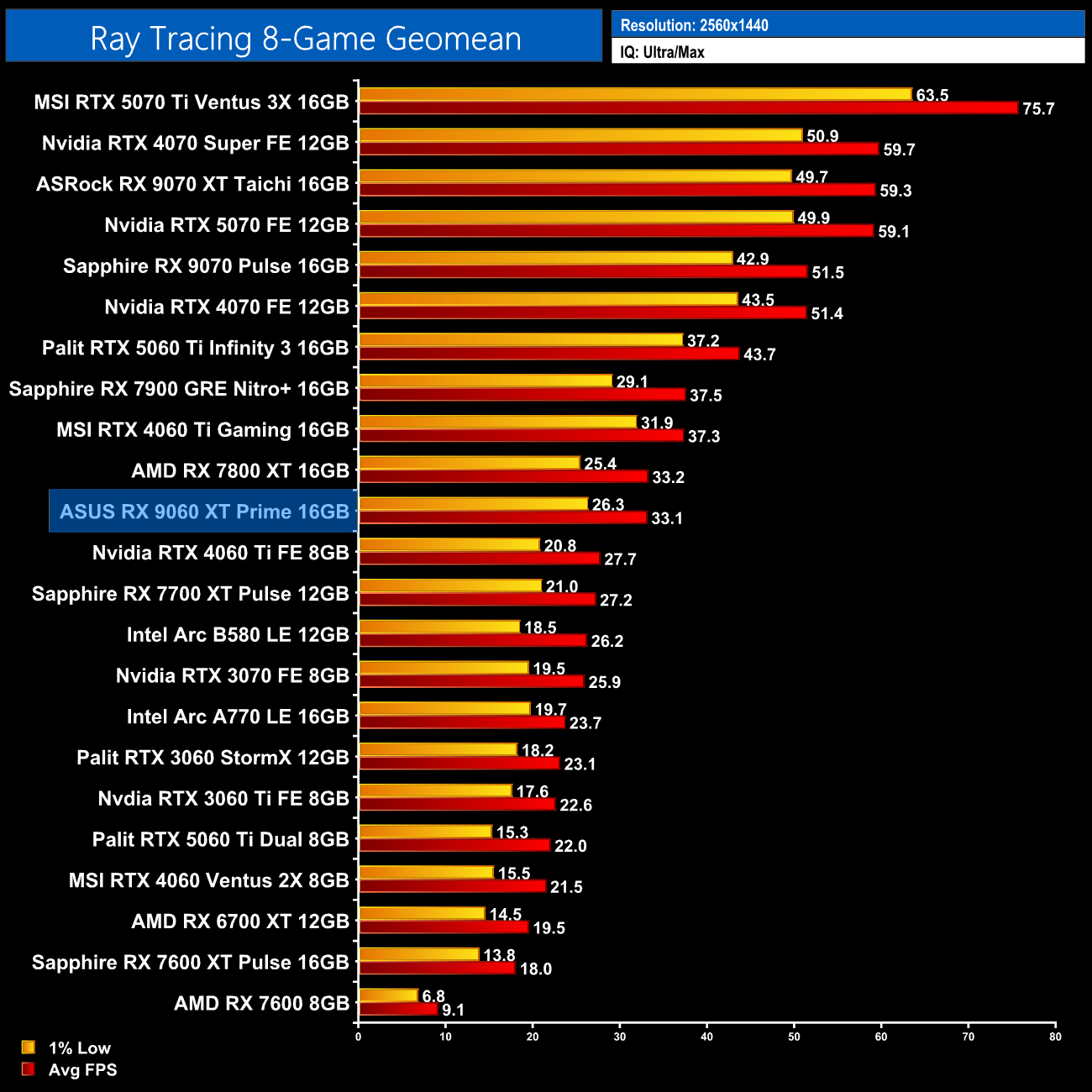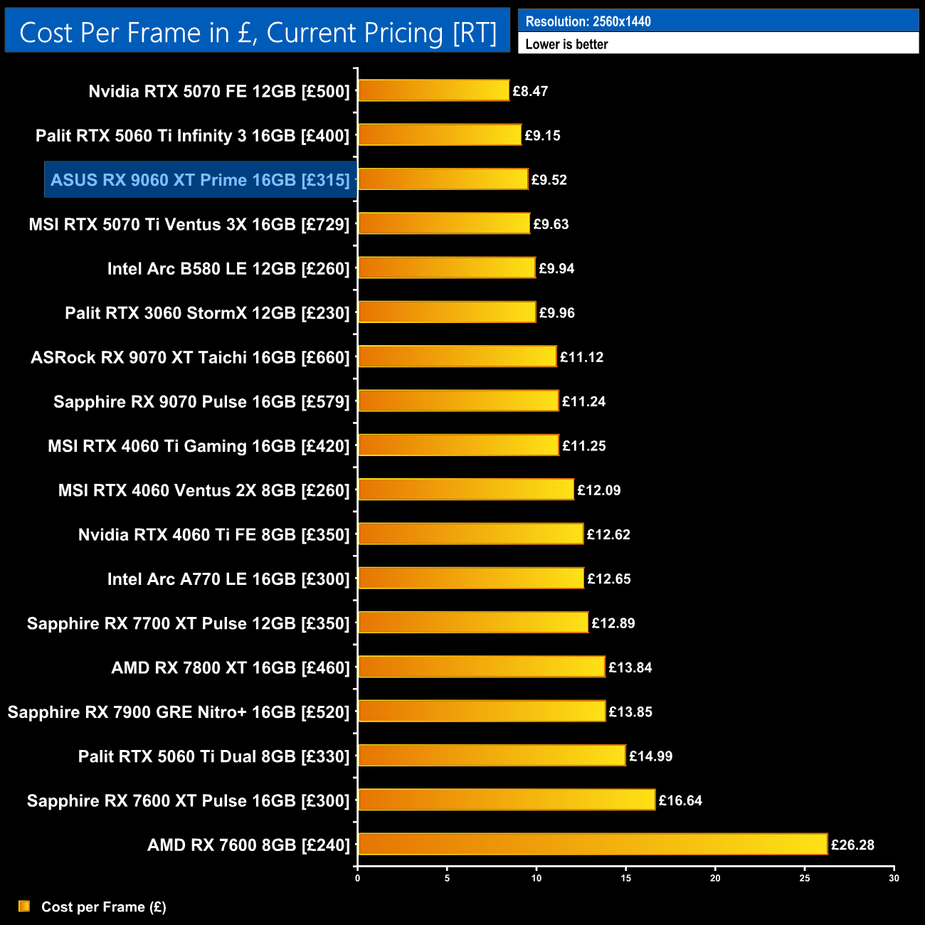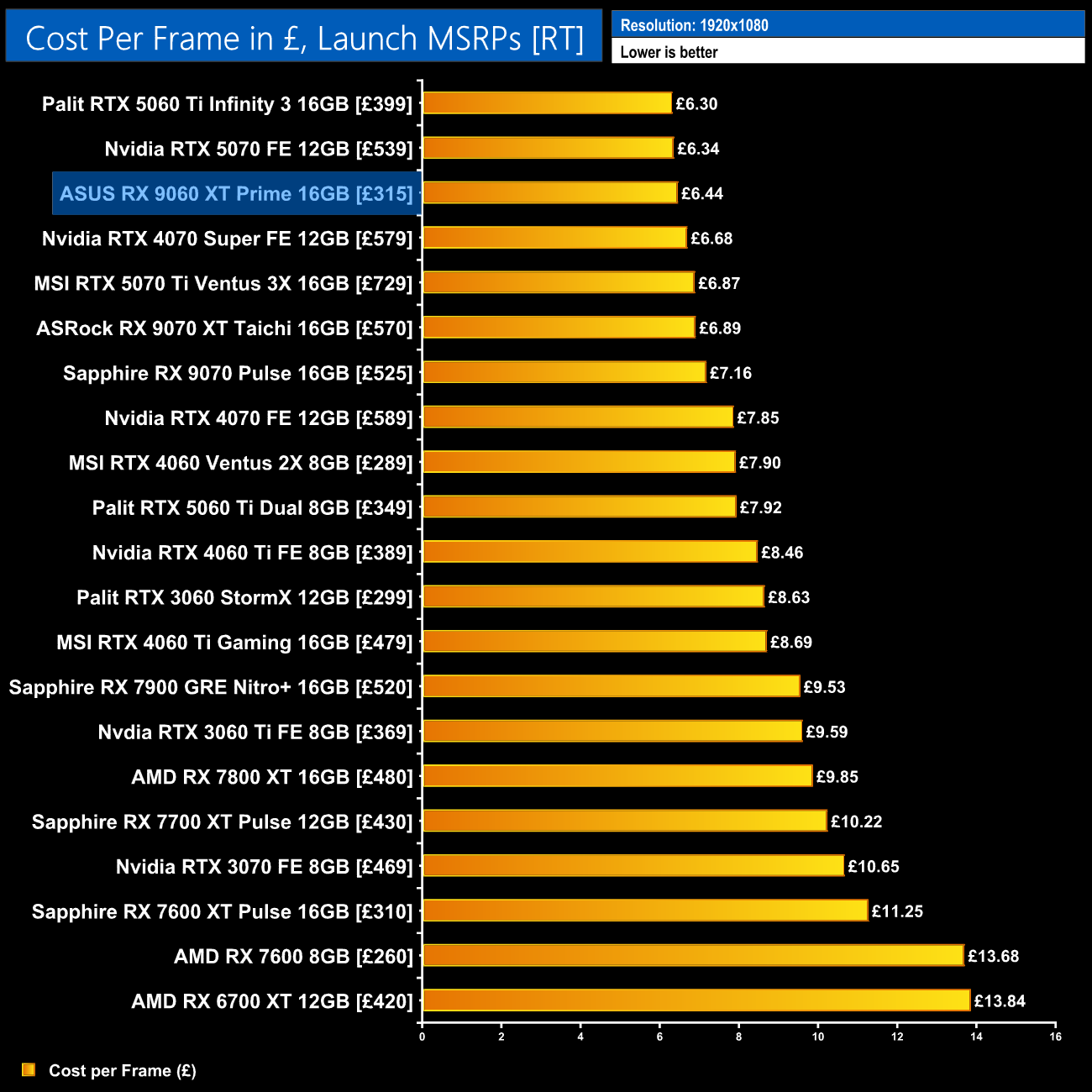 The same goes for the data based on current pricing – the RTX 5070 at £500 is the ray tracing value champ, but the 9060 XT 16GB is still very compelling at £315.