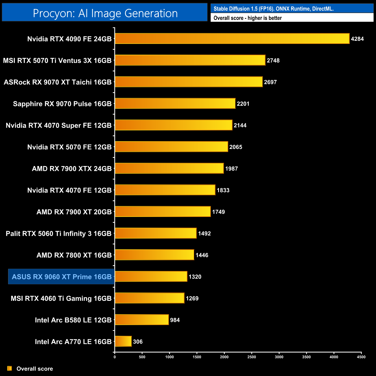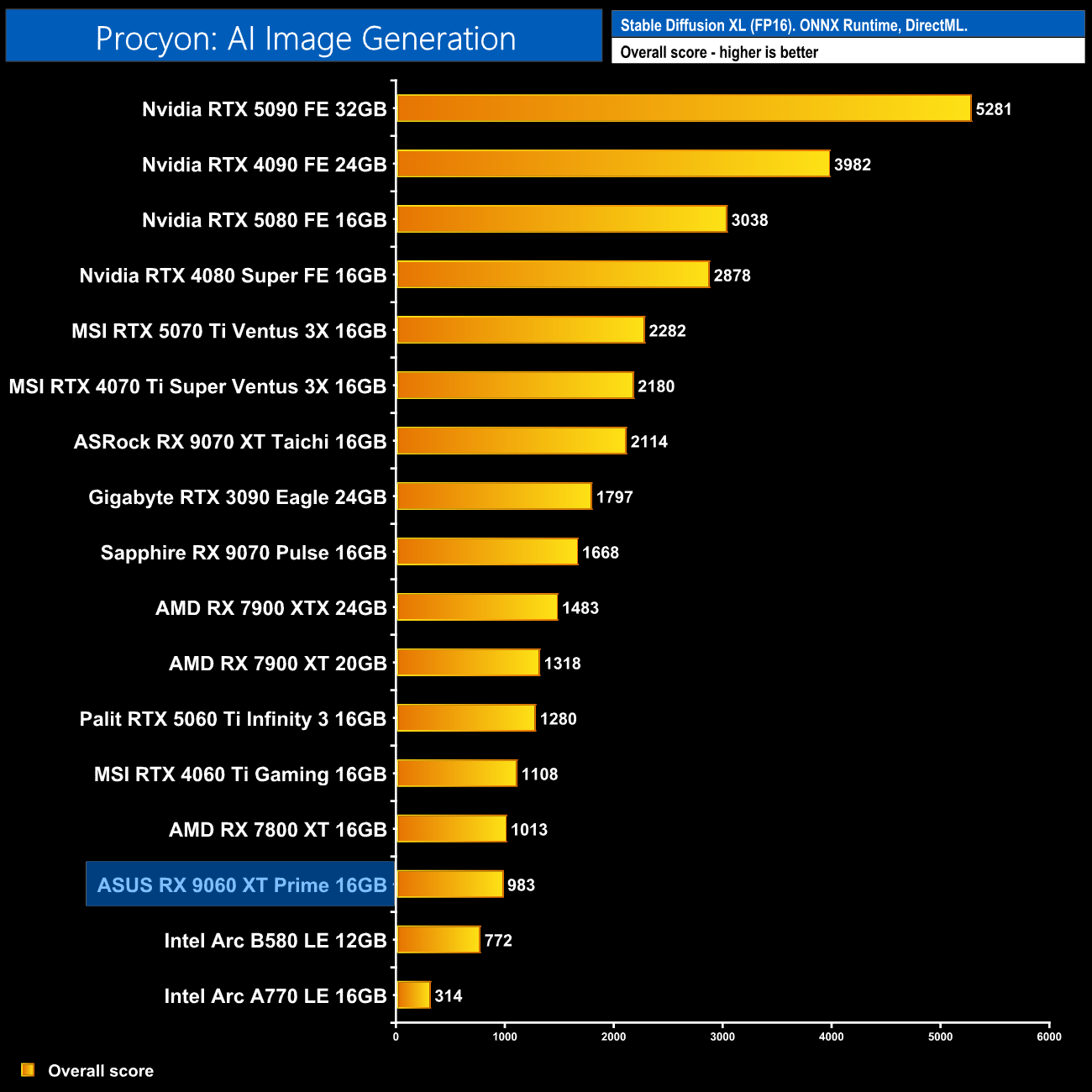 The deficit against the 5060 Ti 16GB grows to 23% in the Stable Diffusion XL test, though performance here is about level with the 7800 XT.