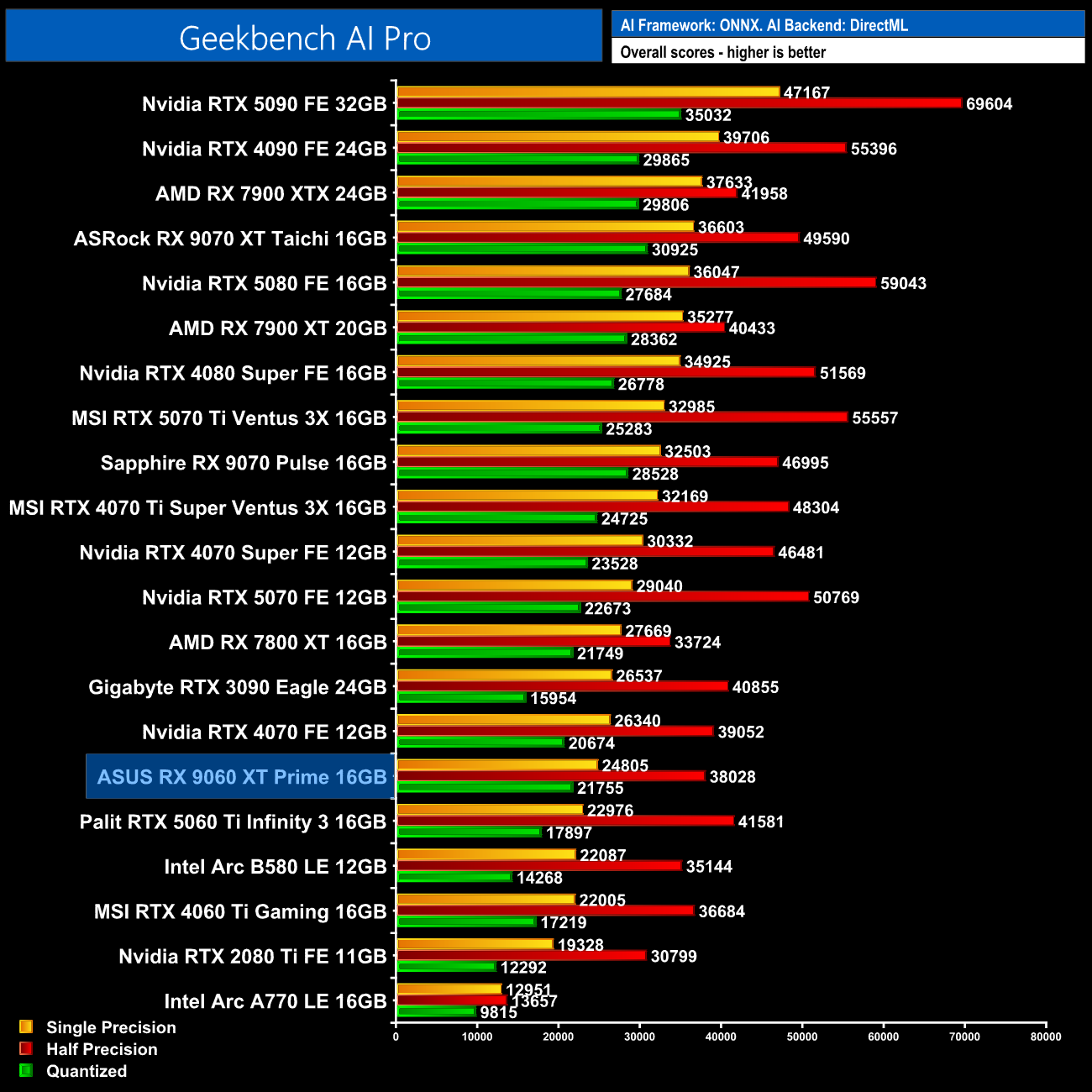 Closing out with Geekbench AI Pro, AMD does very well in the single precision test, coming out ahead of the 5060 Ti 16GB, though the half precision result shows much more ‘mixed' performance, though even that shows a big gain versus the 7800 XT.