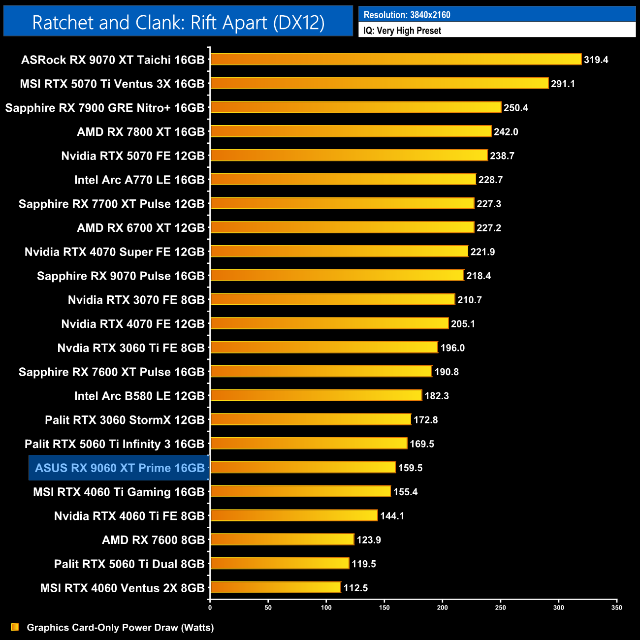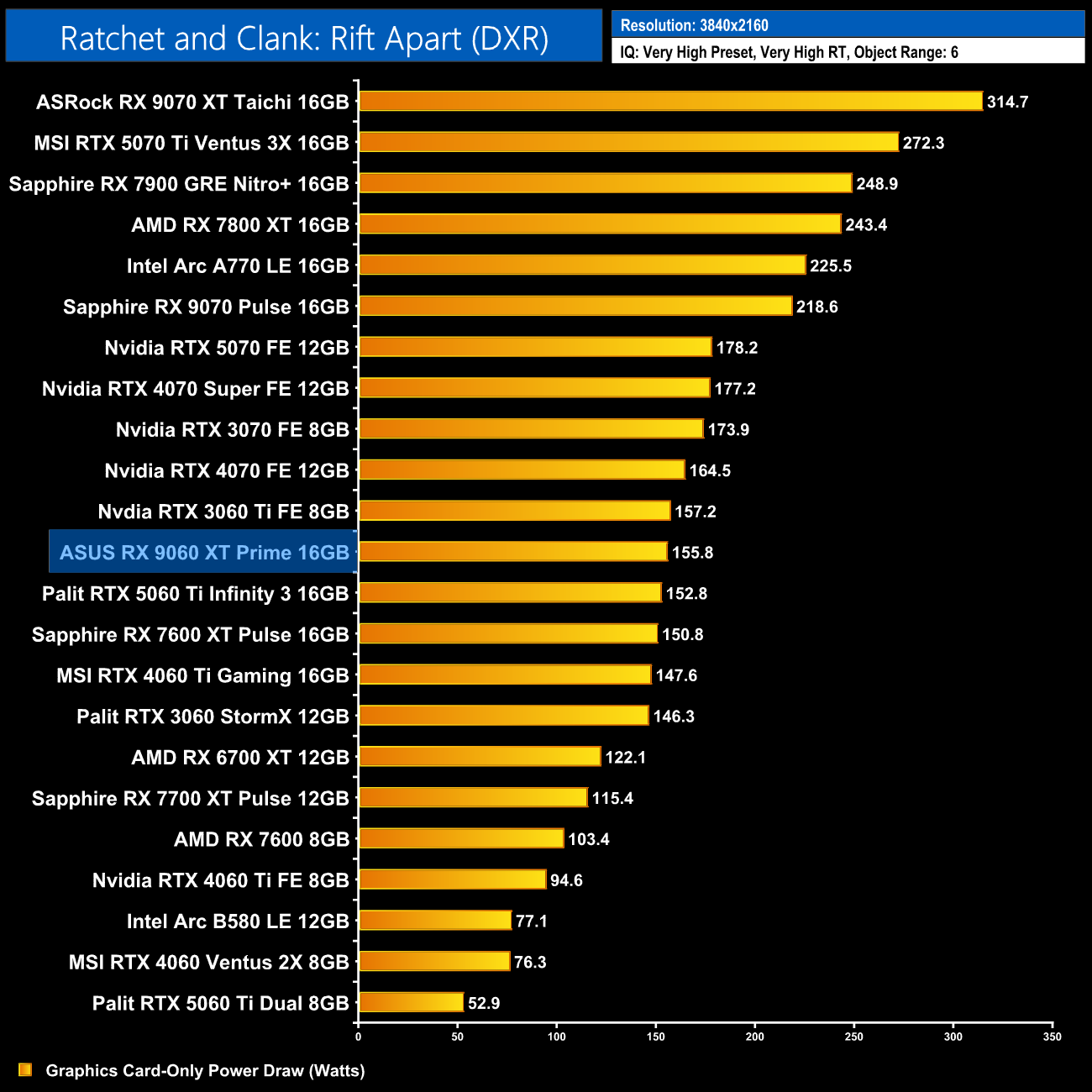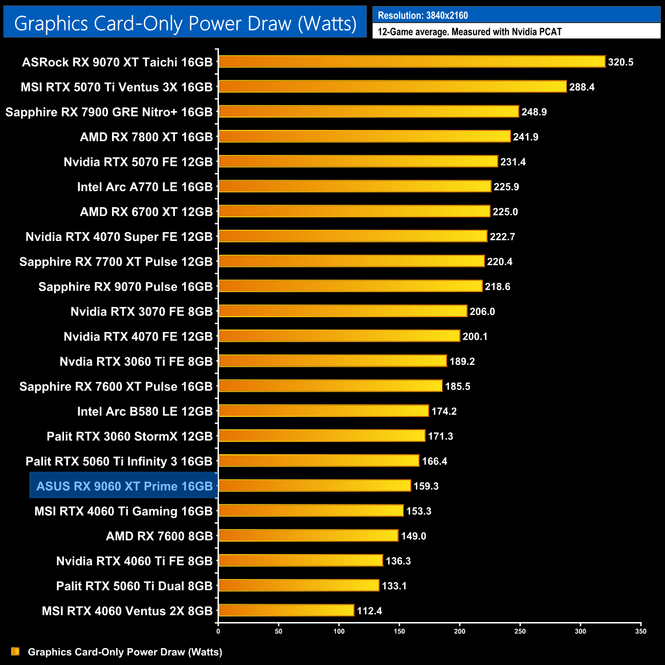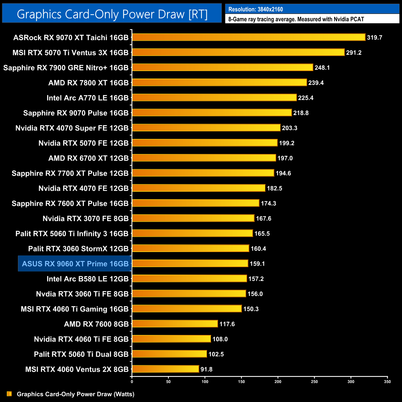 We also test at 4K, but I don't think that's a realistic scenario for this GPU – but power is now slightly below the 5060 Ti 16GB.