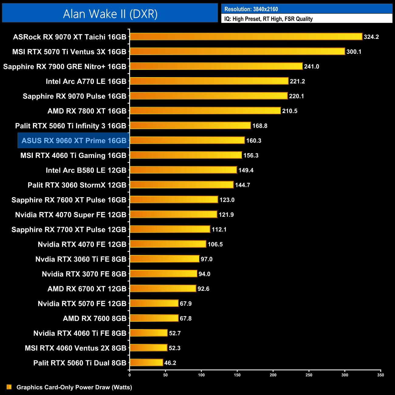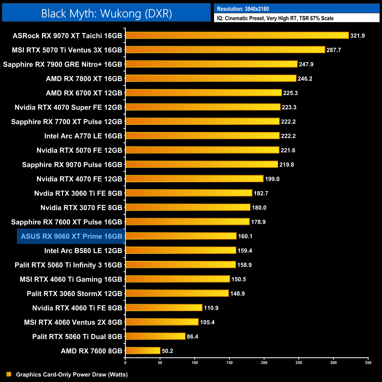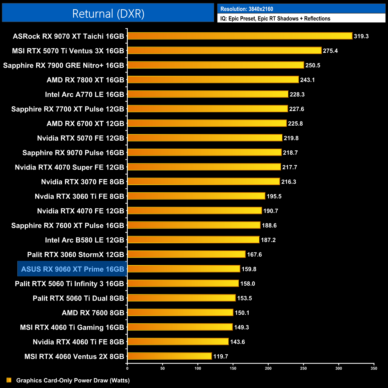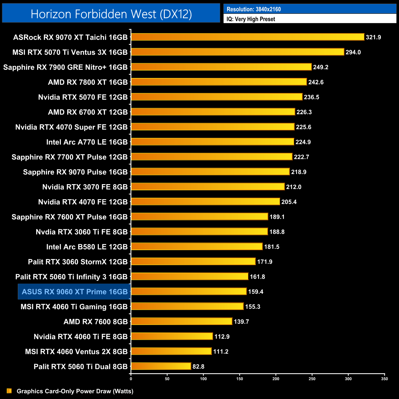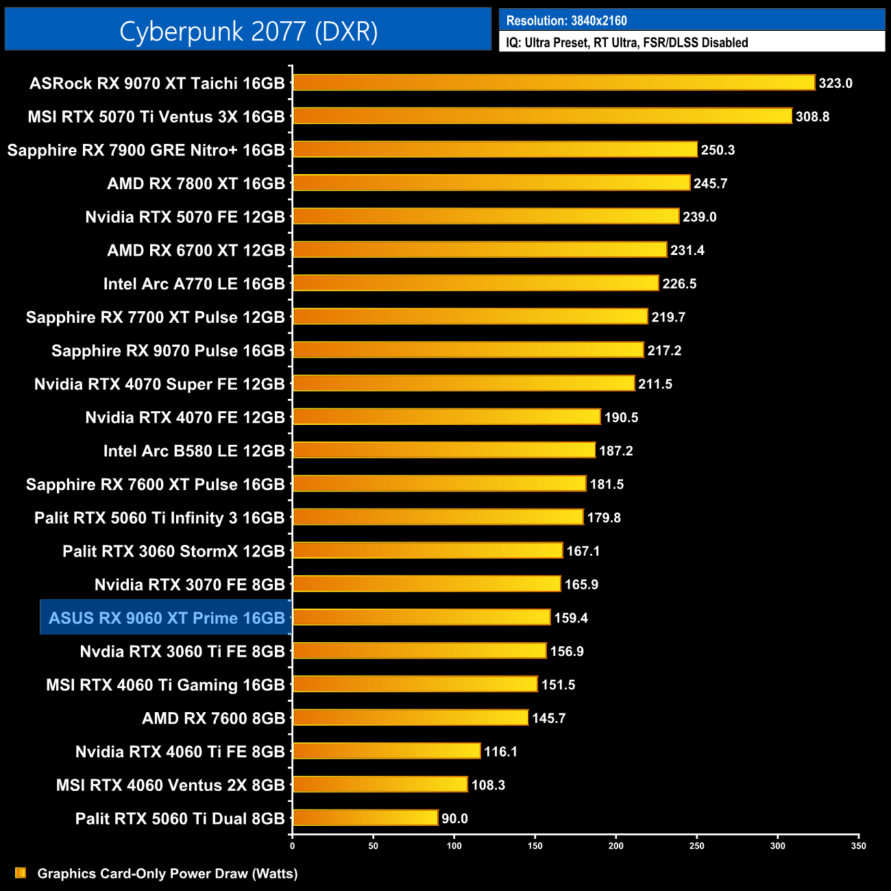 We also test at 4K, but I don't think that's a realistic scenario for this GPU – but power is now slightly below the 5060 Ti 16GB.