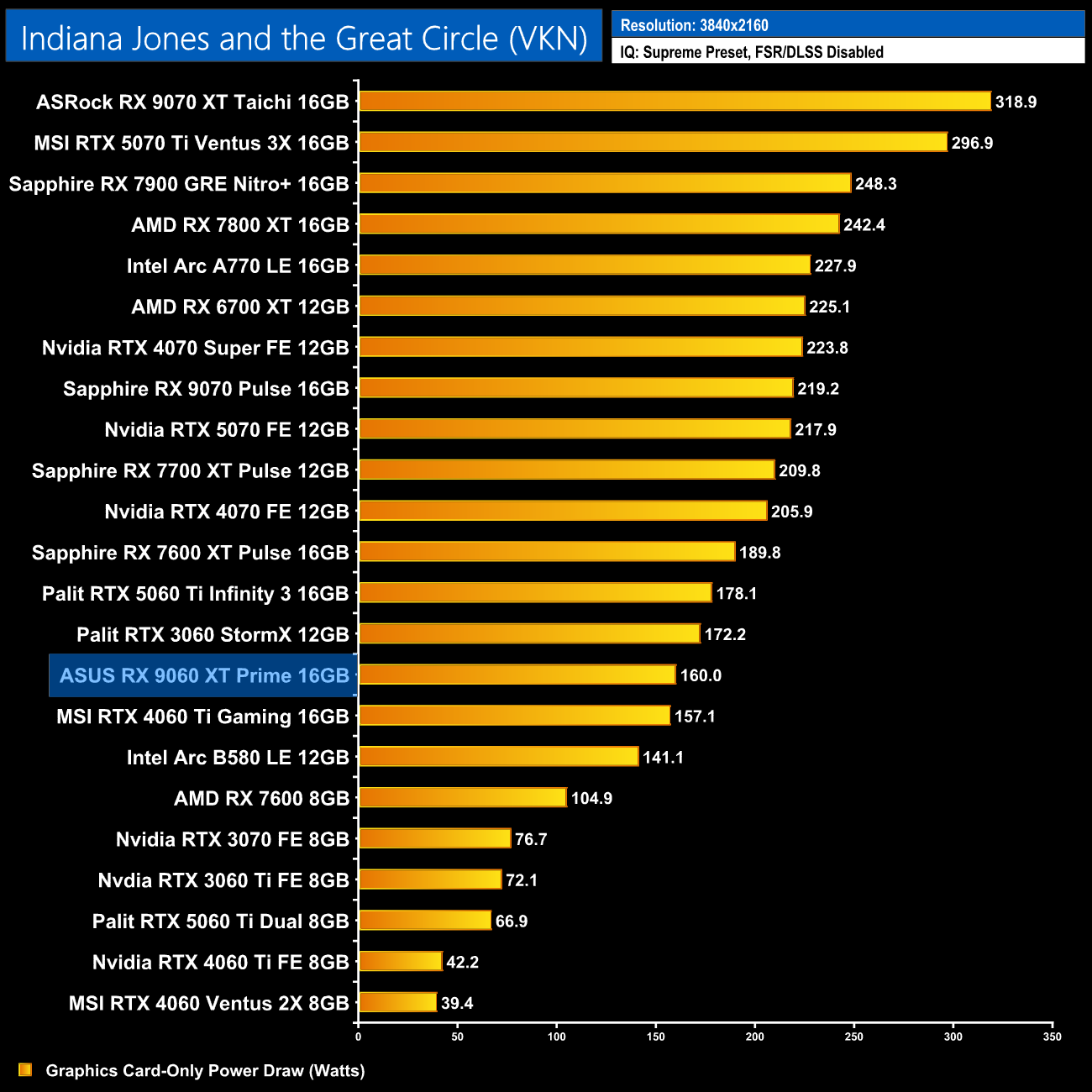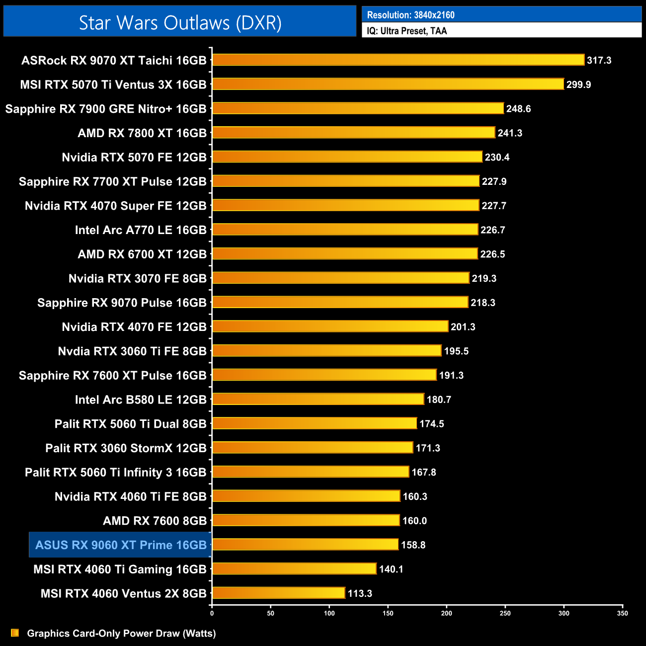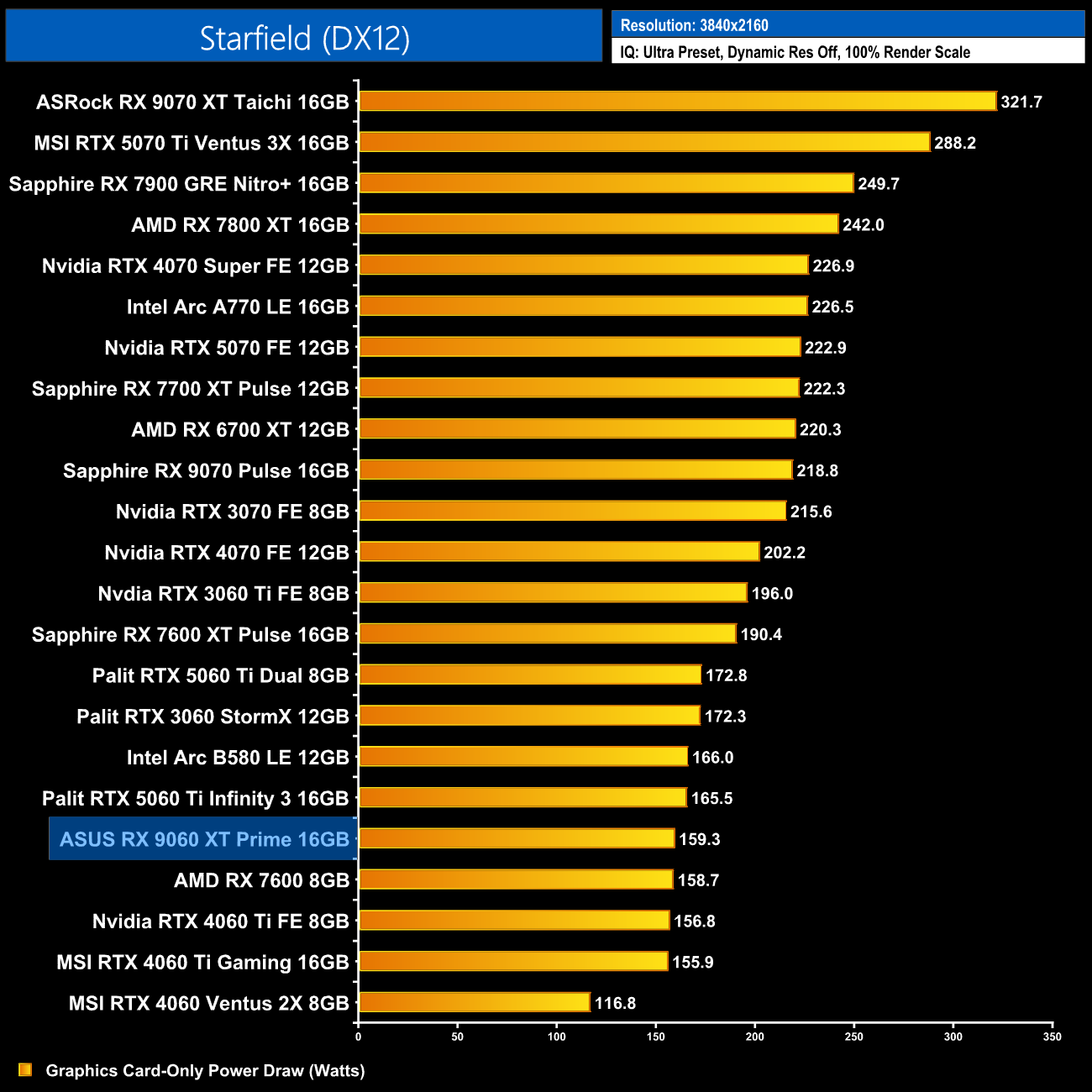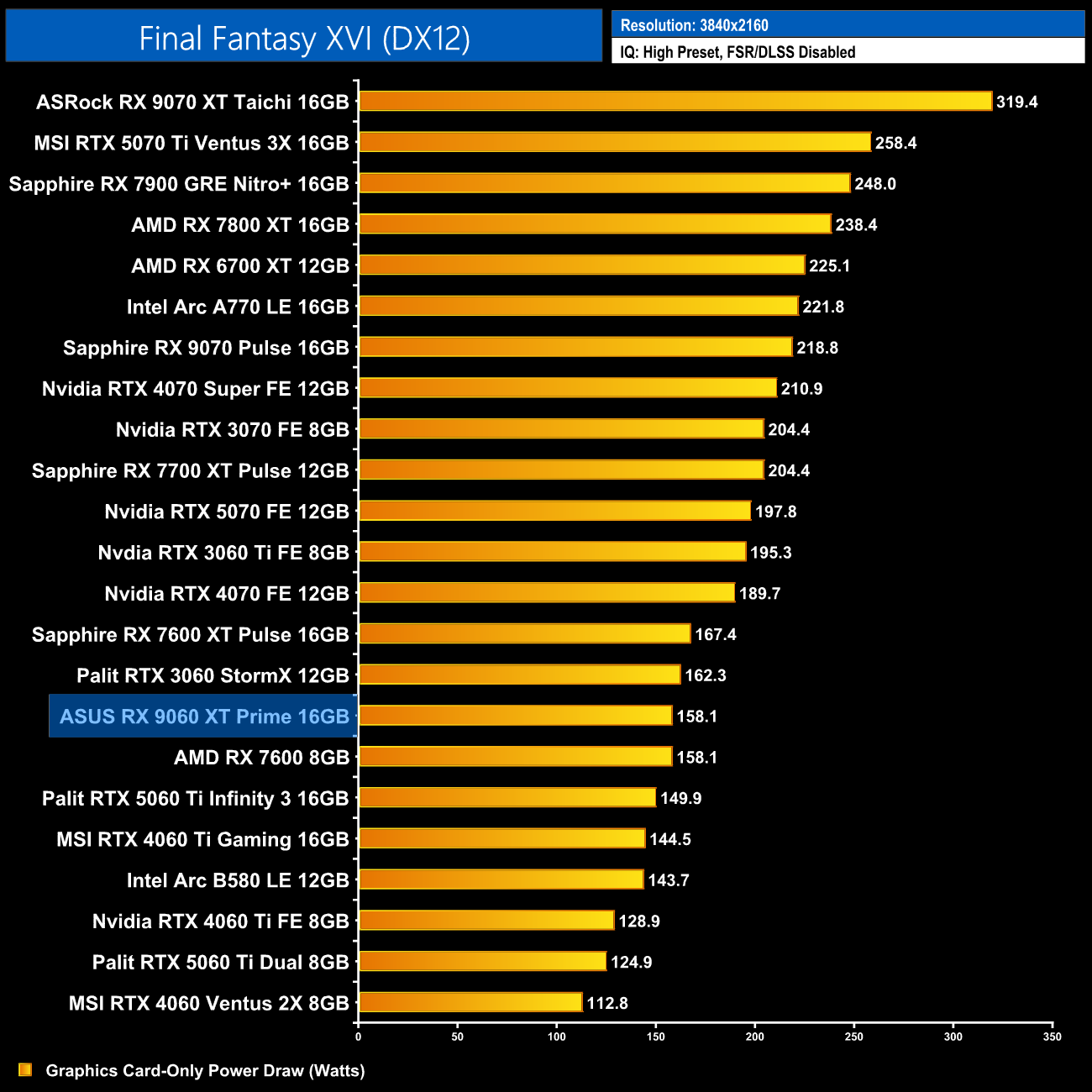 We also test at 4K, but I don't think that's a realistic scenario for this GPU – but power is now slightly below the 5060 Ti 16GB.