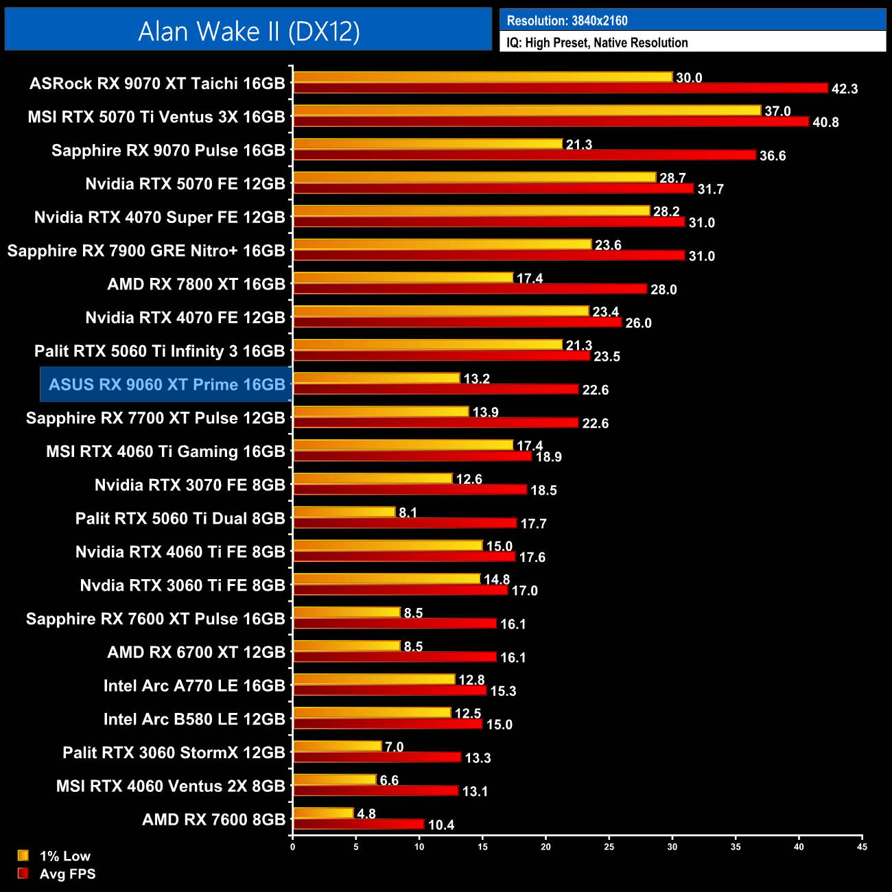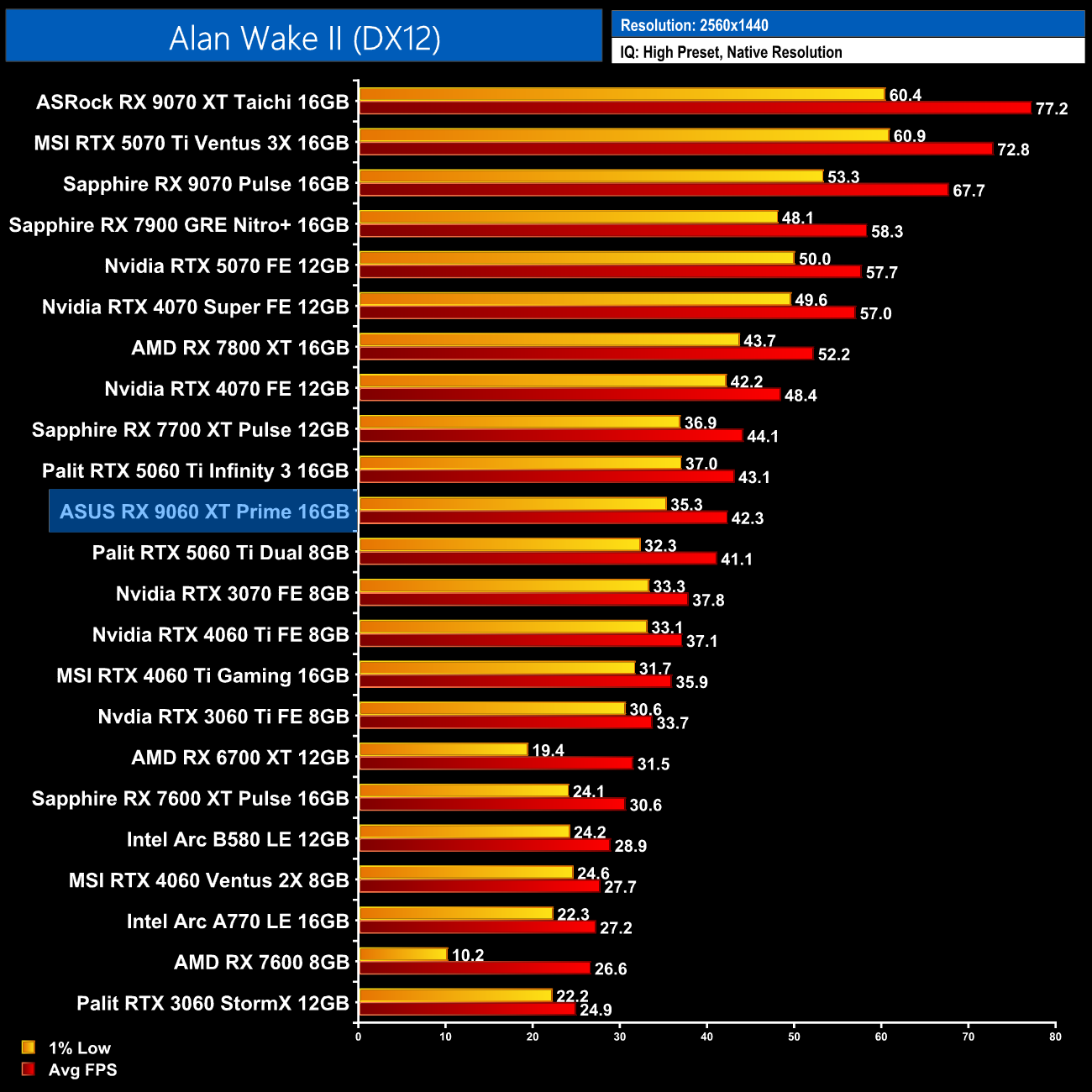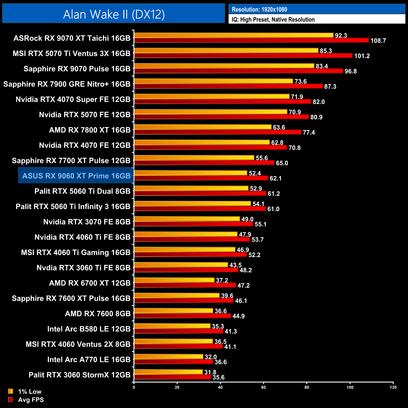 Kicking off with Alan Wake 2, at 1080p the RX 9060 XT 16GB is dead-level with both RTX 5060 Ti models, all three GPUs hit just over 60fps using the High preset, while AMD's newest GPU is just 5% slower than the RX 7700 XT.