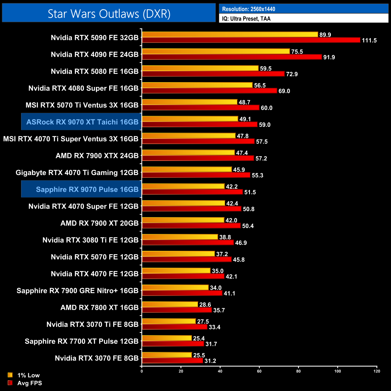 Star Wars Outlaws is a more surprising positive note for RDNA 4, though. The 9070's performance is a hair ahead of the 7900 XT at 1440p, while it's no less than 12% faster than the 5070 – not bad going considering this game uses ray tracing as a fundamental part of its engine.