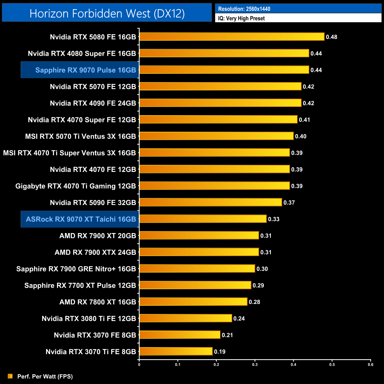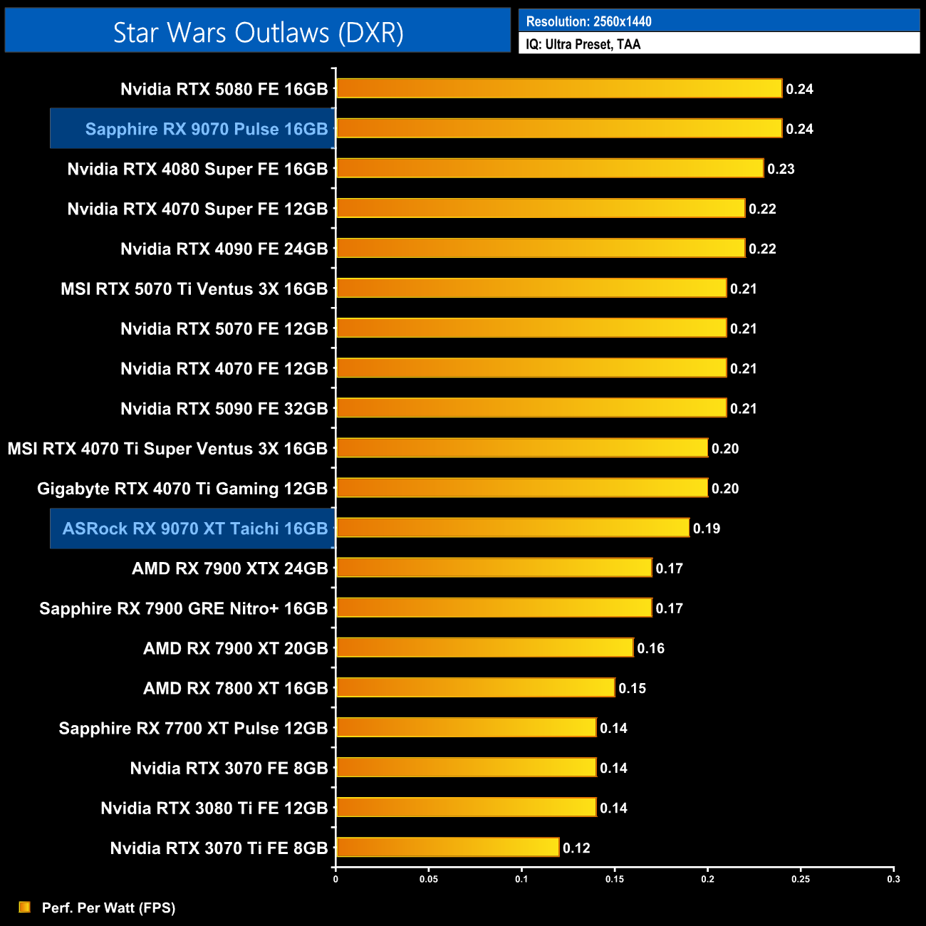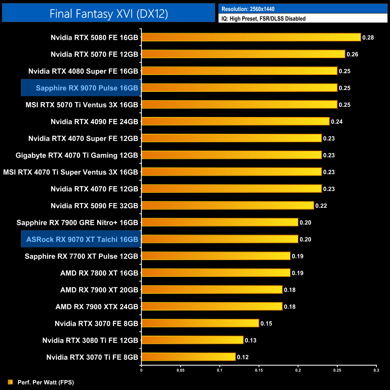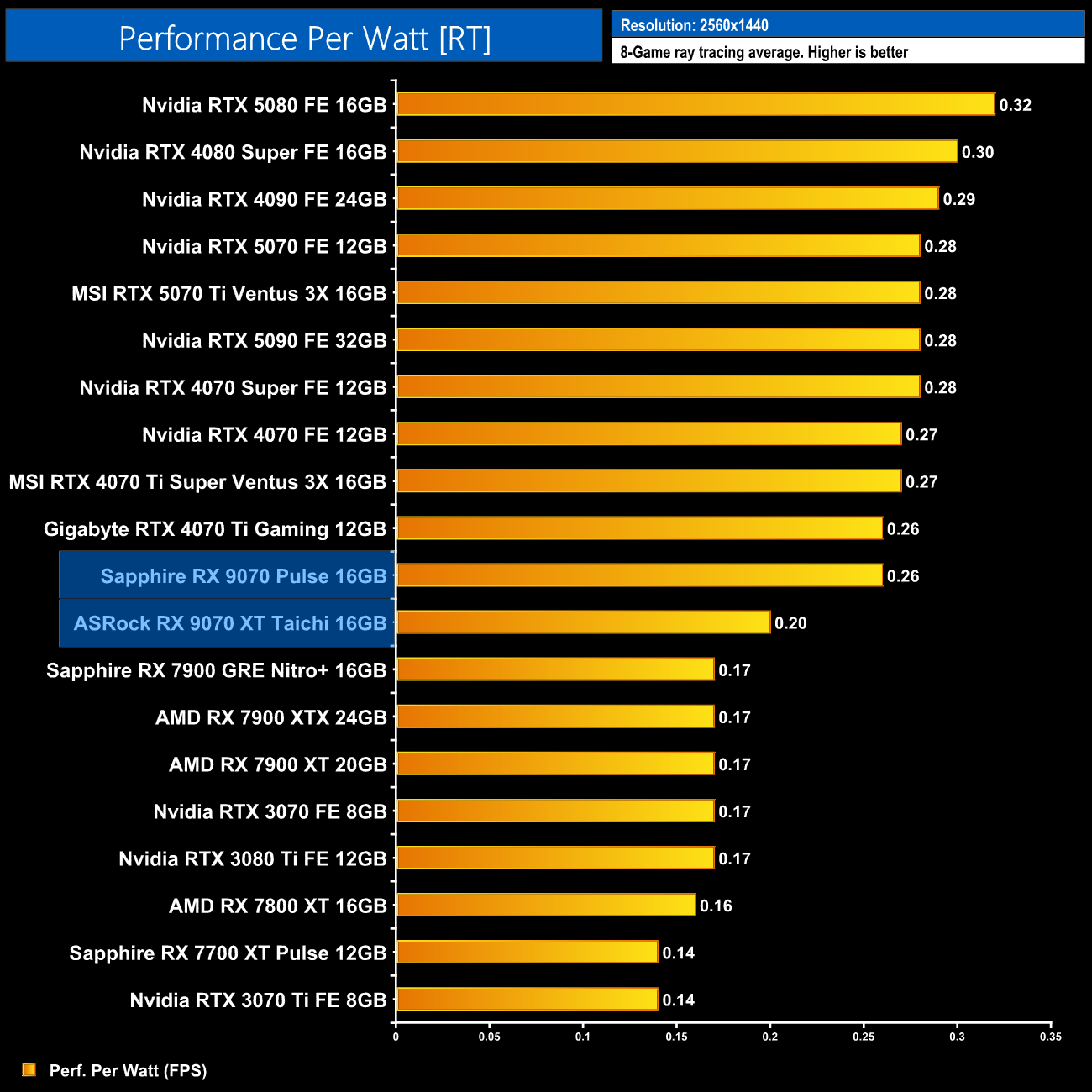 At 1440p, efficiency for the 9070 is best in class, and only fractionally behind the RTX 5080. This means AMD's GPU leads the RTX 5070 by 8% when it comes to performance per watt. It also works out as a 37% improvement over the RX 7900 GRE, which was one of RDNA 3's most efficient GPUs.