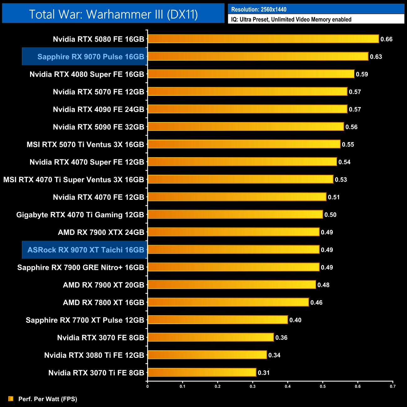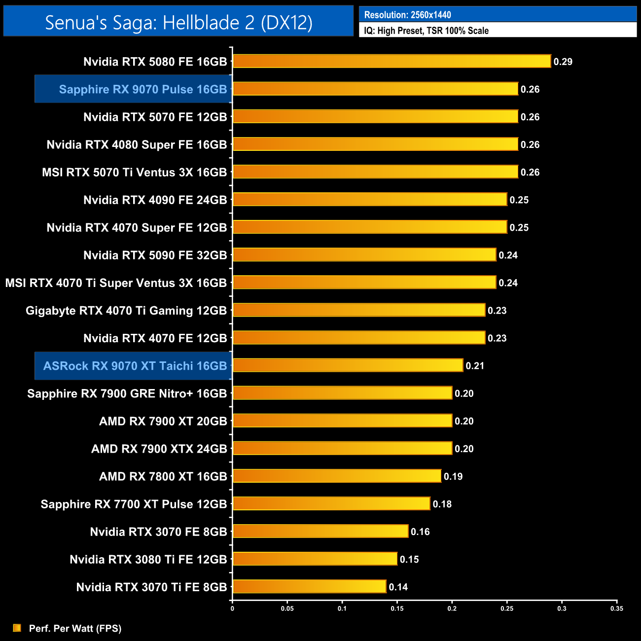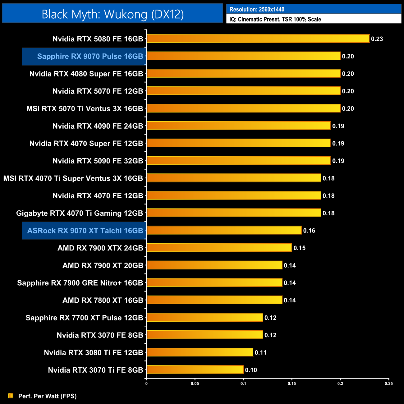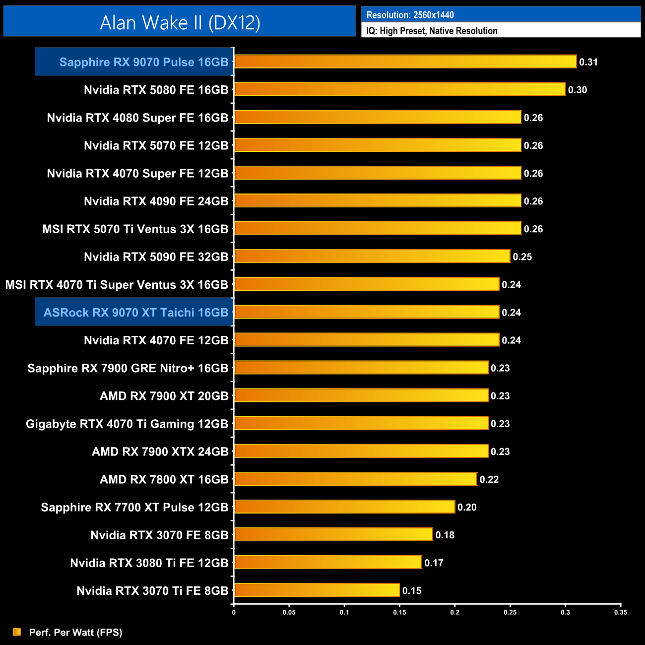 At 1440p, efficiency for the 9070 is best in class, and only fractionally behind the RTX 5080. This means AMD's GPU leads the RTX 5070 by 8% when it comes to performance per watt. It also works out as a 37% improvement over the RX 7900 GRE, which was one of RDNA 3's most efficient GPUs.