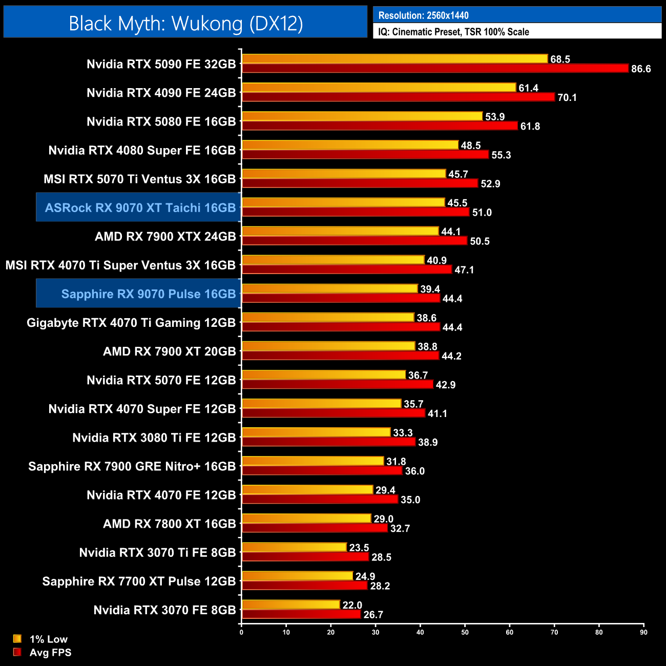 In Black Myth: Wukong, the RX 9070 is bang in line with the RX 7900 XT and RTX 4070 Ti at 1440p, resulting in a much closer showing versus the RTX 5070, given the RDNA 4 GPU is just 4% faster.