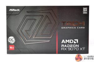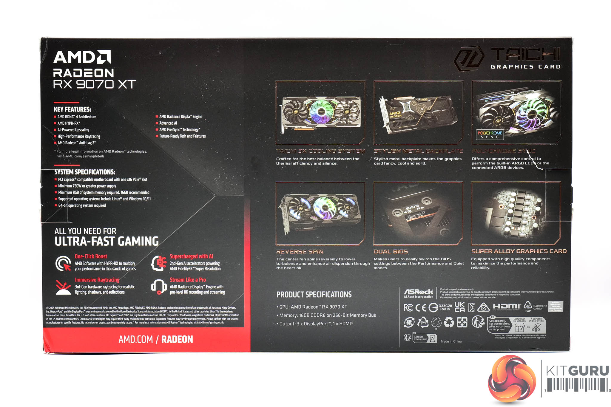 The ASRock RX 9070 XT Taichi ships in a dark box, with only the Taichi and AMD logos on the front. On the back, ASRock highlights various key features of the graphics card itself.
