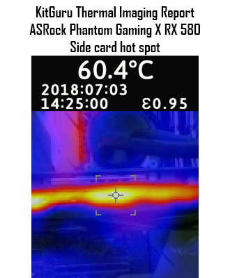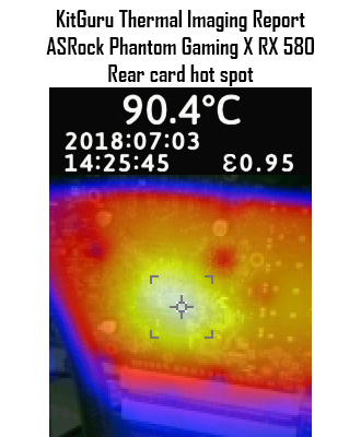 Moving onto the thermal gun testing, here we can see the consequences of ASRock not opting for a backplate. Their explanation was that no backplate allows for better heat dissipation, but it also means there is a noticeable hotspot right behind the GPU core, which we saw peak at 90.4C during the 3DMark stress test.
