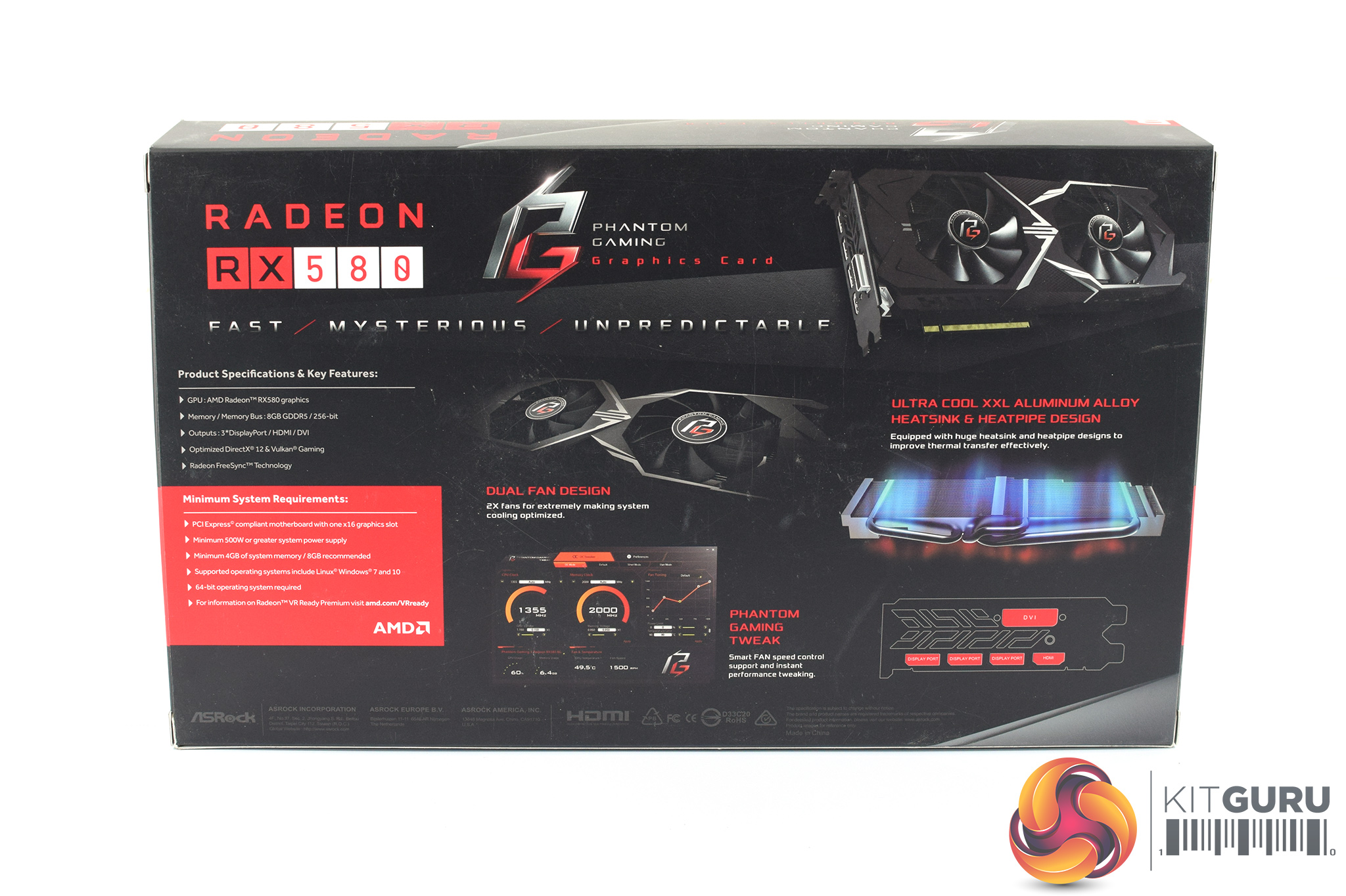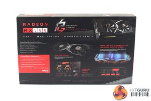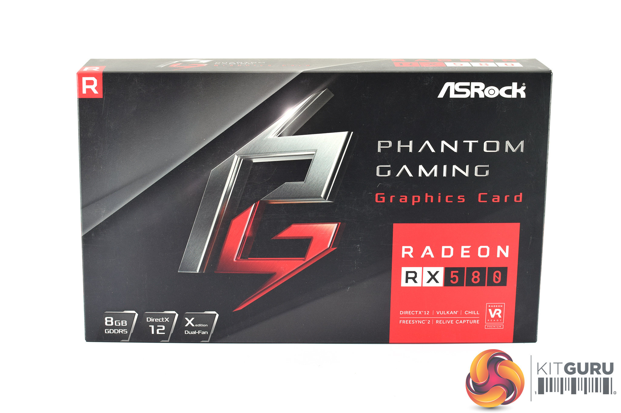 The ASRock Phantom Gaming X RX 580 ships in a black box with some silver and red accenting. The Phantom Gaming logo is emblazoned in the middle of the box, with the Radeon RX 580 branding in the bottom right-hand corner.