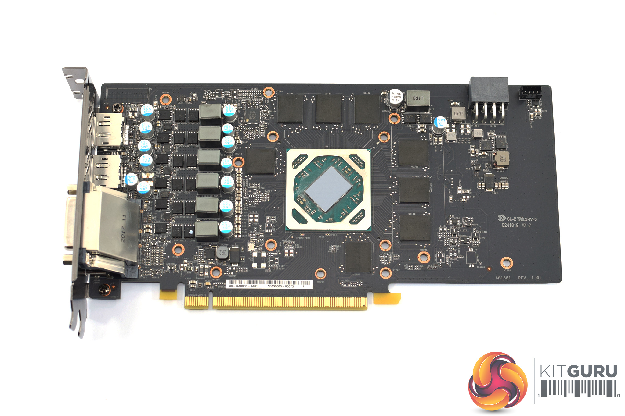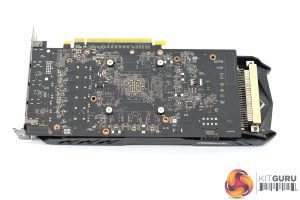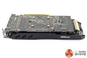 The PCB itself is relatively short – the heatsink overhangs it by about 4.5cm – and the 6 power phases for the GPU, as well as the single power phase for the memory, are immediately evident.