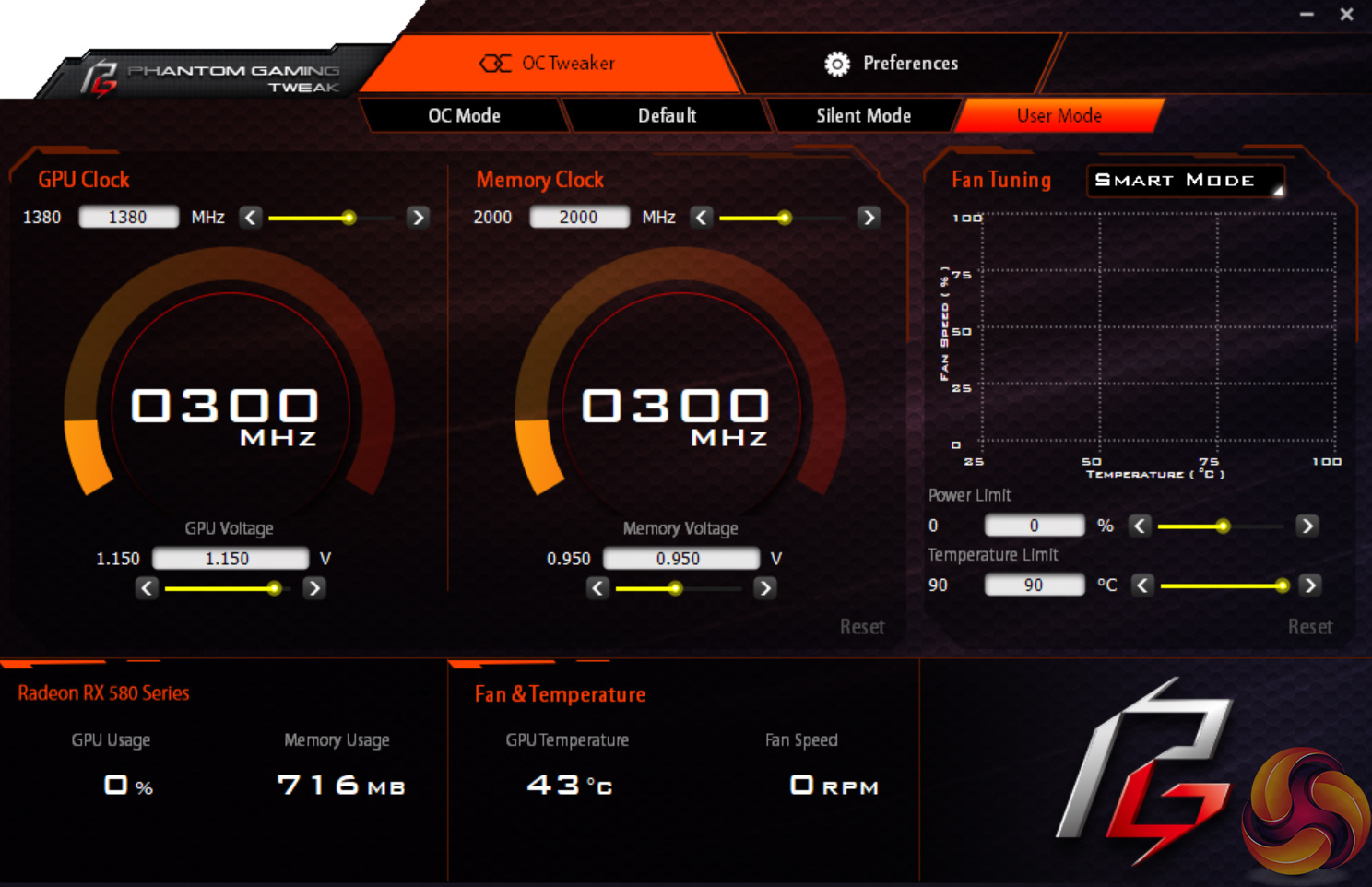 The ASRock Phantom Gaming X RX 580 comes with its own GPU tweak tool, with three ‘one-click' profiles available. We tested using the ‘OC Mode' which bumps the core up to 1408MHz, a +28MHz boost over stock.