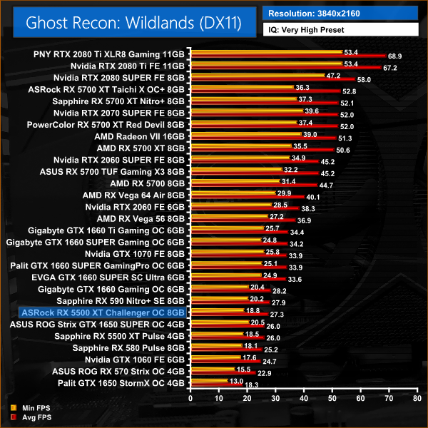 Moving onto Ghost Recon Wildlands, here things swing back in Nvidia's favour, with the 1650 SUPER proving almost 4FPS faster at 1080p.