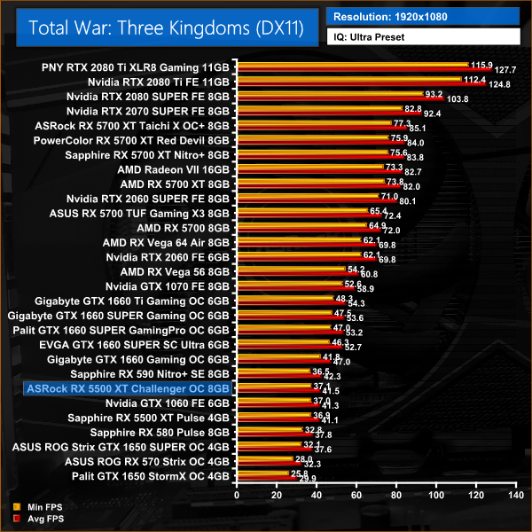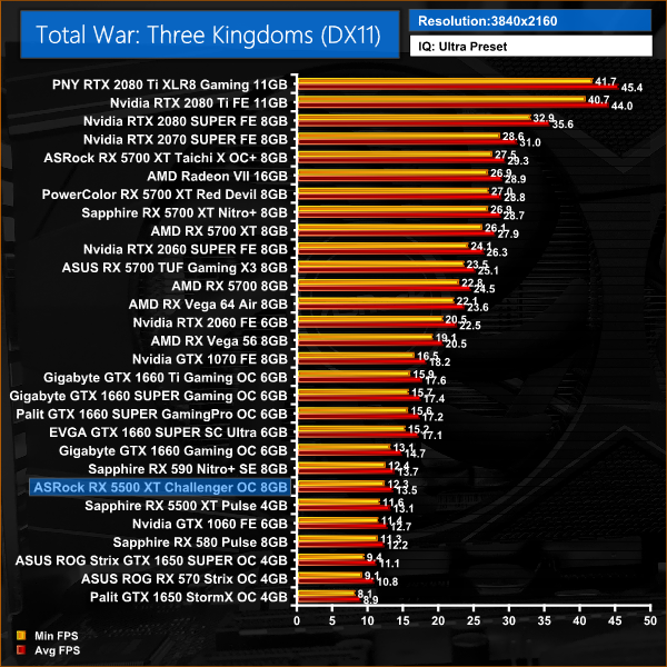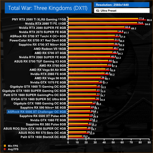 Testing ends on a positive note in Total War: Three Kingdoms, with a very healthy 10% performance advantage for the 5500 XT 8GB over the 1650 SUPER.